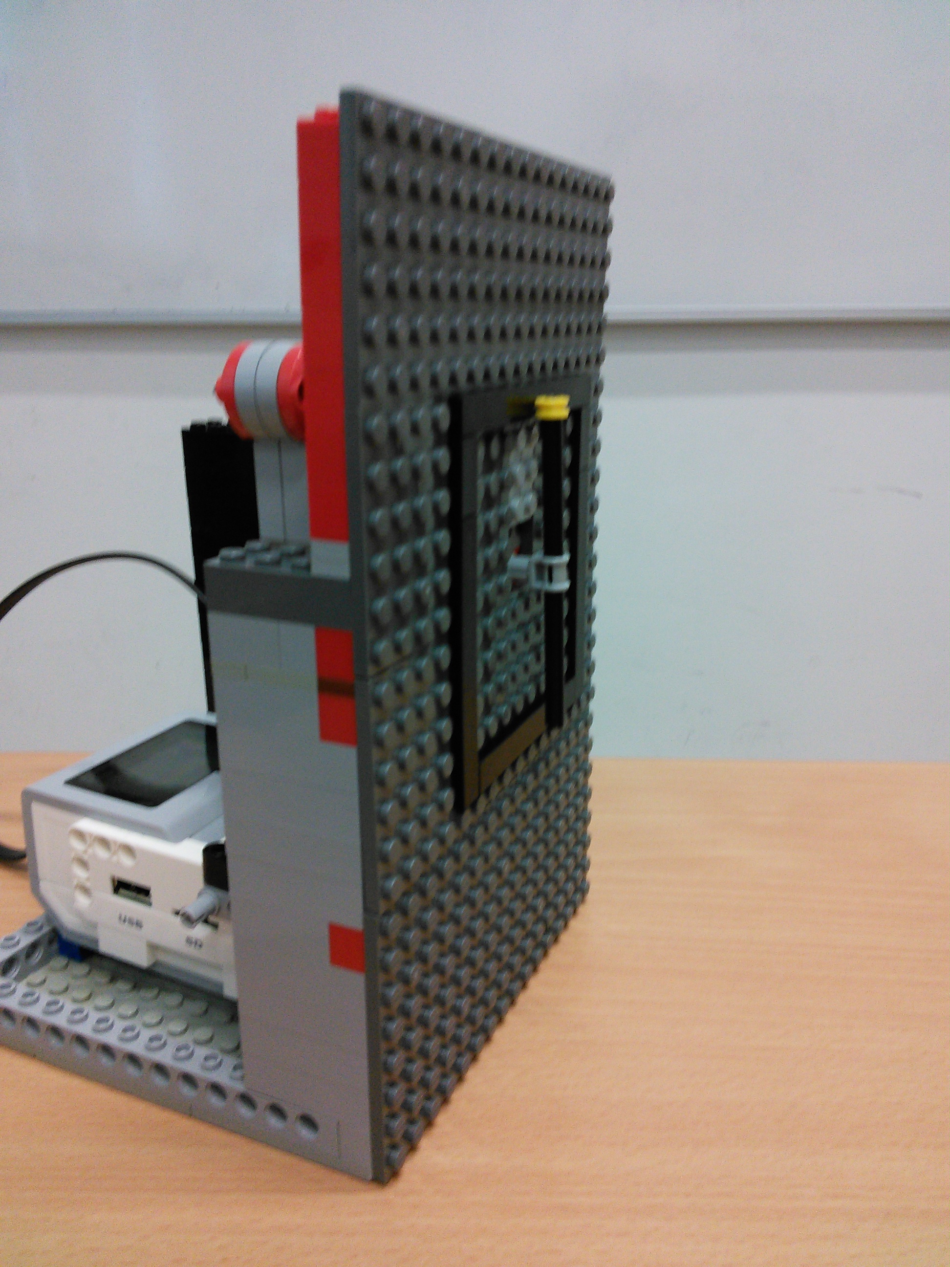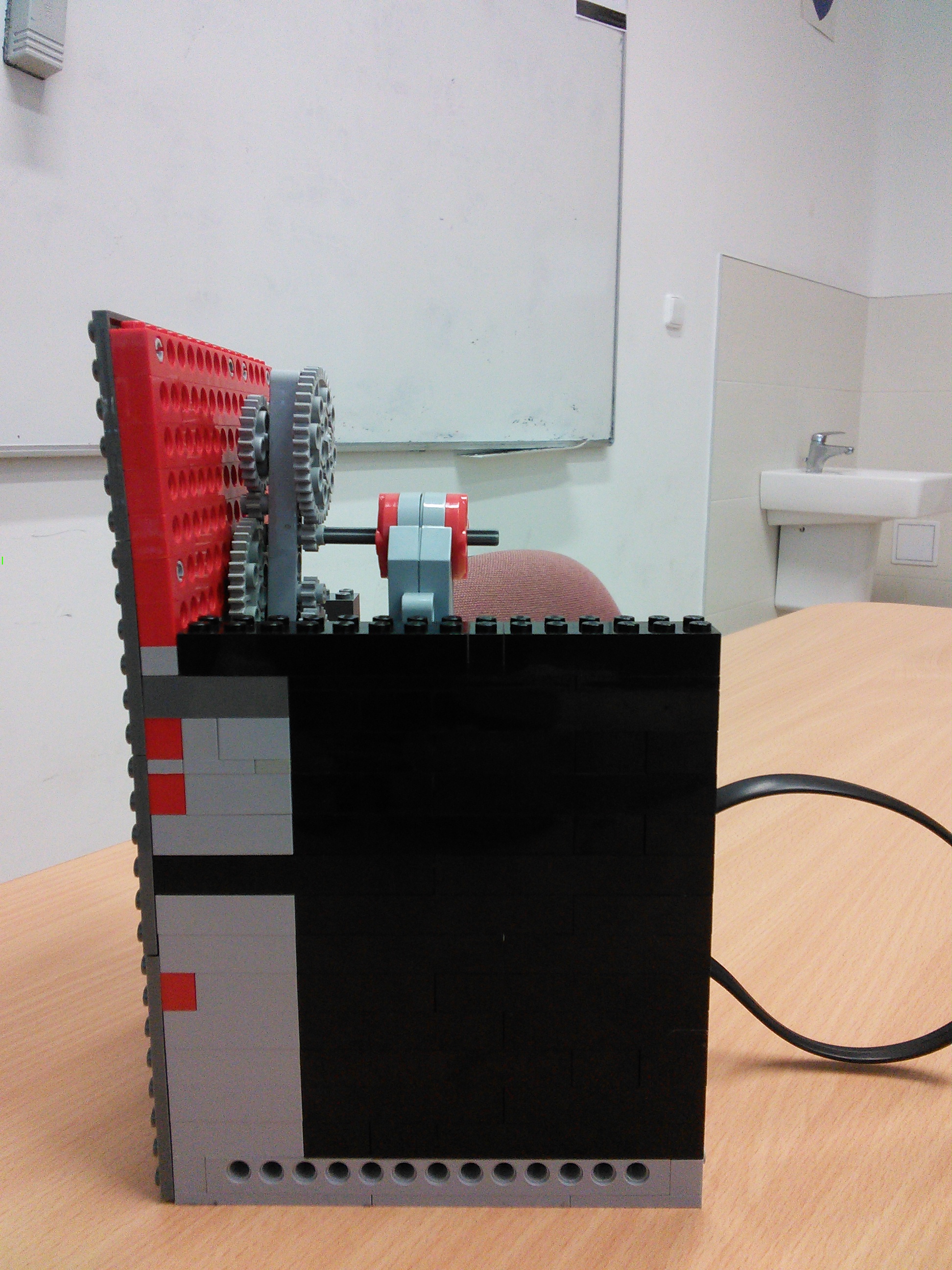 Riešenie 5.kolo Letná liga: Minútová ručička Meraním sme zistili tento vzťah pre large motor: ° /s = power * 10 Pre medium motor: ° /s = power * 16 Zistili sme, že z ozubených koliesok sa dajú urobiť len tieto jednoduché pomery prevodov, lebo len niektoré sedia na vzdialenosť dierok, inak by sme museli urobiť špeciálnu konštrukciu: rovnaké s rovnakým = 1:1 8:24=12:36 = 1:3 8:40 = 1:5 24:40=12:20 = 3:5 20:36 = 5:9 Dvojité sú tieto: 1:1 1:5 3:5 5:9 1:9 1:25 25:81 9:25 1:15 5:27 3:25 1:9 1:3 Samozrejme sa dajú aj opačné! Prevod sme urobili tak, že sme dali dvojice koliesok 8 a 40, 8 a 40, 24 a 40. Keď pomer prevodu spočítame vyjde nám (1/5) * (1/5) * (1/3) = 3/125 = 41,67 Ručička sa musí pohybovať rýchlosťou 360°/60s. Motor sa musí pohybovať 15 000°/60s = 250°/s. Keď to dosadíme do vzorca vyjde nám, že motor sa musí pohybovať rýchlosťou 25 power. Keď sme vyskúšali ručičku sme zistili, že je to dosť nepresné. Keďže sme pokusmi zistili, že power musí byť 24,6 a power musí byť celé čislo, museli sme to urobiť tak, že dve pätiny otočenia, ktorú má motor prejsť za sekundu ide power 24 a tri pätiny ide 25. Keď sme urobili viac pokusov vyšla nám odchýlka asi 0,01s/60s = 0,016 %. Hodiny sme urobili v prevedení veže.