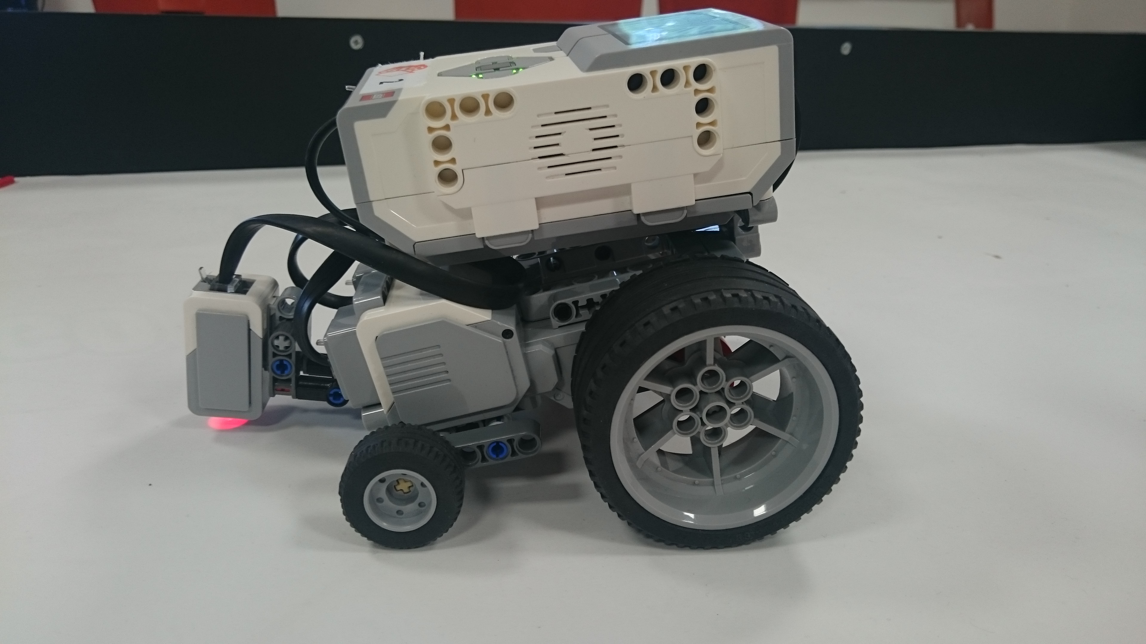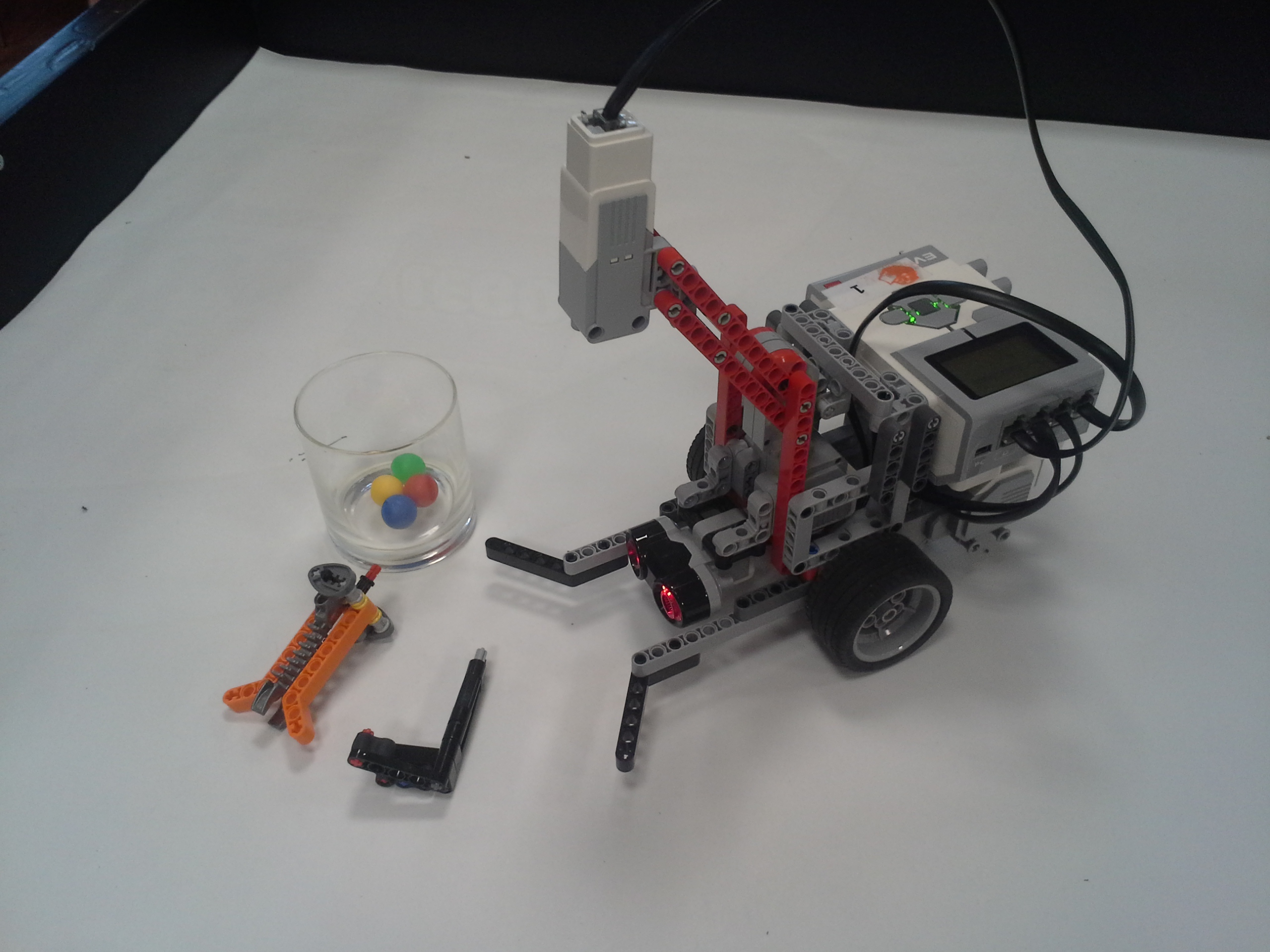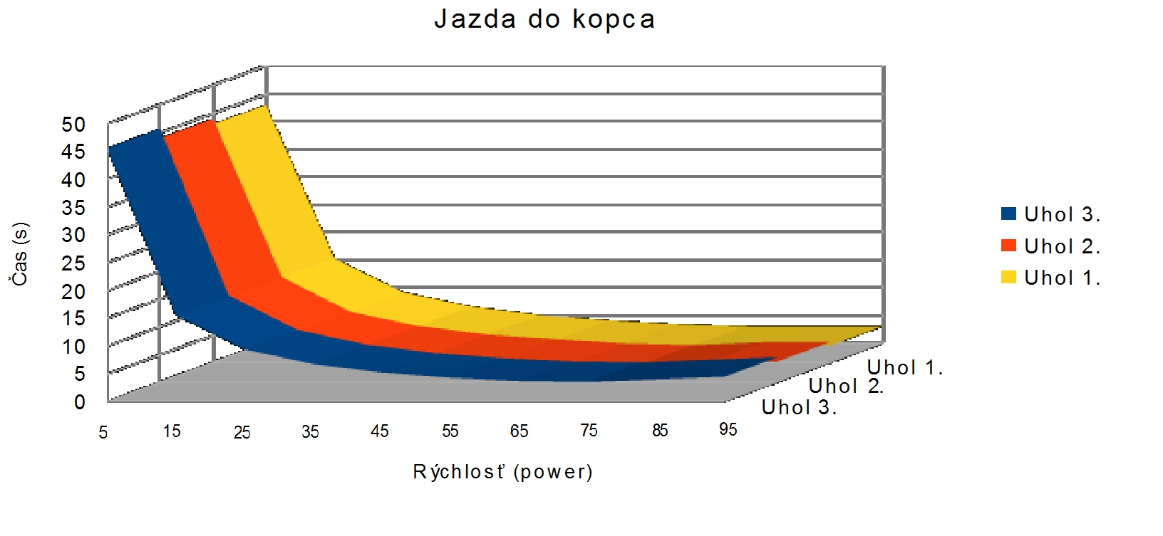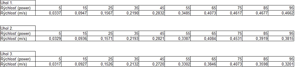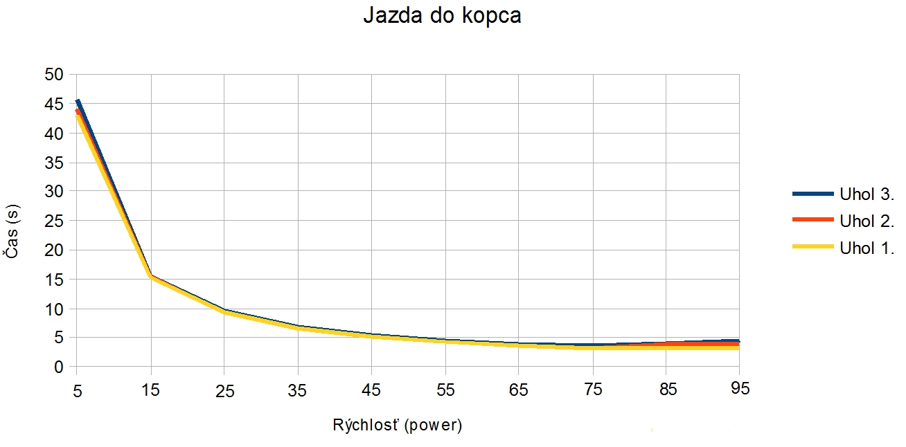 ULOHA 1. Robot: Robot má pohyblivé rameno s malým motorom na konci, na ktorý sa pripájajú nástavce. V Možnosti A má na konci ramena menšie klepeto, ktorého jedna polovica je pevná a druhá sa otáča a postupne prejde po celej ploche dna pohára, čím chytí guličku. A v Možnosti B je koniec ramena spravený tak, že keď je pritlačený na guličku, tak sa jeho strany roztiahnu a zase stiahnu čím guličku uchopí. Program: Najprv si robot zarovná rameno. V oboch možnostiach je použitý ten istý MyBlock na vyhľadanie poháru. Robot sa najprv otáča na mieste a zaznamenáva vzdialenosť predmetov okolo neho, potom vyhodnotí ktorý predmet je najbližšie, otočí sa naň, zapíše o koľko stupňov sa otočil a ide za ním (a vďaka tomu mu môžeme pohár položiť kamkoľvek a on ho nájde, ak k nemu samozrejme nieje niečo bližšie). Keď pohár uvidí cca 13cm pred sebou zastaví a zapíše si koľko prešiel. Potom sa už programy líšia. V Možnosti A robot vloží rameno do pohára, prejde ním po celej ploche dna pohára a chytí guličku. V Možnosti B po vložení ramena do pohára ním otočí o 360° keby bola gulička zaseknutá niekde na kraji, potom rameno do pohára niekoľko-krát vloží vytiahne a otočí, to pretože oranžové časti na stranách ramena guličku zarovnajú do stredu iba z určitej časti pohára. Na konci oboch programov sa robot vráti na pôvodné miesto a otočí sa presne do toho uhlu v ktorom bol spustený za pomoci zapísaných údajov. ULOHA 2 Robot - Náš robot je typické "autíčko", má veľké zadné kolesá a dosť veľký sklon dopredu, aby sa počas jazdy do kopca neprevrátil dozadu. Program - Robotovi na začiatku programu nastavíme akou rýchlosťou pôjde, vybrali sme si čísla 5,15,25,35,... pretože najnižšia rýchlosť ktorou dokázal prejsť aj najstrmší kopec bola 4 (power). Potom prejde po naklonenej rovine dlhej 145cm. Priemer časov za ktorý ju prešiel (v danom uhle, s danou rýchlosťou) sme si zapísali do tabuľky. Čas sme najprv stopovali ručne, ale potom sme prešli na spôsob, že si robot čas meria sám, zistili sme, že časi čo nameral robot a čo sme namerali my boli skoro rovnaké, a preto sme nemuseli v tabuľke nič meniť. Grafy z jednotlivých uhlov (naklonení stola) sme spojili do jedného grafu, a všimli sme si 2 veci: 1) Robotovi sa od rýchlosti 80 (power) už nezvyšovala rýchlosť. 2) Sklon stola nemal veľký vplyv na rýchlosť robota, najväščí rozdiel rýchlostí bol pri najväščom sklone pri navyšších rýchlostiach (vtedy už mierne spomaloval). Na koniec sme si spravili ešte tabuľky skutočných rýchlostí, teda premeny jednotlivých rýchlostí (power) na skutočnú rýchlosť v m/s počas jednotlivých uhlov sklonu stola. Testovali sme aj pridanie závaží na robota, ale kvôli tomu, že náš robot má väčšinu váhy nad zadnými kolesami a dobre uložené ťažisko nemala zmena jeho váhy takmer žiadny vplyv na jeho rýchlosť.