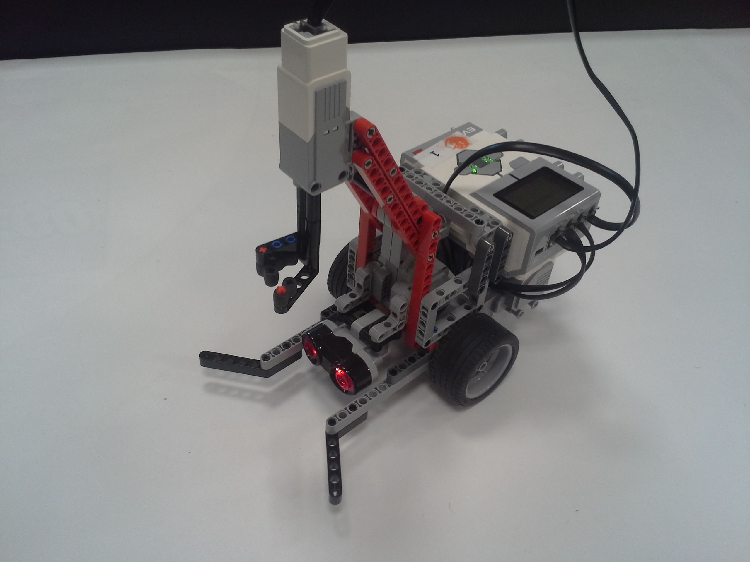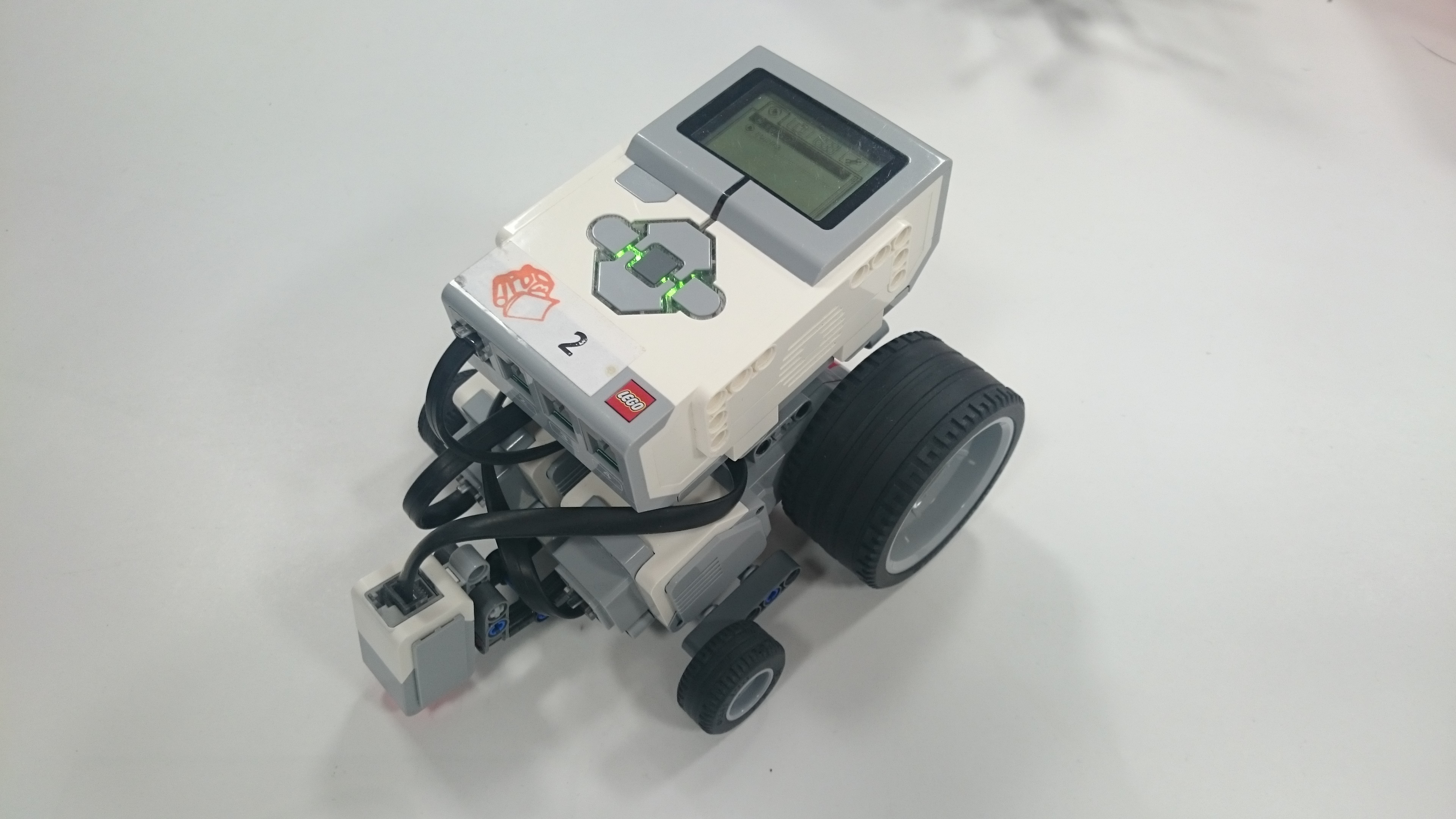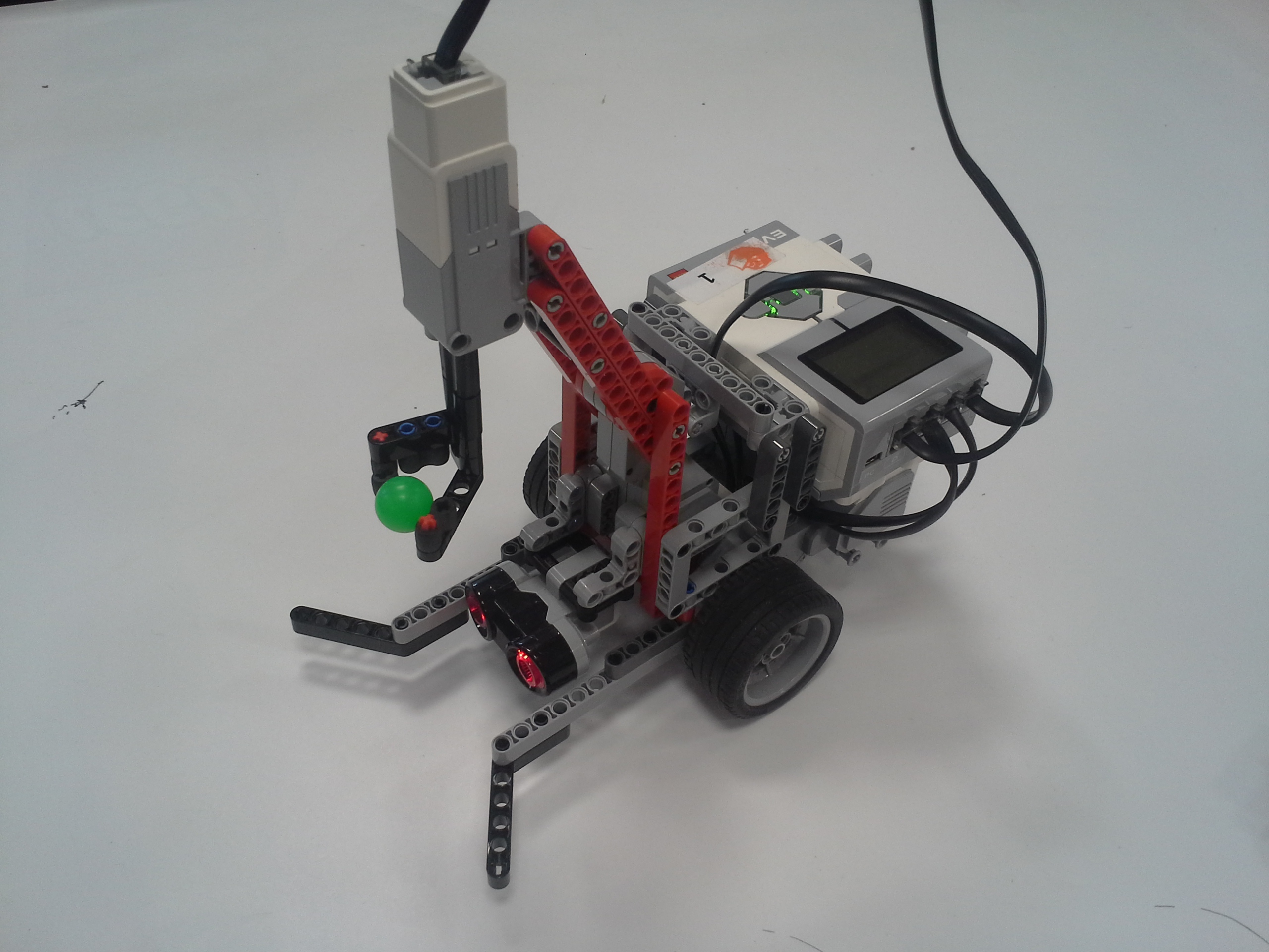 ULOHA 1. Robot: Robot má pohyblivé rameno s malým motorom na konci, na ktorý sa pripájajú nástavce. V Možnosti A má na konci ramena menšie klepeto, ktorého jedna polovica je pevná a druhá sa otáča a postupne prejde po celej ploche dna pohára, čím chytí guličku. A v Možnosti B je koniec ramena spravený tak, že keď je pritlačený na guličku, tak sa jeho strany roztiahnu a zase stiahnu čím guličku uchopí. Program: Najprv si robot zarovná rameno. V oboch možnostiach je použitý ten istý MyBlock na vyhľadanie poháru. Robot sa najprv otáča na mieste a zaznamenáva vzdialenosť predmetov okolo neho, potom vyhodnotí ktorý predmet je najbližšie, otočí sa naň, zapíše o koľko stupňov sa otočil a ide za ním (a vďaka tomu mu môžeme pohár položiť kamkoľvek a on ho nájde, ak k nemu samozrejme nieje niečo bližšie). Keď pohár uvidí cca 13cm pred sebou zastaví a zapíše si koľko prešiel. Potom sa už programy líšia. V Možnosti A robot vloží rameno do pohára, prejde ním po celej ploche dna pohára a chytí guličku. V Možnosti B po vložení ramena do pohára ním otočí o 360° keby bola gulička zaseknutá niekde na kraji, potom rameno do pohára niekoľko-krát vloží vytiahne a otočí, to pretože oranžové časti na stranách ramena guličku zarovnajú do stredu iba z určitej časti pohára. Na konci oboch programov sa robot vráti na pôvodné miesto a otočí sa presne do toho uhlu v ktorom bol spustený za pomoci zapísaných údajov. ULOHA 2 Robot - Náš robot je typické "autíčko", má veľké zadné kolesá a dosť veľký sklon dopredu, aby sa počas jazdy do kopca neprevrátil dozadu. Program - Robotovi na začiatku programu nastavíme akou rýchlosťou pôjde, vybrali sme si čísla 5,15,25,35,... pretože najnižšia rýchlosť ktorou dokázal prejsť aj najstrmší kopec bola 4 (power). Potom prejde po naklonenej rovine dlhej 145cm. Priemer časov za ktorý ju prešiel (v danom uhle, s danou rýchlosťou) sme si zapísali do tabuľky. Čas sme najprv stopovali ručne, ale potom sme prešli na spôsob, že si robot čas meria sám, zistili sme, že časi čo nameral robot a čo sme namerali my boli skoro rovnaké, a preto sme nemuseli v tabuľke nič meniť. Grafy z jednotlivých uhlov (naklonení stola) sme spojili do jedného grafu, a všimli sme si 2 veci: 1) Robotovi sa od rýchlosti 80 (power) už nezvyšovala rýchlosť. 2) Sklon stola nemal veľký vplyv na rýchlosť robota, najväščí rozdiel rýchlostí bol pri najväščom sklone pri navyšších rýchlostiach (vtedy už mierne spomaloval). Na koniec sme si spravili ešte tabuľky skutočných rýchlostí, teda premeny jednotlivých rýchlostí (power) na skutočnú rýchlosť v m/s počas jednotlivých uhlov sklonu stola. Testovali sme aj pridanie závaží na robota, ale kvôli tomu, že náš robot má väčšinu váhy nad zadnými kolesami a dobre uložené ťažisko nemala zmena jeho váhy takmer žiadny vplyv na jeho rýchlosť.