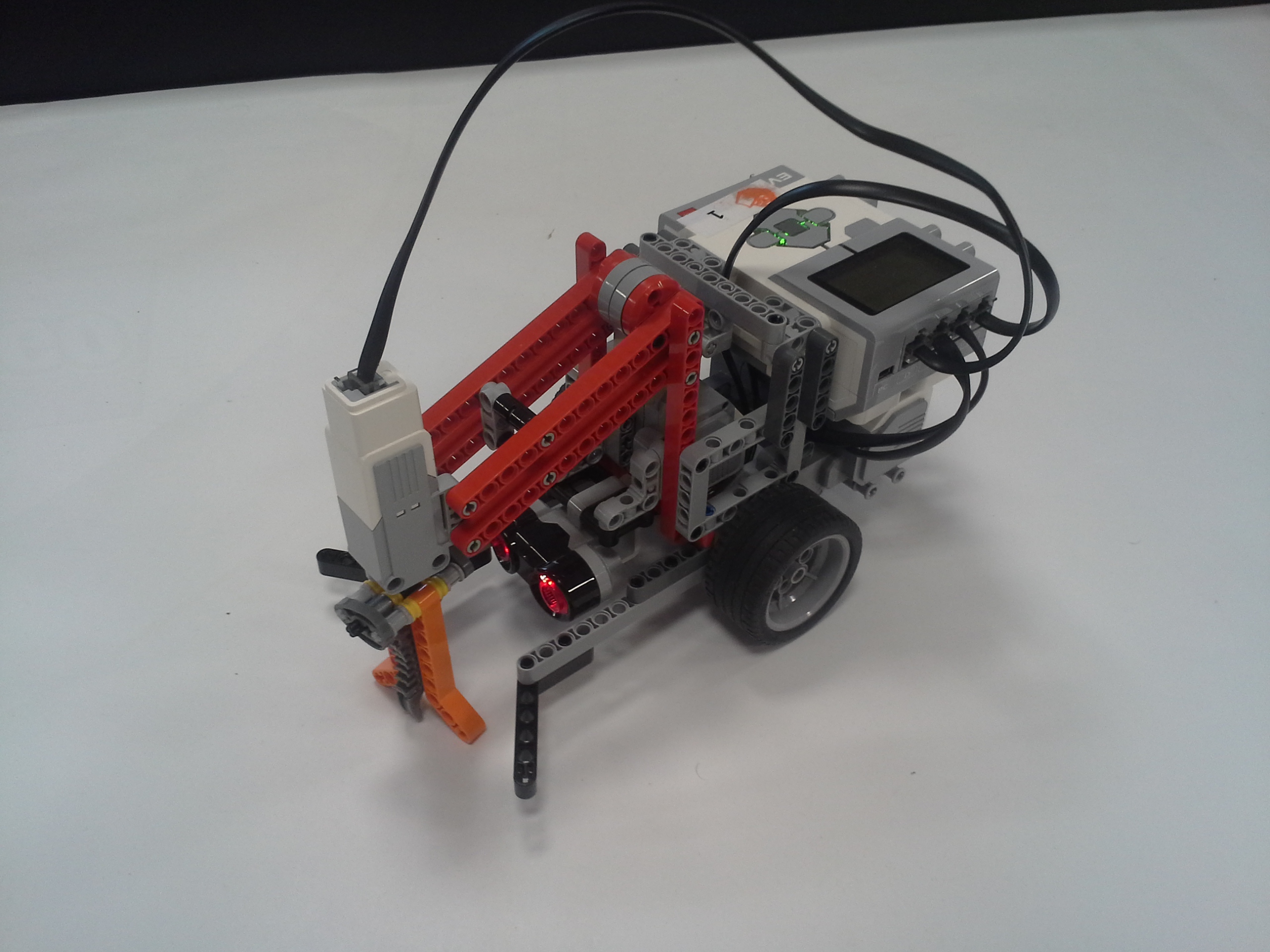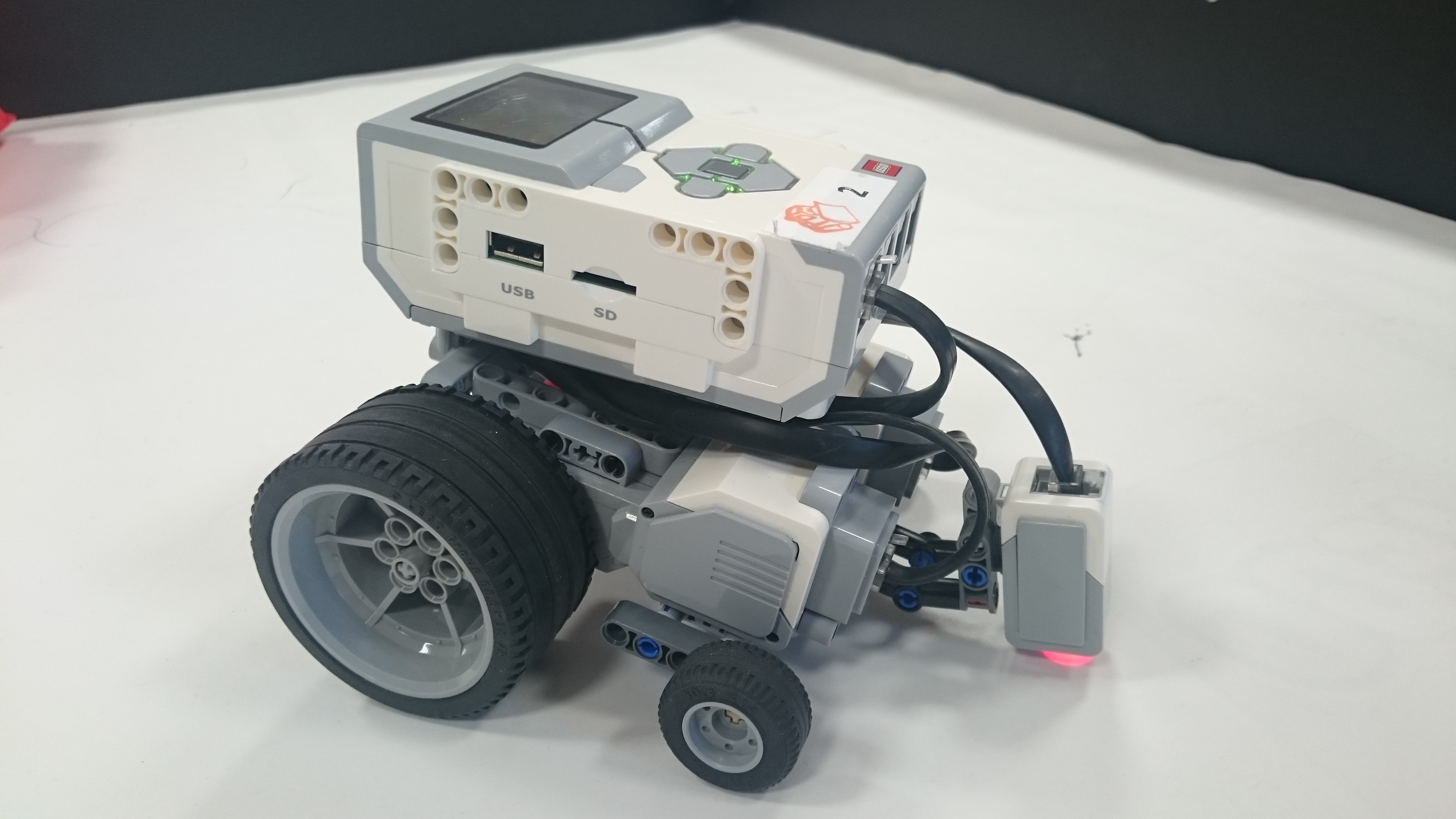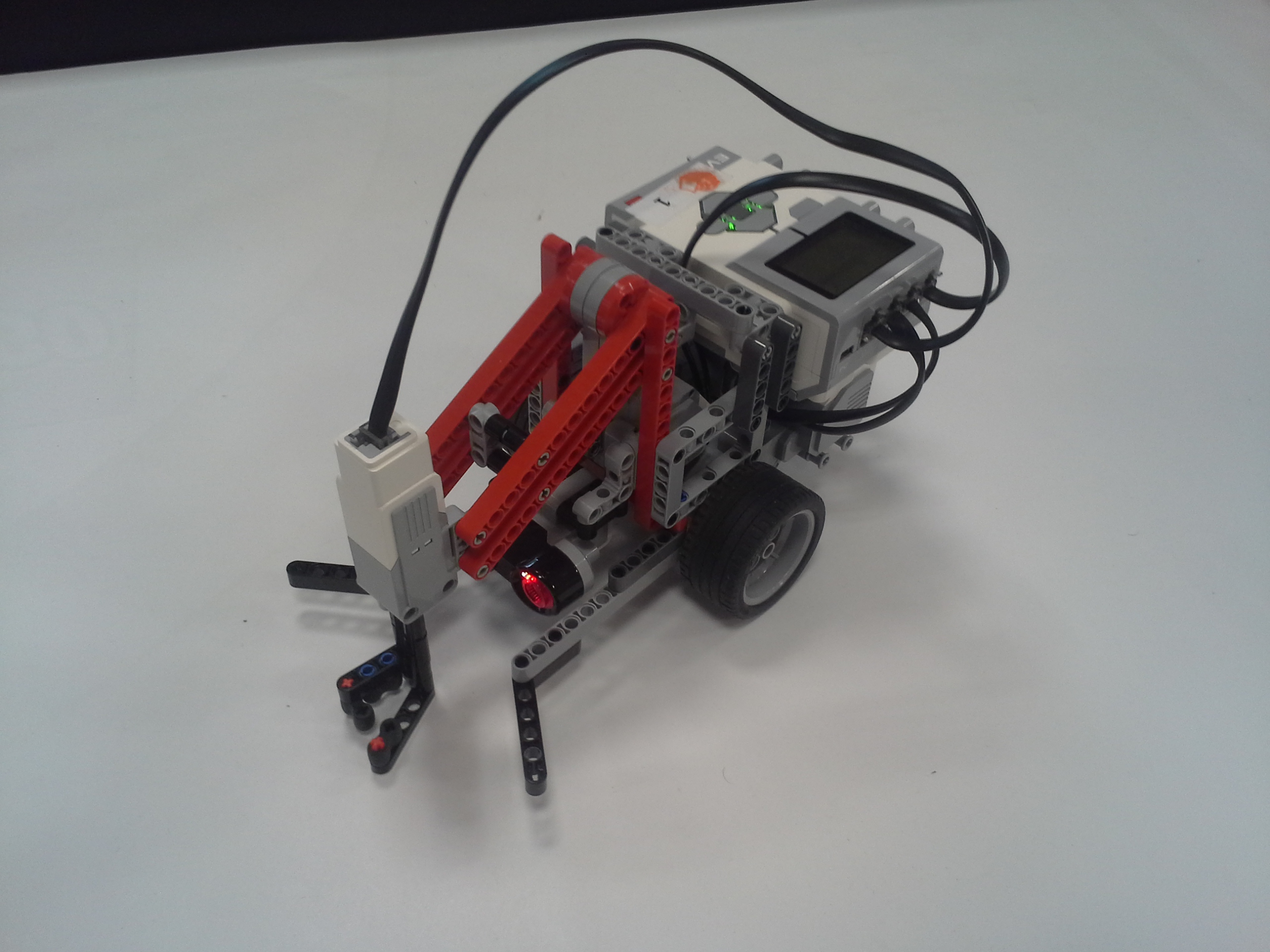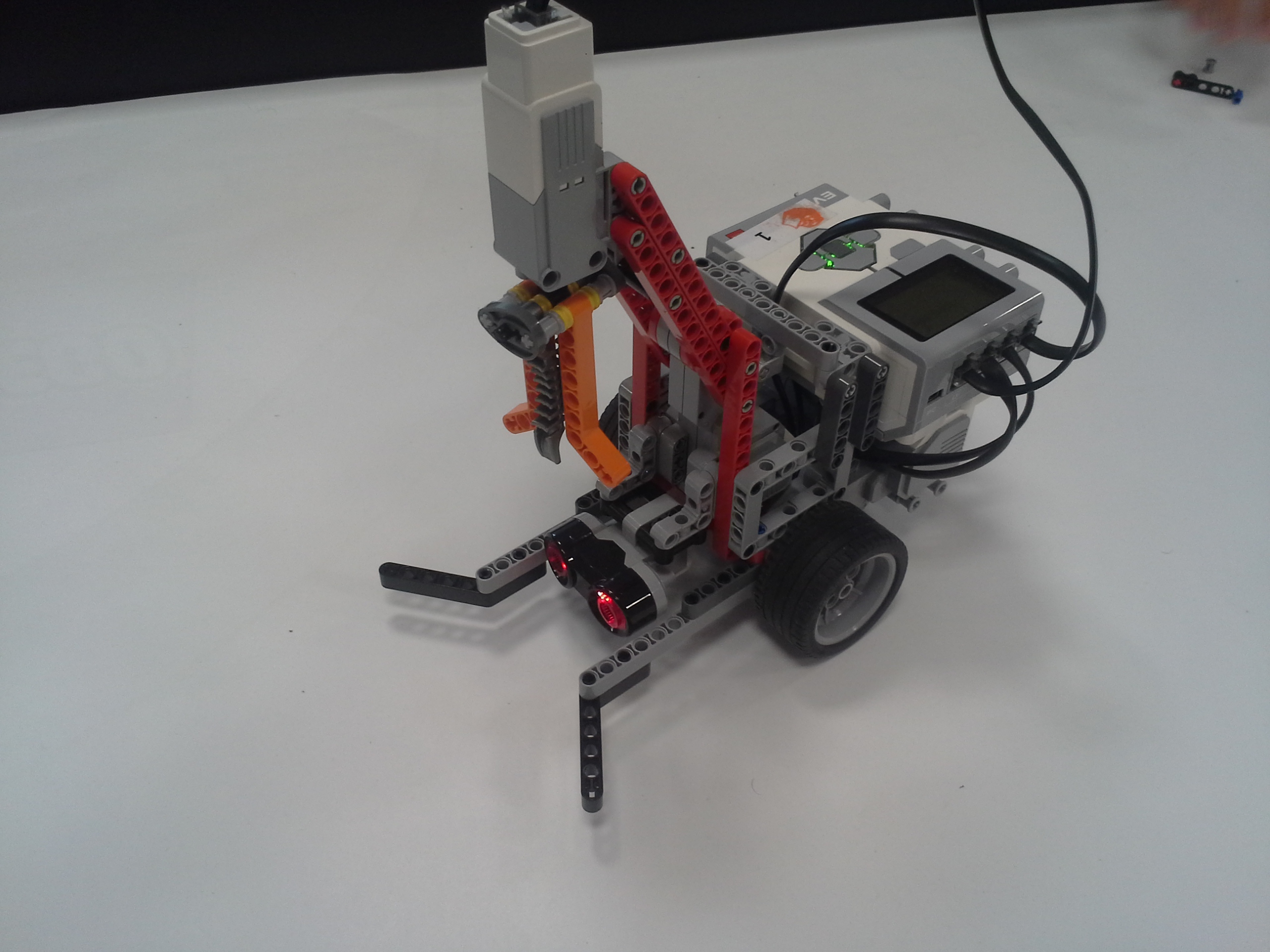 ULOHA 1. Robot: Robot má pohyblivé rameno s malým motorom na konci, na ktorý sa pripájajú nástavce. V Možnosti A má na konci ramena menšie klepeto, ktorého jedna polovica je pevná a druhá sa otáča a postupne prejde po celej ploche dna pohára, čím chytí guličku. A v Možnosti B je koniec ramena spravený tak, že keď je pritlačený na guličku, tak sa jeho strany roztiahnu a zase stiahnu čím guličku uchopí. Program: Najprv si robot zarovná rameno. V oboch možnostiach je použitý ten istý MyBlock na vyhľadanie poháru. Robot sa najprv otáča na mieste a zaznamenáva vzdialenosť predmetov okolo neho, potom vyhodnotí ktorý predmet je najbližšie, otočí sa naň, zapíše o koľko stupňov sa otočil a ide za ním (a vďaka tomu mu môžeme pohár položiť kamkoľvek a on ho nájde, ak k nemu samozrejme nieje niečo bližšie). Keď pohár uvidí cca 13cm pred sebou zastaví a zapíše si koľko prešiel. Potom sa už programy líšia. V Možnosti A robot vloží rameno do pohára, prejde ním po celej ploche dna pohára a chytí guličku. V Možnosti B po vložení ramena do pohára ním otočí o 360° keby bola gulička zaseknutá niekde na kraji, potom rameno do pohára niekoľko-krát vloží vytiahne a otočí, to pretože oranžové časti na stranách ramena guličku zarovnajú do stredu iba z určitej časti pohára. Na konci oboch programov sa robot vráti na pôvodné miesto a otočí sa presne do toho uhlu v ktorom bol spustený za pomoci zapísaných údajov. ULOHA 2 Robot - Náš robot je typické "autíčko", má veľké zadné kolesá a dosť veľký sklon dopredu, aby sa počas jazdy do kopca neprevrátil dozadu. Program - Robotovi na začiatku programu nastavíme akou rýchlosťou pôjde, vybrali sme si čísla 5,15,25,35,... pretože najnižšia rýchlosť ktorou dokázal prejsť aj najstrmší kopec bola 4 (power). Potom prejde po naklonenej rovine dlhej 145cm. Priemer časov za ktorý ju prešiel (v danom uhle, s danou rýchlosťou) sme si zapísali do tabuľky. Čas sme najprv stopovali ručne, ale potom sme prešli na spôsob, že si robot čas meria sám, zistili sme, že časi čo nameral robot a čo sme namerali my boli skoro rovnaké, a preto sme nemuseli v tabuľke nič meniť. Grafy z jednotlivých uhlov (naklonení stola) sme spojili do jedného grafu, a všimli sme si 2 veci: 1) Robotovi sa od rýchlosti 80 (power) už nezvyšovala rýchlosť. 2) Sklon stola nemal veľký vplyv na rýchlosť robota, najväščí rozdiel rýchlostí bol pri najväščom sklone pri navyšších rýchlostiach (vtedy už mierne spomaloval). Na koniec sme si spravili ešte tabuľky skutočných rýchlostí, teda premeny jednotlivých rýchlostí (power) na skutočnú rýchlosť v m/s počas jednotlivých uhlov sklonu stola. Testovali sme aj pridanie závaží na robota, ale kvôli tomu, že náš robot má väčšinu váhy nad zadnými kolesami a dobre uložené ťažisko nemala zmena jeho váhy takmer žiadny vplyv na jeho rýchlosť.