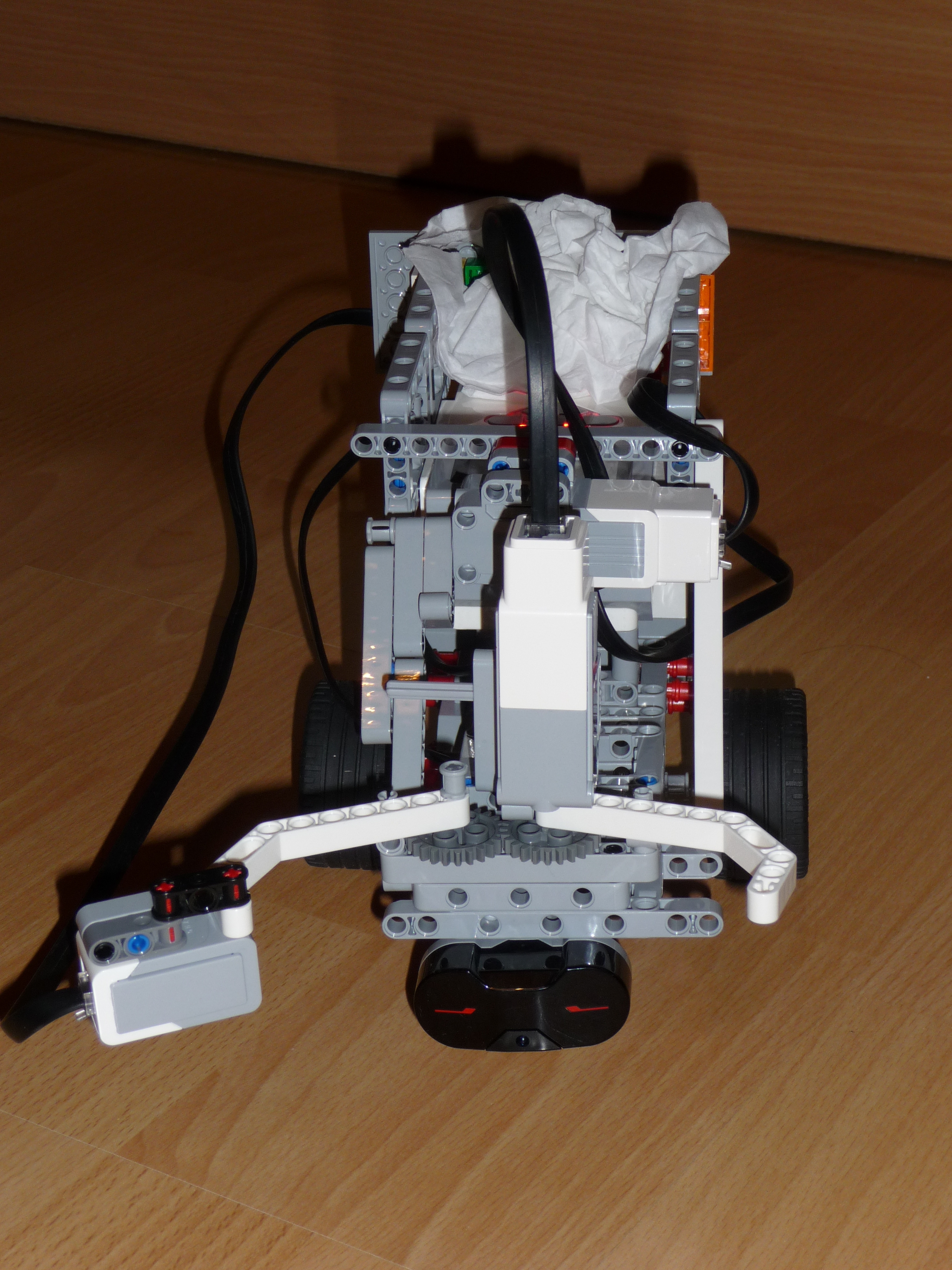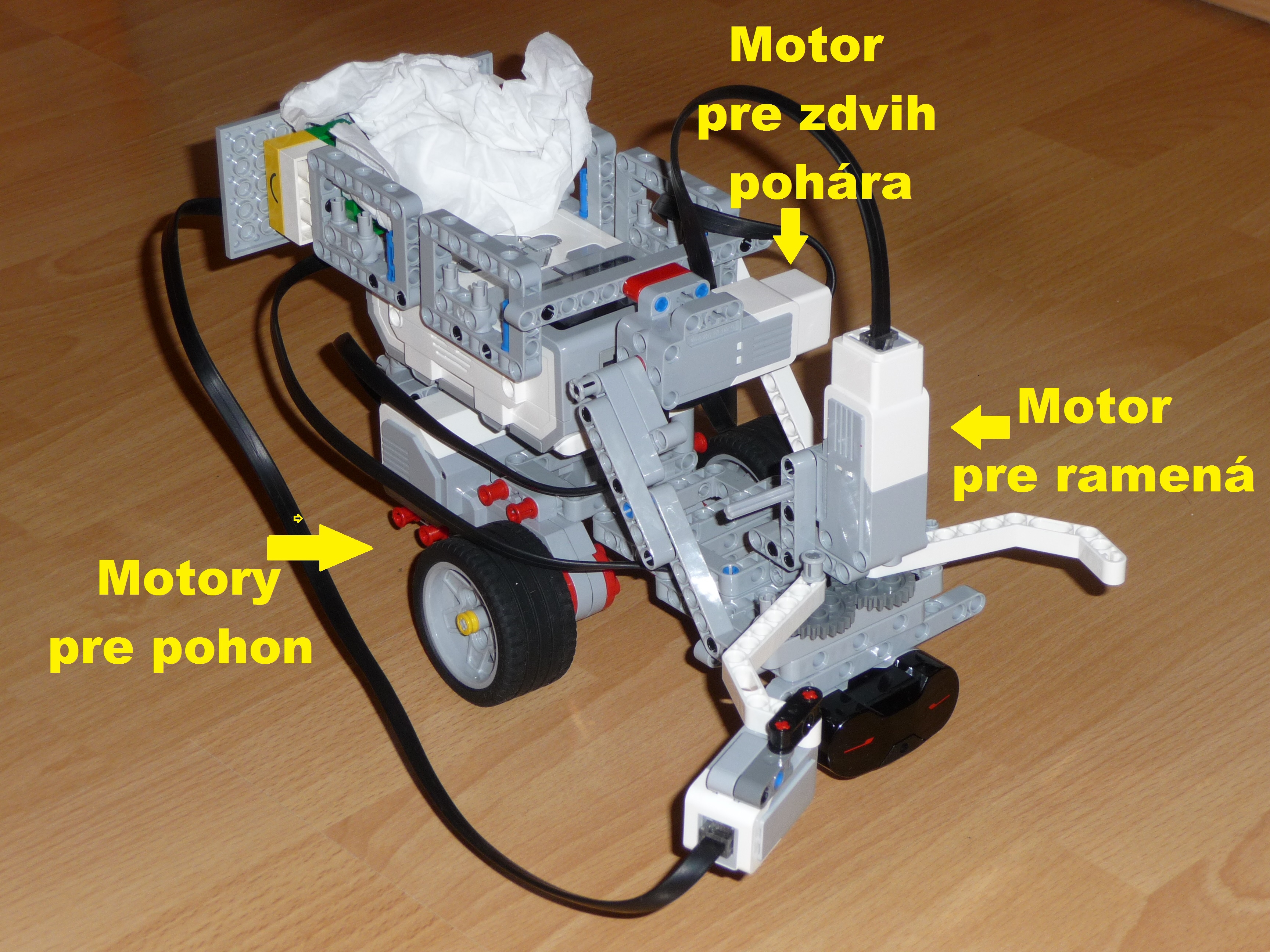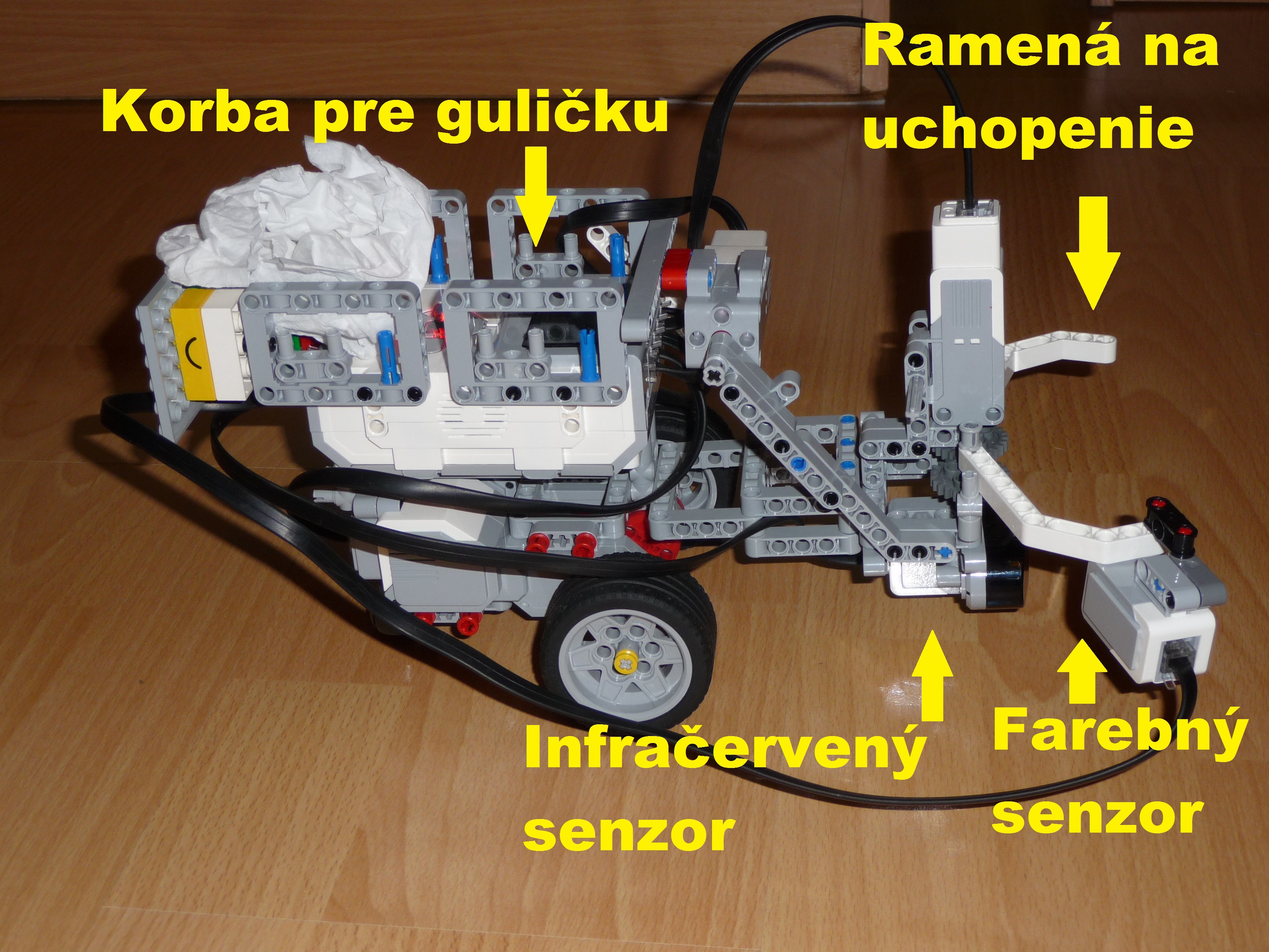 Konštrukcia robota: Robot ma infračervený senzor na vyhľadanie pohára s guličkou. Vpredu má dve ramená, ktoré otvára a zatvára malý motor a ktorými robot uchopí pohár s guličkou. Na jednom ramene je farebný senzor s ktorým robot zistí, že má pohár v ramenách. Ramená s farebným senzorom sú na otočnom mechanizme, ktorý sa otáča malým motorom. Popis funkcie: Robot sa otáča dovtedy, pokiaľ pomocou IR senzora nenájde pohár s guličkou. Potom sa pohne dopredu a pohybuje sa dovtedy, kým farebný senzor, ktorý je na jednom z ramien nezachytí, že je pohár medzi ramenami. Zároveň si robot zapamätá počet otáčok motorov pohybu. Potom sa ramená uzavrú za pomoci malého motora. Druhý malý motor zdvihne otočný mechanizmus, ktorý zdvihne pohár a vysype guličku na korbu robota. Položí pohár na pôvodné miesto a s guličkou na korbe zacúva na pôvodné miesto, odkiaľ vyštartoval. Popis programu: robot točí jedným kolesom (otáča sa) a pritom hľadá IR senzorom pohár. Keď ho nájde, tak sa pohybuje dopredu dokým farebný senzor nezachytí akúkoľvek farbu. Vtedy zavrie ramená a zdvihne pohár a vysype guličku na korbu. Vráti pohár na miesto a potom koľkokrát koľko sa otáčalo koleso pri pohybe toľkokrát sa otočia pri pohybe späť a robot odvezie guličku na miesto odkiaľ sa pohol.