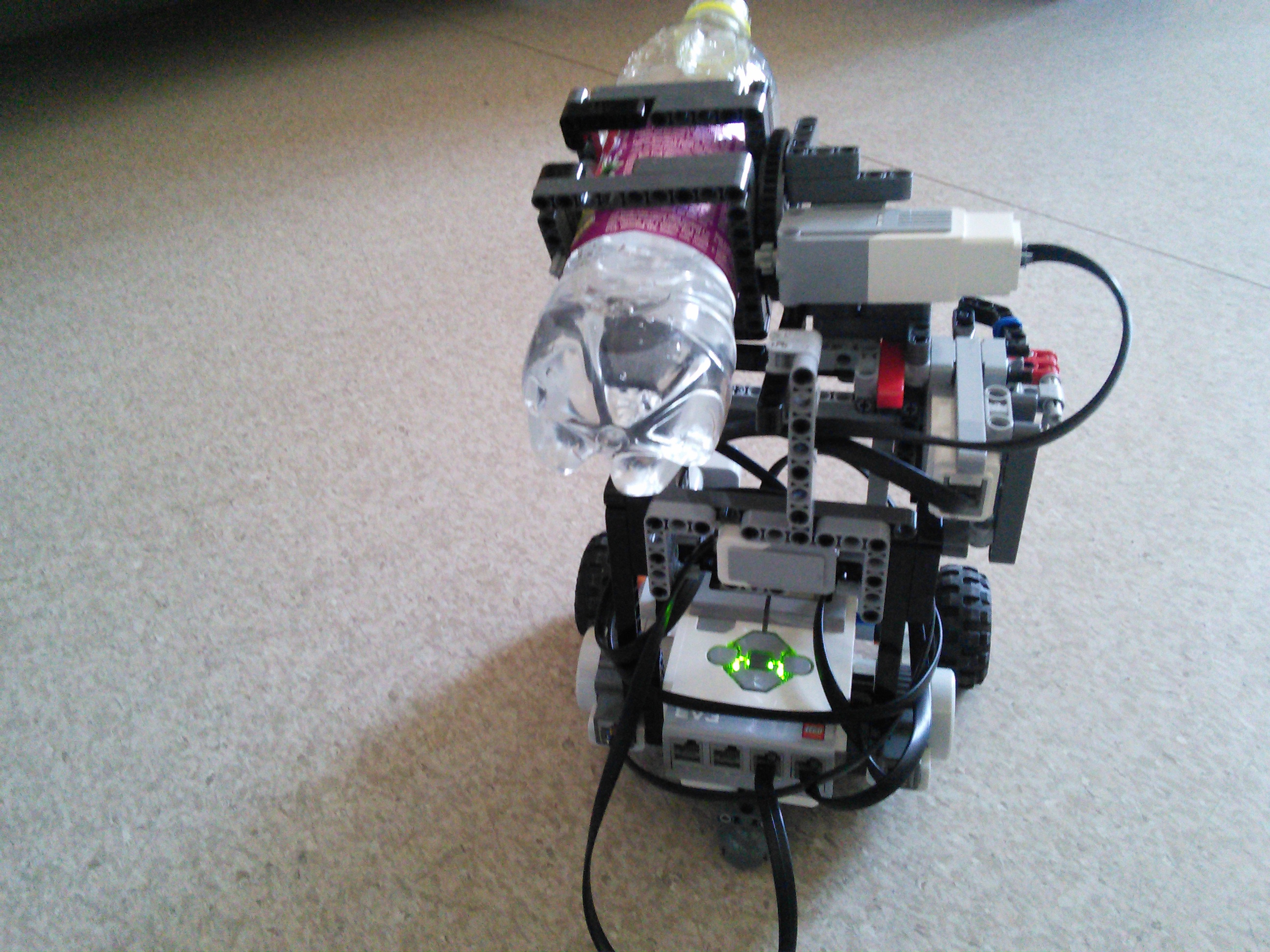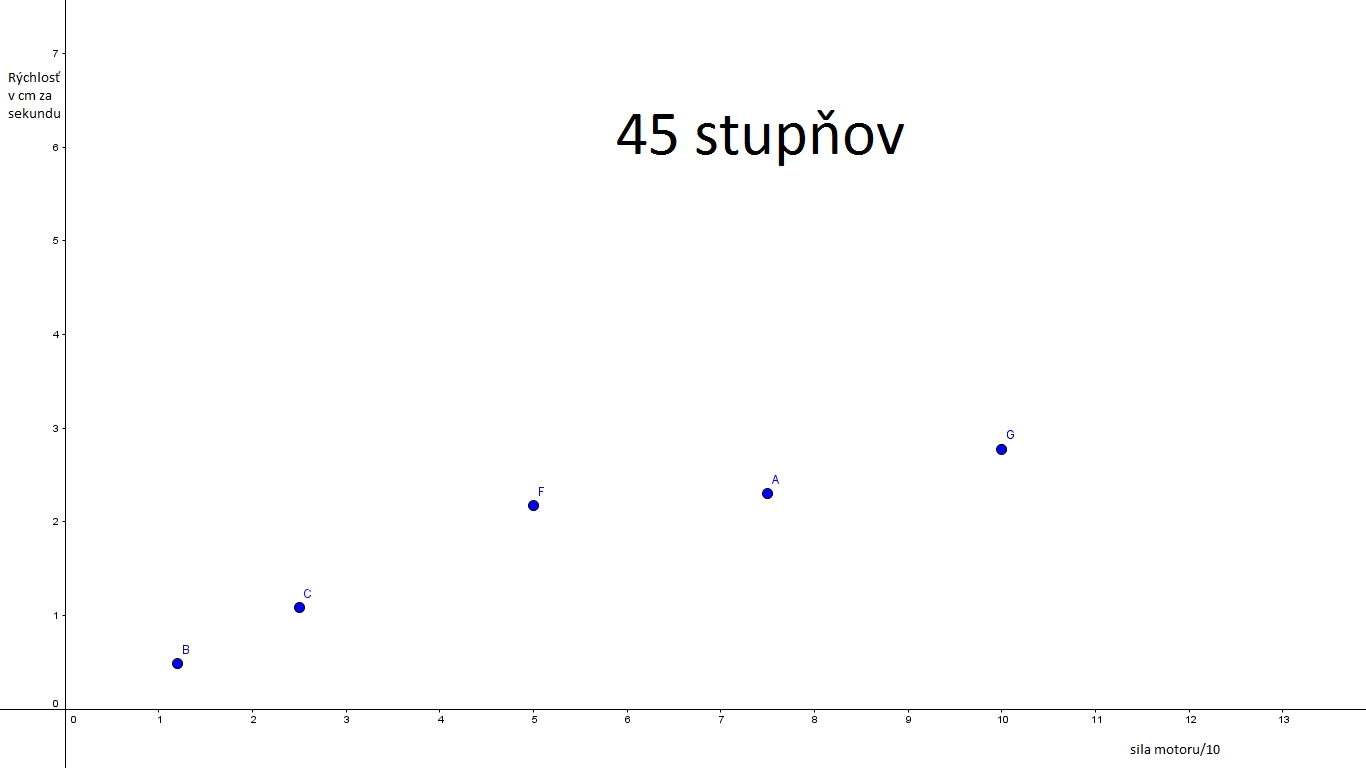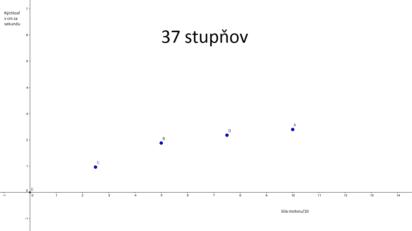 Riešenie 6. kolo Letná liga: Palica von z vreca a preteky v jazde do kopca Preteky v jazde do kopca Urobili sme robota, ktorý má 2 large motory na pohyb. Vpredu má kolesá s priemerom 43mm, ktoré sú voľné. Vzadu sú kolesá s priemerom 56mm a sú pripojené na motory. Robot váži 641g. Urobili sme dva sklony naklonenej roviny a merali sme pri 25, 50, 75 a 100 power. Naša meracia trať mala dĺžku 96.5cm. Na prvom grafe je stúpanie 45 stupňov, na druhom je 37 stupňov. Graf vyzerá pre oba prípady ináč, v prvom ma nižší sklon ako v druhom, čo znamená zem na dosiahnutie rovnakej rýchlosti potrebujeme pri väčšom stúpaní viac energie. Celé to závisí od vzorca P=m*g*cos(alfa)*(d/t), teda výkon je rovný sile, ktorou je teleso ťahane dole po naklonenej rovine krát rýchlosť. Približný výkon nášho robota pri power 100 a sklone 45 stupňov je 1.0677watt a pri sklone 37 stupňov a power 100 je to 1.393watt. Zvyšná energia sa stráca do vertikálnej zložky (plný výkon motorov je väčší, ale tento výkon je stratený). Palica von z vreca Najprv sme nevedeli ako máme guličku vybrať, ale potom nám napadlo, že to pôjde pomocou vody. Na robota sme použili 4 motory, z toho 2 large na pohyb a 2 medium na nalievanie vody a chytanie loptičky. Na nalievanie vody sme použili PET fľašu, ktorú sme dobre uchytili a sprevodovali na motor. Na chytenie loptičky sme použili ruku, ktorá má na sebe protišmykové LEGO gumičky. Použili sme ultrazvukový senzor a gyroskop. Ultrazvukový senzor slúži na nájdenie pohára. Program: Na začiatku robot nájde pohár tak, že sa pomaly otáča až kým senzorom uvidí pohár. Táto časť nám dobre nefungovala, lebo nalievanie vody vyžaduje veľkú presnosť. Urobili sme okolo pohára štvorcovú konštrukciu, lebo sme si mysleli, že to bude spoľahlivejšie odrážať ultrazvuk. Keď sme to vyskúšali, bolo to lepšie, ale stále to nestačilo. Urobili sme to, že robot nájde zlom medzi tým, že vidí a nevidí pohár na ľavej a pravej strane zapamätá si uhly z gyroskopu a urobí z nich priemer. Nastaví sa na priemerný uhol. Vo videu je použitý predchádzajúci variant, lebo začal fungovať lepšie. Robot ide rovno dokým pohár bude ďalej ako 8cm. Potom pomaly nalieva vodu pomalým sklápaním fľaše. Robot sa otočí doľava a ide dopredu, rukou chytí vyplávanú loptičku. Otočí sa doprava a cúva toľko, koľko išiel dopredu k poháru. Tým sa vráti na pôvodné miesto.
