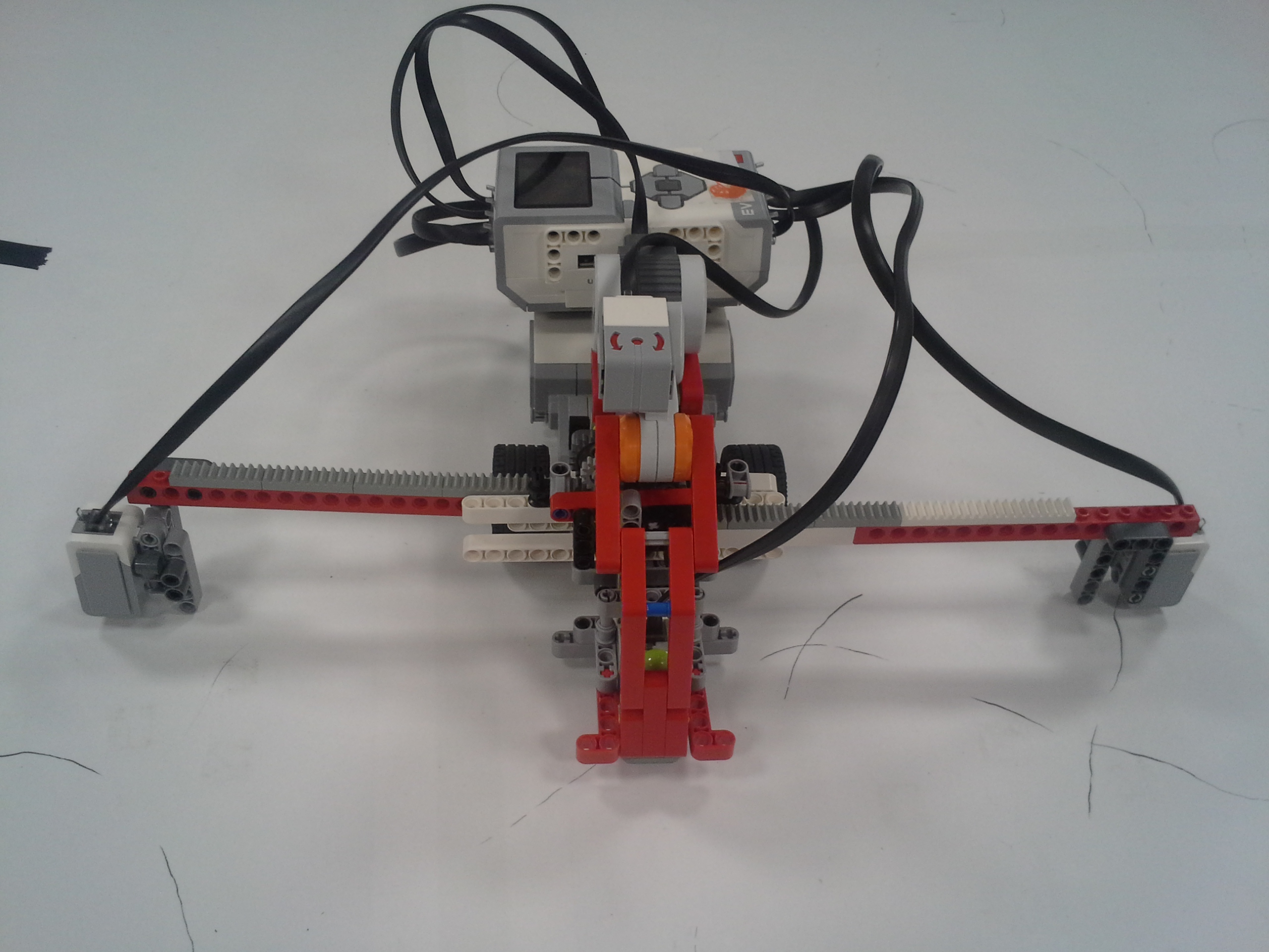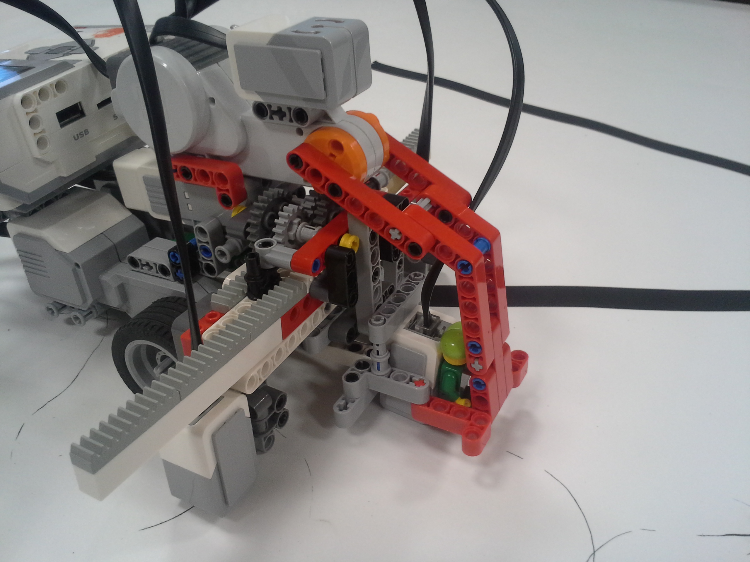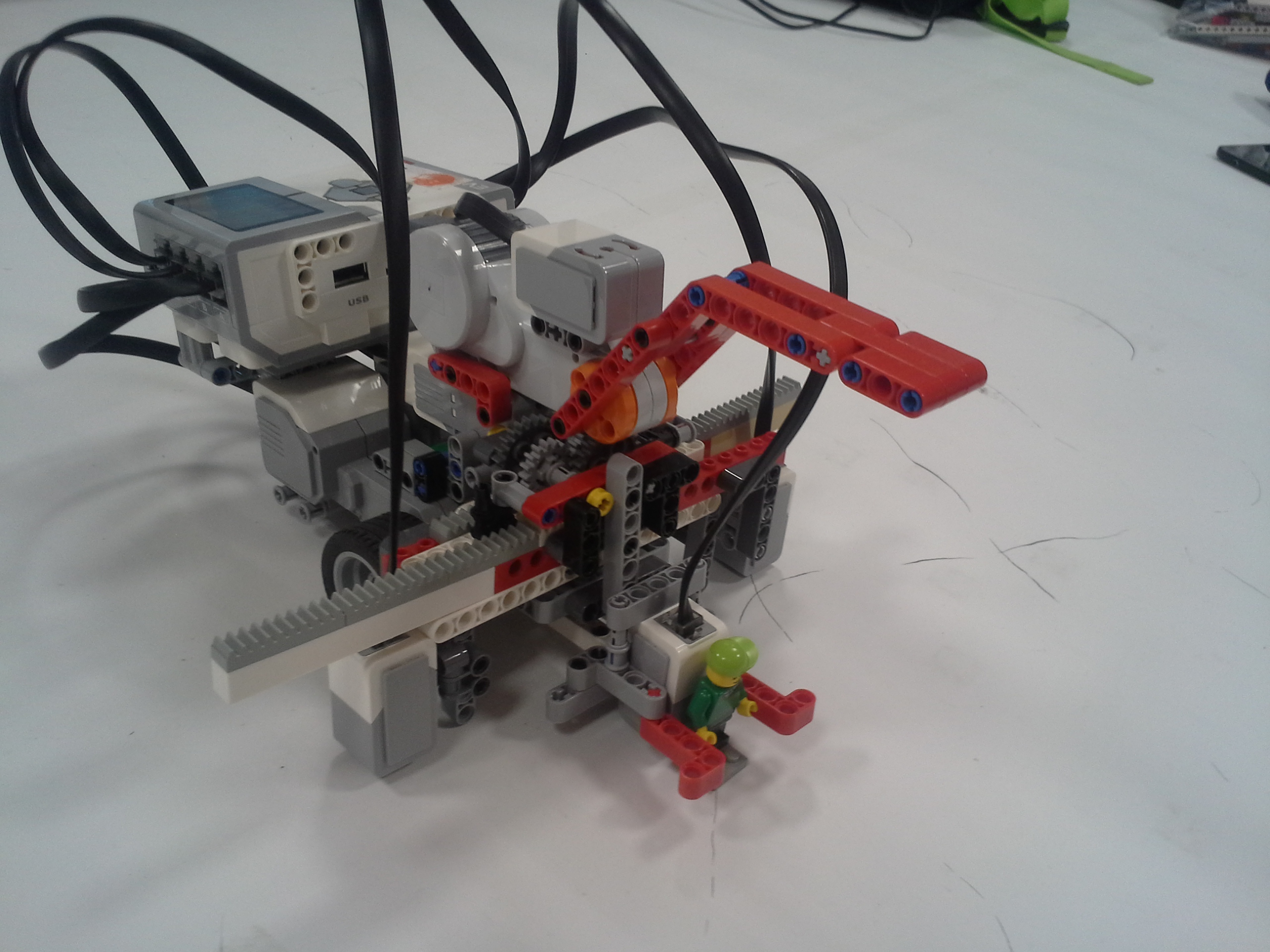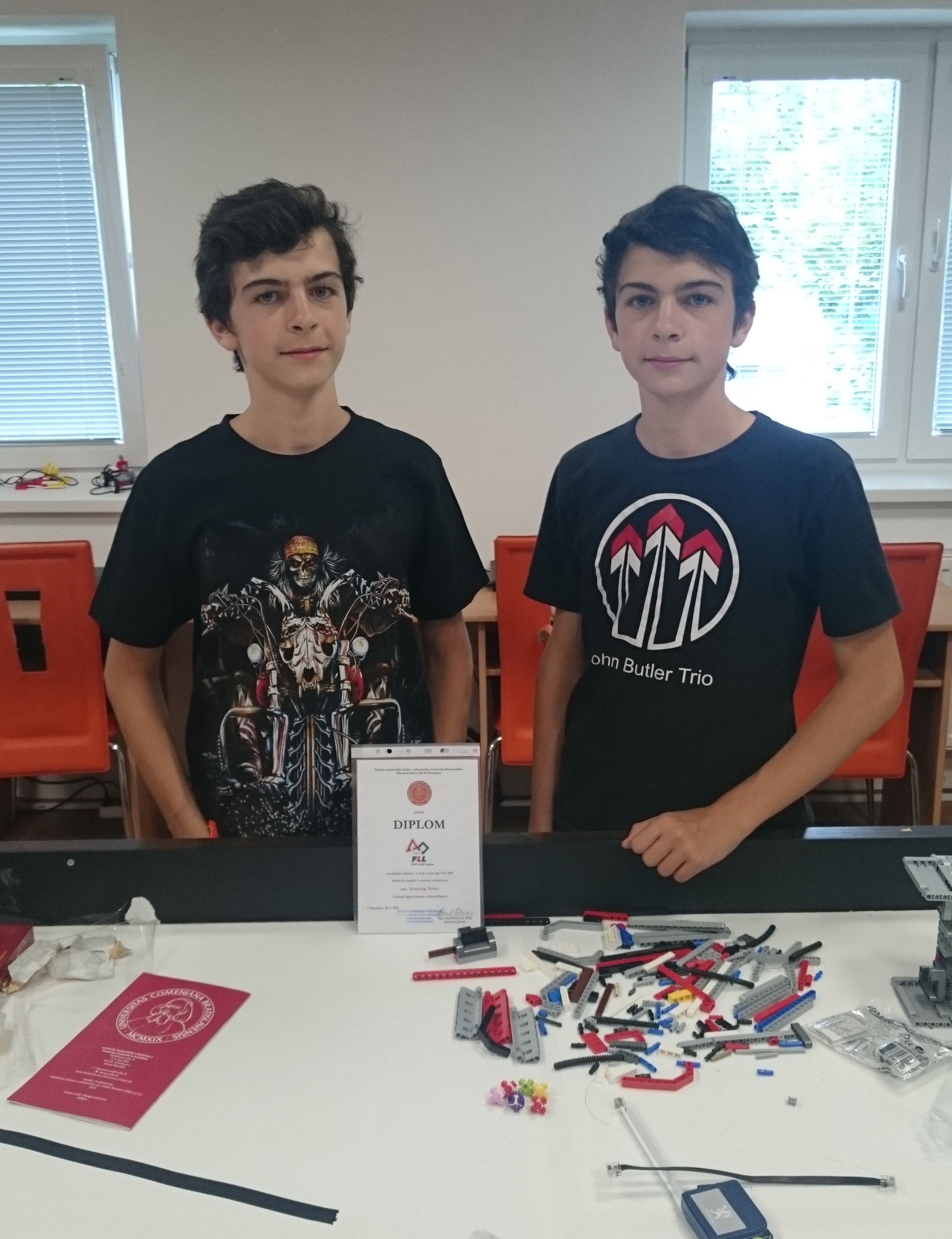1.úloha (Vzpierač) Náš robot na túto úlohu má na vrchu menšej spevnenej konštrukcie zdvíhaciu plošinu. Krútiaci moment motora je prenesený pomocou šnekovej prevodovky na ozubenú tyč zdvíhacej plošiny. Šnekovú prevodovku sme použili, aby sa plošina po vytlačení závažia nemohla pod jeho váhou posunúť nižšie, alebo pretlačiť motor a na jej pohyb nepotrebuje veľkú silu. Nechávali sme ho vytláčať nádobu s rôzne ťažkými závažiami, nakoniec sme prišli na to, že náš robot je schopný vytlačiť nádobu s váhou niečo cez 6056 g, čiže okolo 6 kilogramov, ale bol limitovaný iba silou motora a pevnosťou Lego konštrukcie. Zvládal zdvihnúť aj 6,6 kg, ale počas zdvíhania sa prehýbal, takže do videa sme dali iba závažie s hmotnosťou 6,056 kg. Závažie stihol zdvihnúť vždy pod 30 sekúnd. Kvôli tomu, že náš robot nie je veľmi stabilný, nádobu musí mať počas vytláčania opretú o stenu. 2.Úloha (Stavbár) Robot - Tohto robota sme sa rozhodli spraviť tak, aby dokázal po jednej čiernej čiare ísť a druhú skenovať nejakým pohyblivým ramenom, ale keďže robot nevie na ktorej z dvoch čiar sa nachádza musel mať ramená na oboch stranách. Tak sme mu dali dve ozubené ramená, s farebnými senzormi na koncoch, ktoré sa rovnomerne vysúvajú za pomoci ozubených kolies. Tretí farebný senzor má robot vpredu a taktiež ním tlačí stavbára na miesto určenia. Navrchu má robot štvrtý motor s ramenom na držanie stavbára, na ktorom je pripevnený gyro-senzor na presnejšie otáčanie. Program - Robot najprv ide dopredu a hľadá prvú čiernu čiaru, keď ju nájde, zarovná sa podľa nej a chvíľu po nej ide (pre lepšie zarovnanie). Ak by po nej išiel zlým smerom, nenašiel by do 4 sekúnd druhú čiaru, zistil by to, a otočil by sa o 180° (túto možnosť nemáme natočenú). Keď je presne zarovnaný, zresetuje si gyro-senzor a potom sa už pohybuje iba podľa neho. Najprv ide trochu dozadu, aby si bol istý, že druhú čiaru má pred bočným senzorom, potom ide rovno dopredu, až kým ju nezaznamená jedným z bočných senzorov. Potom počas pohybu dopredu, zasúvaním ramena prechádza bočným senzorom po okraji druhej čiary, a zaznamená si jej uhol (tak, že vydelí počet otáčok jeho kolies počtom otáčok motora, ktorý pohybuje senzormi). Nakoniec si vypočíta kedy by sa teoreticky stretli jeho predný a bočný senzor, a podľa toho prejde určitú vzdialenosť dopredu. Tam sa otočí trochu doľava, pretože išiel po pravej strane prvej čiary, Vypustí stavbára (veľmi jemne) a vycúva preč.