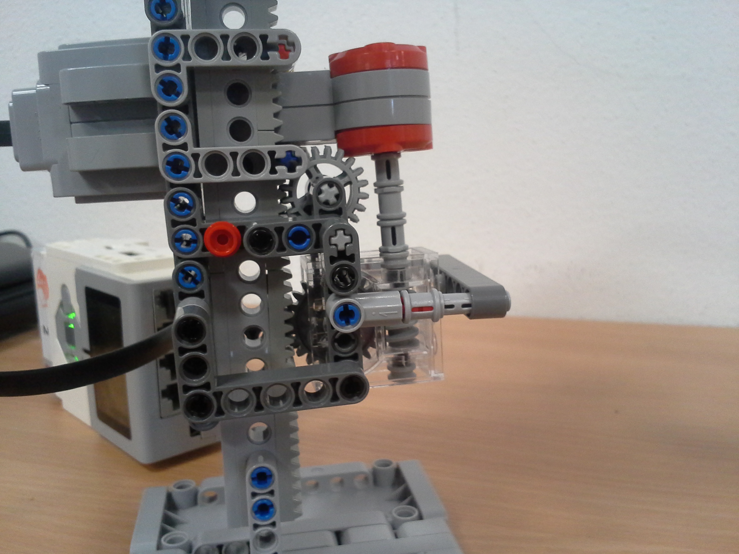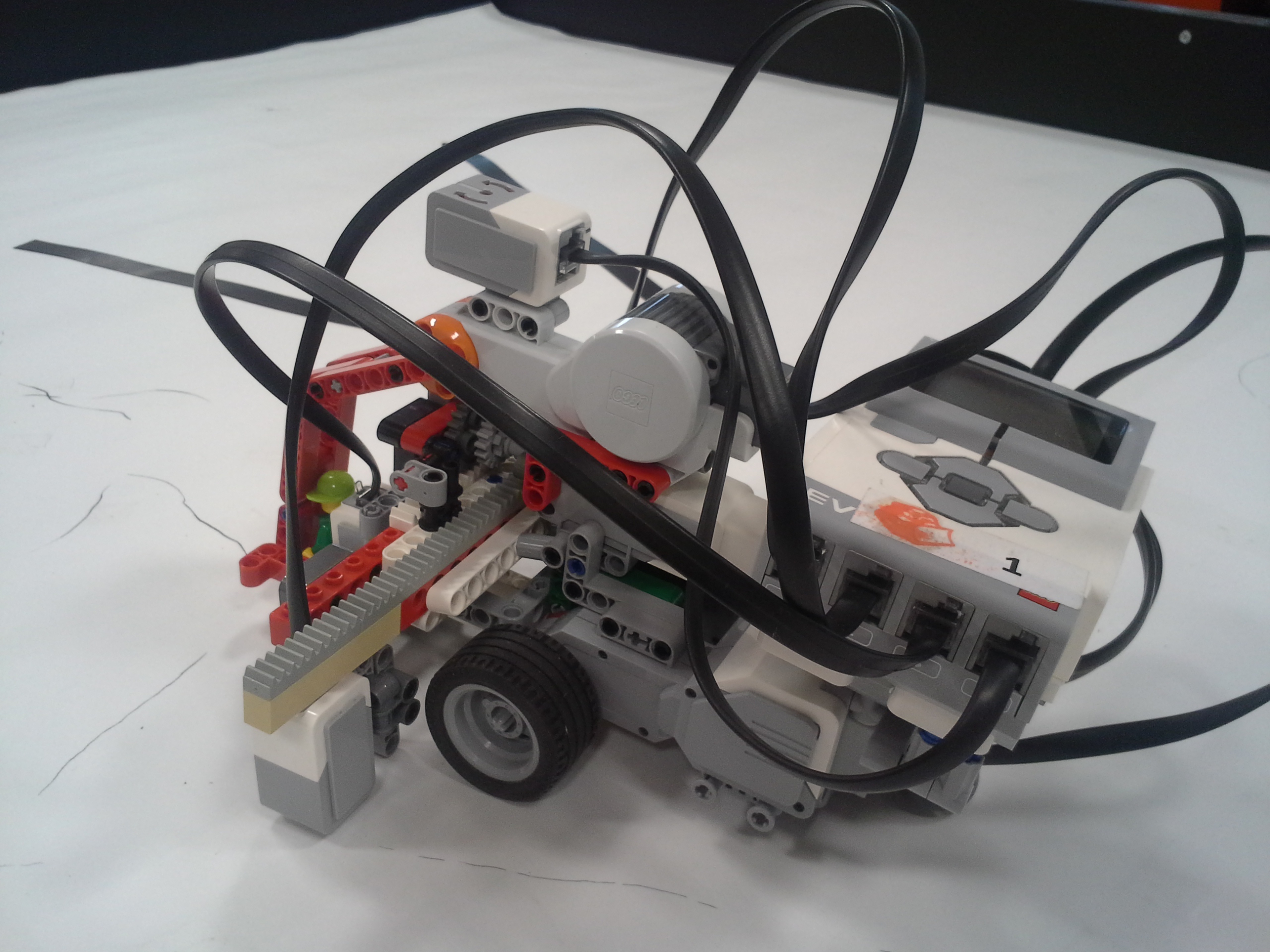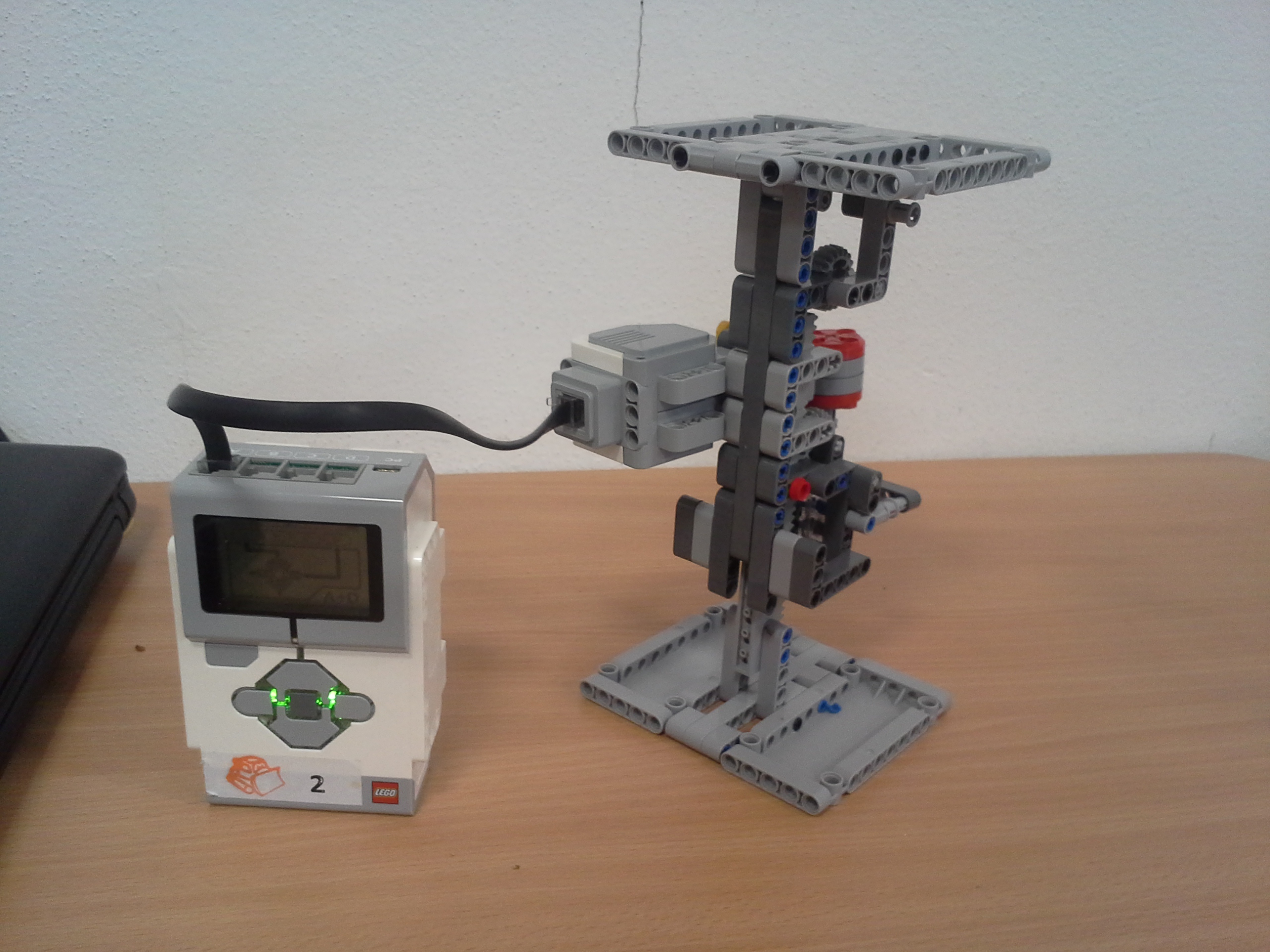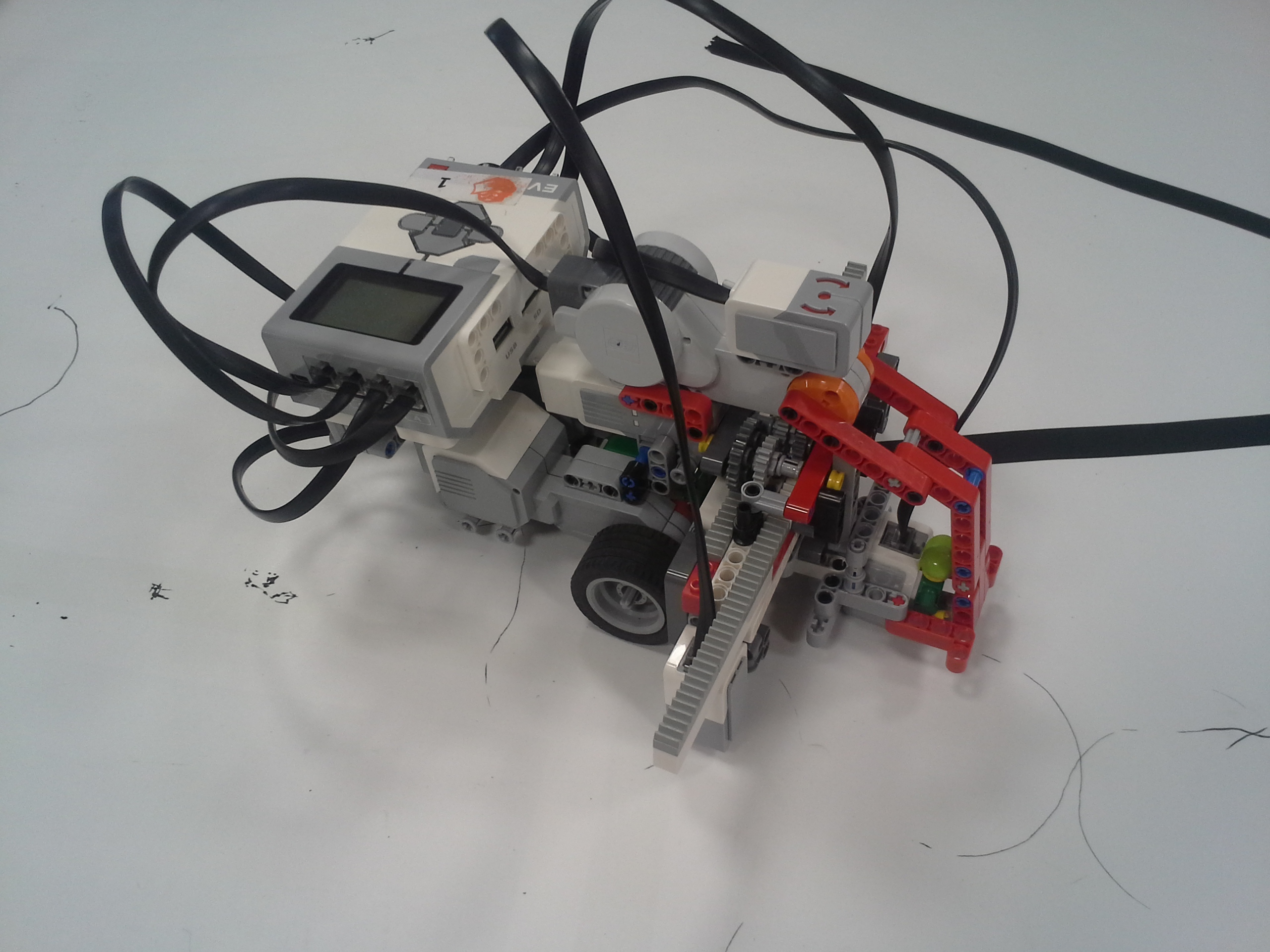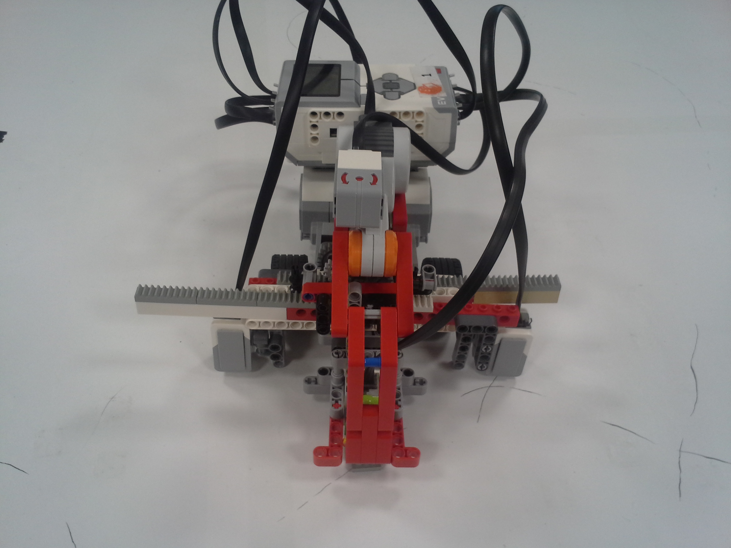 1.úloha (Vzpierač) Náš robot na túto úlohu má na vrchu menšej spevnenej konštrukcie zdvíhaciu plošinu. Krútiaci moment motora je prenesený pomocou šnekovej prevodovky na ozubenú tyč zdvíhacej plošiny. Šnekovú prevodovku sme použili, aby sa plošina po vytlačení závažia nemohla pod jeho váhou posunúť nižšie, alebo pretlačiť motor a na jej pohyb nepotrebuje veľkú silu. Nechávali sme ho vytláčať nádobu s rôzne ťažkými závažiami, nakoniec sme prišli na to, že náš robot je schopný vytlačiť nádobu s váhou niečo cez 6056 g, čiže okolo 6 kilogramov, ale bol limitovaný iba silou motora a pevnosťou Lego konštrukcie. Zvládal zdvihnúť aj 6,6 kg, ale počas zdvíhania sa prehýbal, takže do videa sme dali iba závažie s hmotnosťou 6,056 kg. Závažie stihol zdvihnúť vždy pod 30 sekúnd. Kvôli tomu, že náš robot nie je veľmi stabilný, nádobu musí mať počas vytláčania opretú o stenu. 2.Úloha (Stavbár) Robot - Tohto robota sme sa rozhodli spraviť tak, aby dokázal po jednej čiernej čiare ísť a druhú skenovať nejakým pohyblivým ramenom, ale keďže robot nevie na ktorej z dvoch čiar sa nachádza musel mať ramená na oboch stranách. Tak sme mu dali dve ozubené ramená, s farebnými senzormi na koncoch, ktoré sa rovnomerne vysúvajú za pomoci ozubených kolies. Tretí farebný senzor má robot vpredu a taktiež ním tlačí stavbára na miesto určenia. Navrchu má robot štvrtý motor s ramenom na držanie stavbára, na ktorom je pripevnený gyro-senzor na presnejšie otáčanie. Program - Robot najprv ide dopredu a hľadá prvú čiernu čiaru, keď ju nájde, zarovná sa podľa nej a chvíľu po nej ide (pre lepšie zarovnanie). Ak by po nej išiel zlým smerom, nenašiel by do 4 sekúnd druhú čiaru, zistil by to, a otočil by sa o 180° (túto možnosť nemáme natočenú). Keď je presne zarovnaný, zresetuje si gyro-senzor a potom sa už pohybuje iba podľa neho. Najprv ide trochu dozadu, aby si bol istý, že druhú čiaru má pred bočným senzorom, potom ide rovno dopredu, až kým ju nezaznamená jedným z bočných senzorov. Potom počas pohybu dopredu, zasúvaním ramena prechádza bočným senzorom po okraji druhej čiary, a zaznamená si jej uhol (tak, že vydelí počet otáčok jeho kolies počtom otáčok motora, ktorý pohybuje senzormi). Nakoniec si vypočíta kedy by sa teoreticky stretli jeho predný a bočný senzor, a podľa toho prejde určitú vzdialenosť dopredu. Tam sa otočí trochu doľava, pretože išiel po pravej strane prvej čiary, Vypustí stavbára (veľmi jemne) a vycúva preč.
