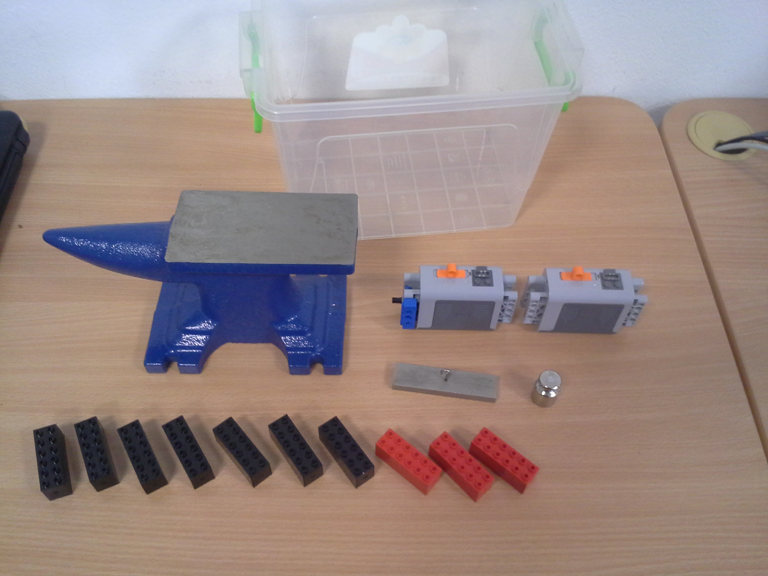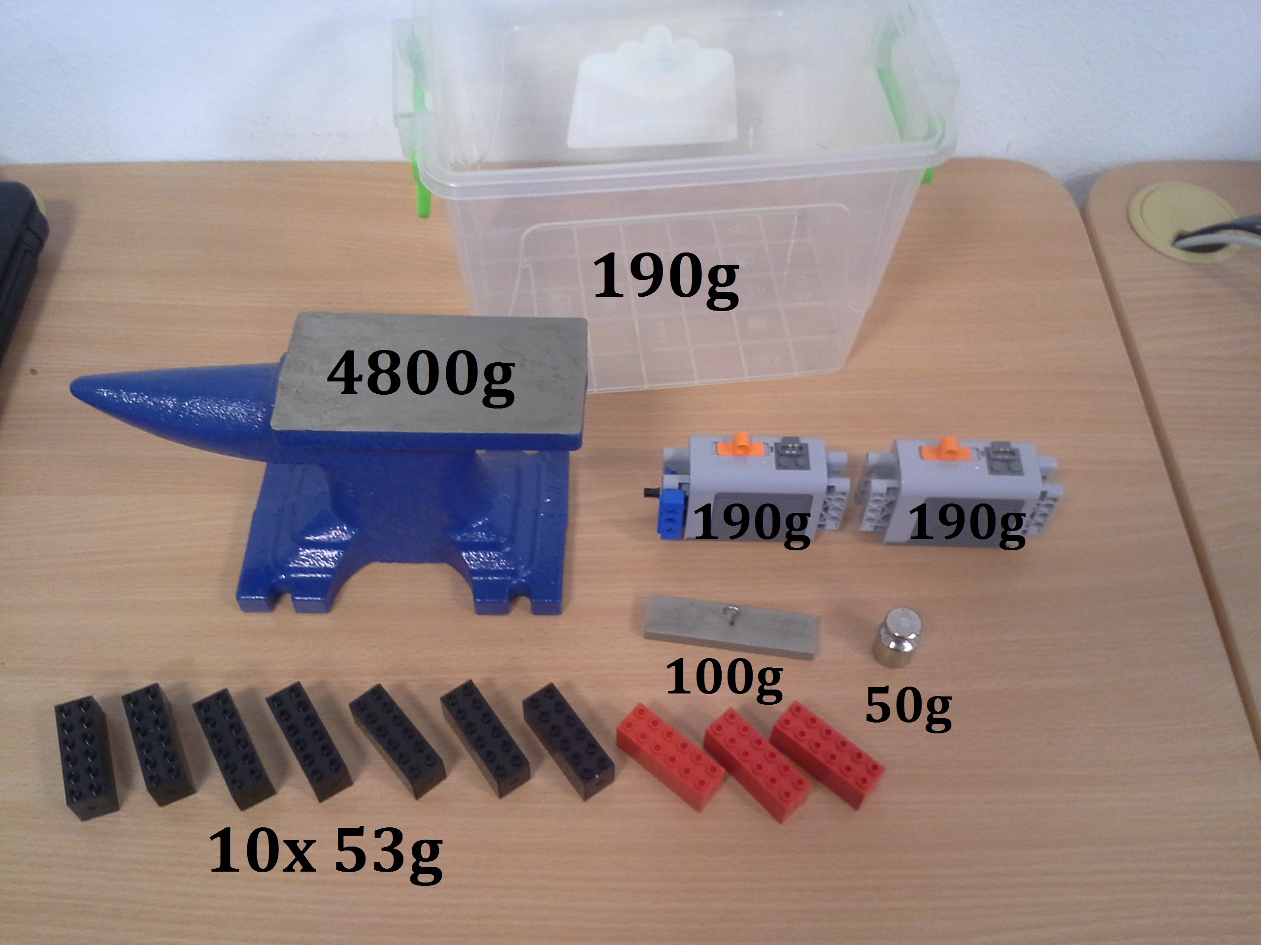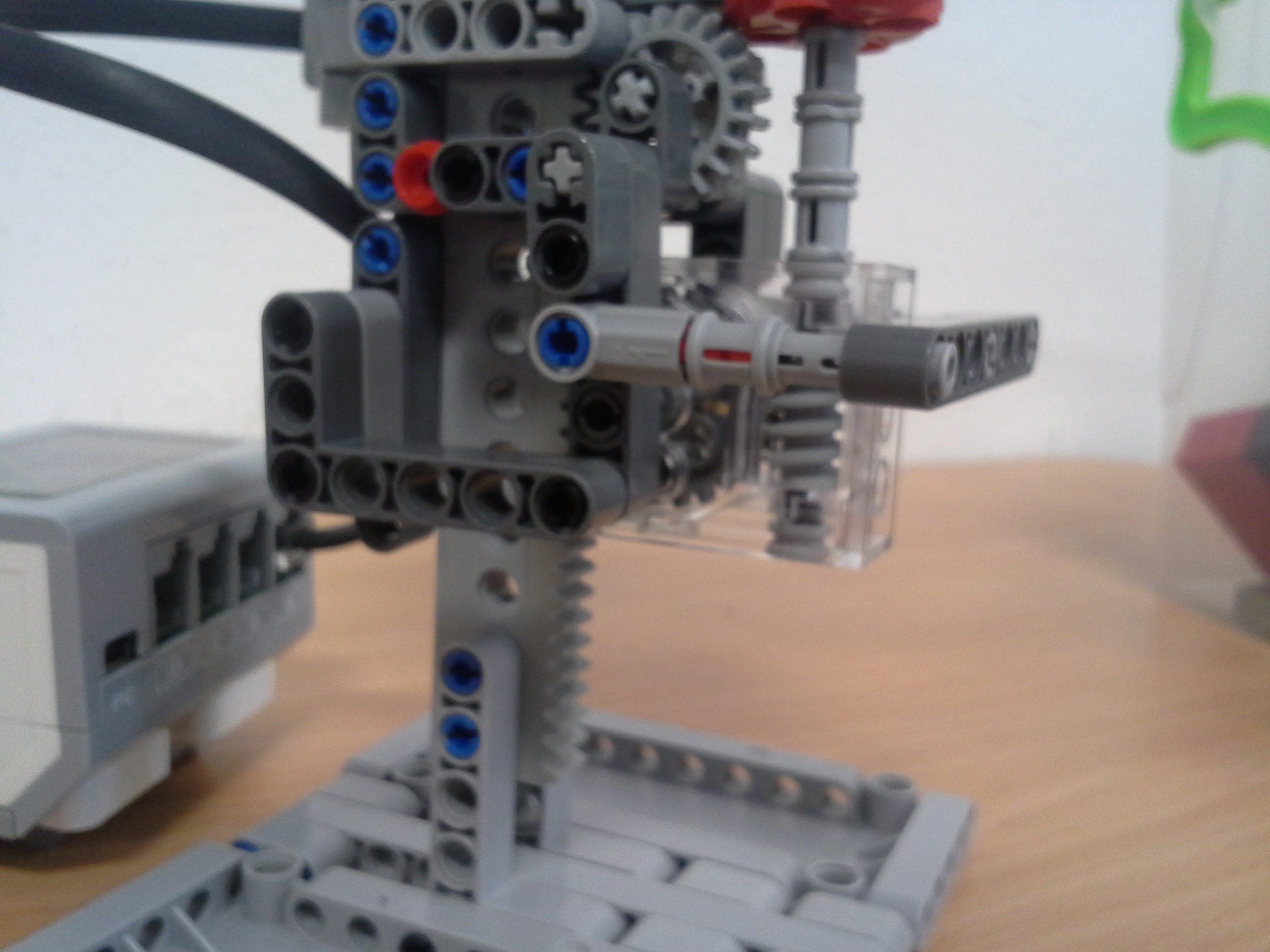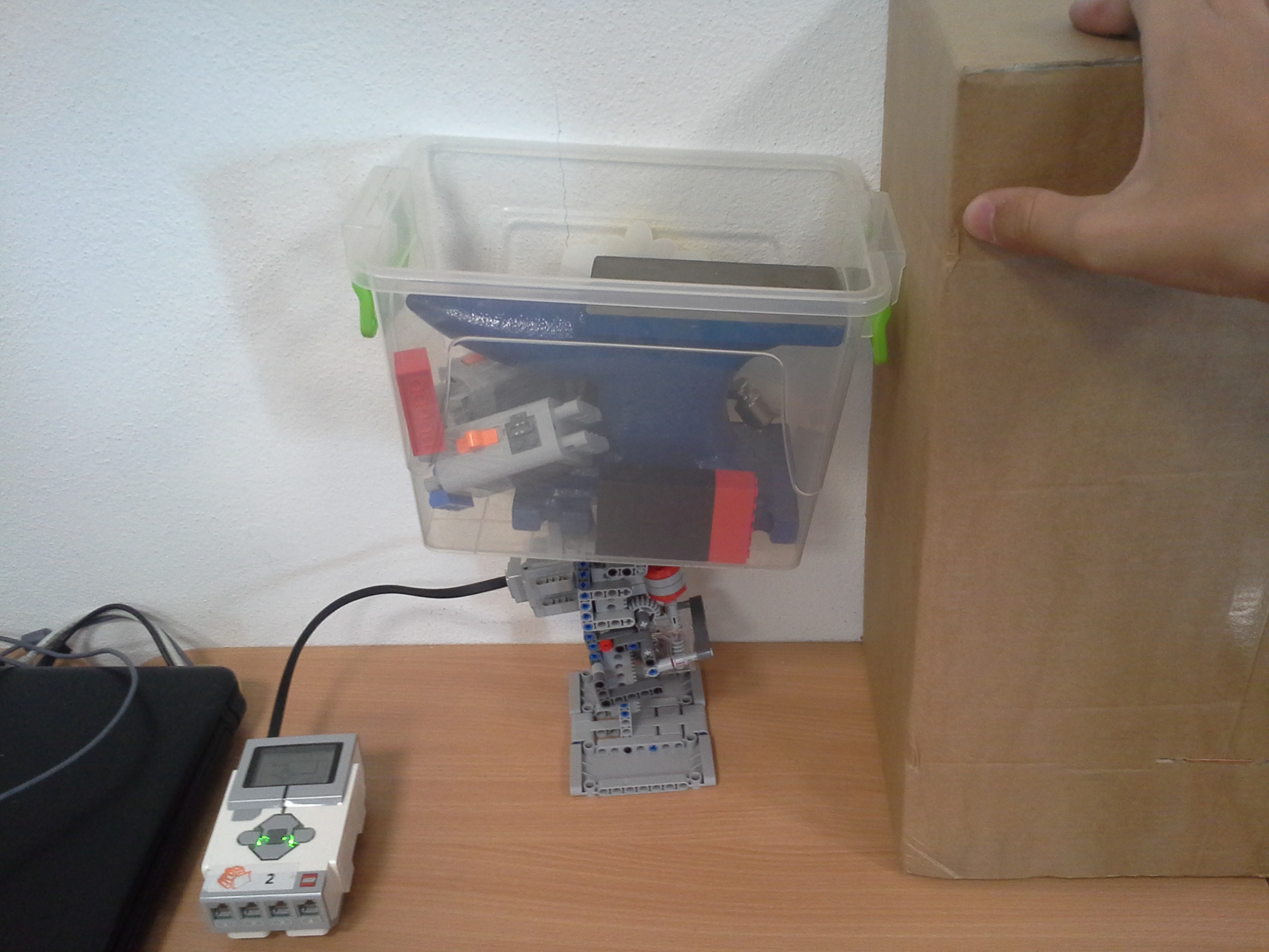 1.úloha (Vzpierač) Náš robot na túto úlohu má na vrchu menšej spevnenej konštrukcie zdvíhaciu plošinu. Krútiaci moment motora je prenesený pomocou šnekovej prevodovky na ozubenú tyč zdvíhacej plošiny. Šnekovú prevodovku sme použili, aby sa plošina po vytlačení závažia nemohla pod jeho váhou posunúť nižšie, alebo pretlačiť motor a na jej pohyb nepotrebuje veľkú silu. Nechávali sme ho vytláčať nádobu s rôzne ťažkými závažiami, nakoniec sme prišli na to, že náš robot je schopný vytlačiť nádobu s váhou niečo cez 6056 g, čiže okolo 6 kilogramov, ale bol limitovaný iba silou motora a pevnosťou Lego konštrukcie. Zvládal zdvihnúť aj 6,6 kg, ale počas zdvíhania sa prehýbal, takže do videa sme dali iba závažie s hmotnosťou 6,056 kg. Závažie stihol zdvihnúť vždy pod 30 sekúnd. Kvôli tomu, že náš robot nie je veľmi stabilný, nádobu musí mať počas vytláčania opretú o stenu. 2.Úloha (Stavbár) Robot - Tohto robota sme sa rozhodli spraviť tak, aby dokázal po jednej čiernej čiare ísť a druhú skenovať nejakým pohyblivým ramenom, ale keďže robot nevie na ktorej z dvoch čiar sa nachádza musel mať ramená na oboch stranách. Tak sme mu dali dve ozubené ramená, s farebnými senzormi na koncoch, ktoré sa rovnomerne vysúvajú za pomoci ozubených kolies. Tretí farebný senzor má robot vpredu a taktiež ním tlačí stavbára na miesto určenia. Navrchu má robot štvrtý motor s ramenom na držanie stavbára, na ktorom je pripevnený gyro-senzor na presnejšie otáčanie. Program - Robot najprv ide dopredu a hľadá prvú čiernu čiaru, keď ju nájde, zarovná sa podľa nej a chvíľu po nej ide (pre lepšie zarovnanie). Ak by po nej išiel zlým smerom, nenašiel by do 4 sekúnd druhú čiaru, zistil by to, a otočil by sa o 180° (túto možnosť nemáme natočenú). Keď je presne zarovnaný, zresetuje si gyro-senzor a potom sa už pohybuje iba podľa neho. Najprv ide trochu dozadu, aby si bol istý, že druhú čiaru má pred bočným senzorom, potom ide rovno dopredu, až kým ju nezaznamená jedným z bočných senzorov. Potom počas pohybu dopredu, zasúvaním ramena prechádza bočným senzorom po okraji druhej čiary, a zaznamená si jej uhol (tak, že vydelí počet otáčok jeho kolies počtom otáčok motora, ktorý pohybuje senzormi). Nakoniec si vypočíta kedy by sa teoreticky stretli jeho predný a bočný senzor, a podľa toho prejde určitú vzdialenosť dopredu. Tam sa otočí trochu doľava, pretože išiel po pravej strane prvej čiary, Vypustí stavbára (veľmi jemne) a vycúva preč.