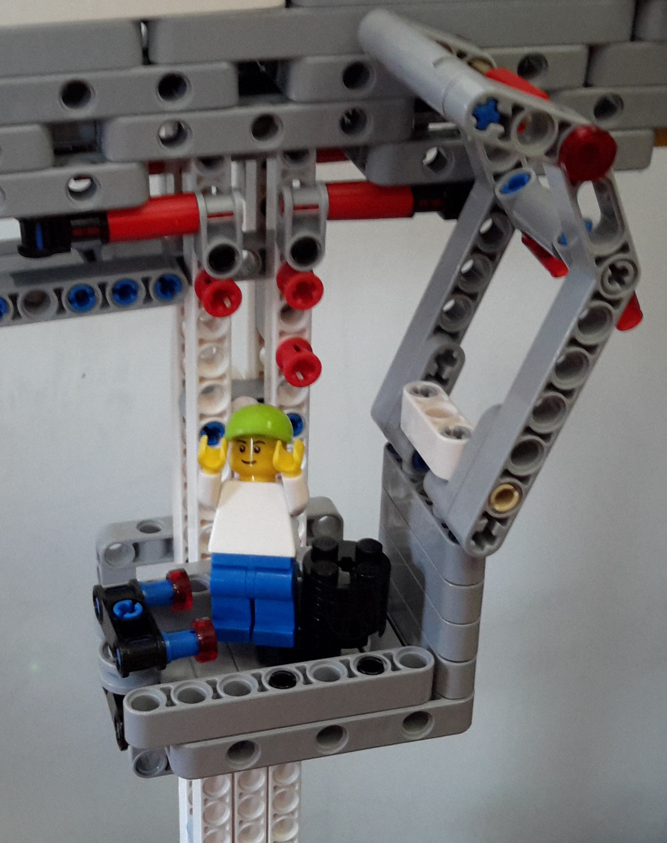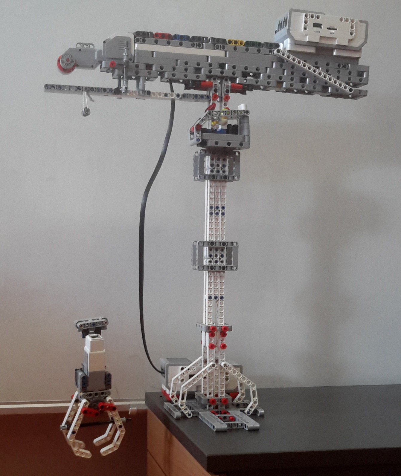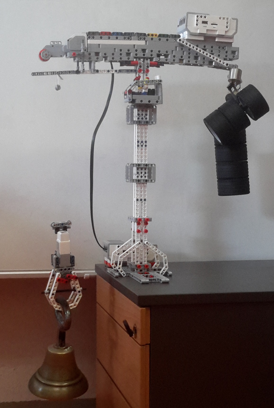 Robot je skonštruovaný tak, aby vyzeral ako klasický žeriav. Dole je jeho podstava s kockou EV3, ktorá je pripojená na dlhý kábel pozdĺž stojana, smerujúci k jedinému motoru. Na stožiari je rameno, pričom vzadu na ňom je vypnutá EV3 kocka, ktorá slúži ako protizávažie - vyrovnáva ťažisko robota. Pod ňou sú pripojené ďalšie závažia spolu s pneumatikami tiež ako protizávažie. Na druhej strane ramena je pripevnený motor, na ktorom je navijak. Pod ramenom je pripevnená plocha na ktorej je koliečko patriace ku kladkovému systému. Cez kladkový systém vedie lanko, ktoré nám zdvíha zvon (1.039 kg). Zvon je pripevnený k ruke, ktorá je zavesená na lanku spolu s ďalšími dvoma koliečkami v kladkovom systéme (motor na ruke je nefunkčný - nepripojený ku kocke). Je tam dokonca kabínka pre žeriavnika. Hmotnosť zvonu je zobrazená v druhom videu.