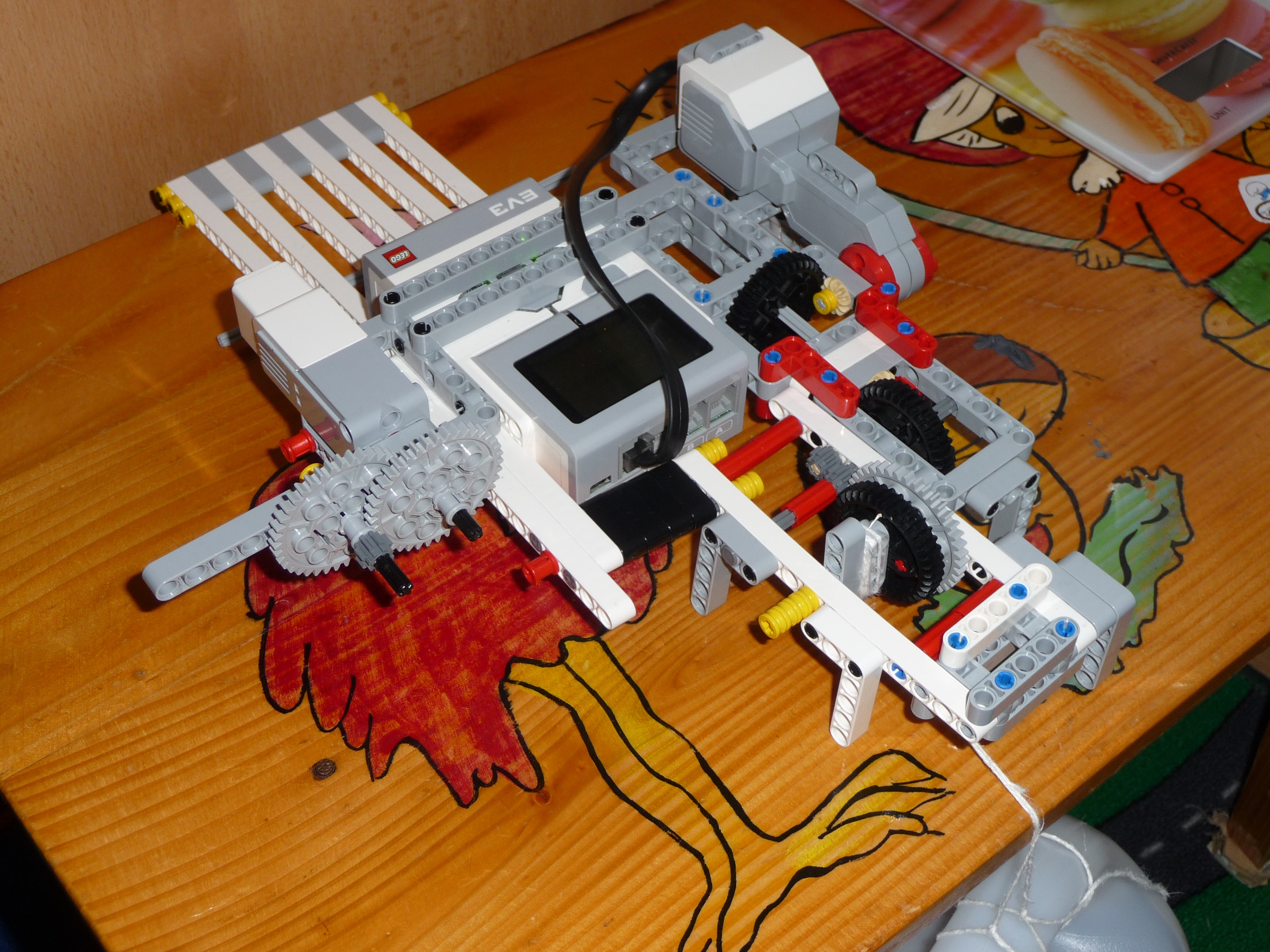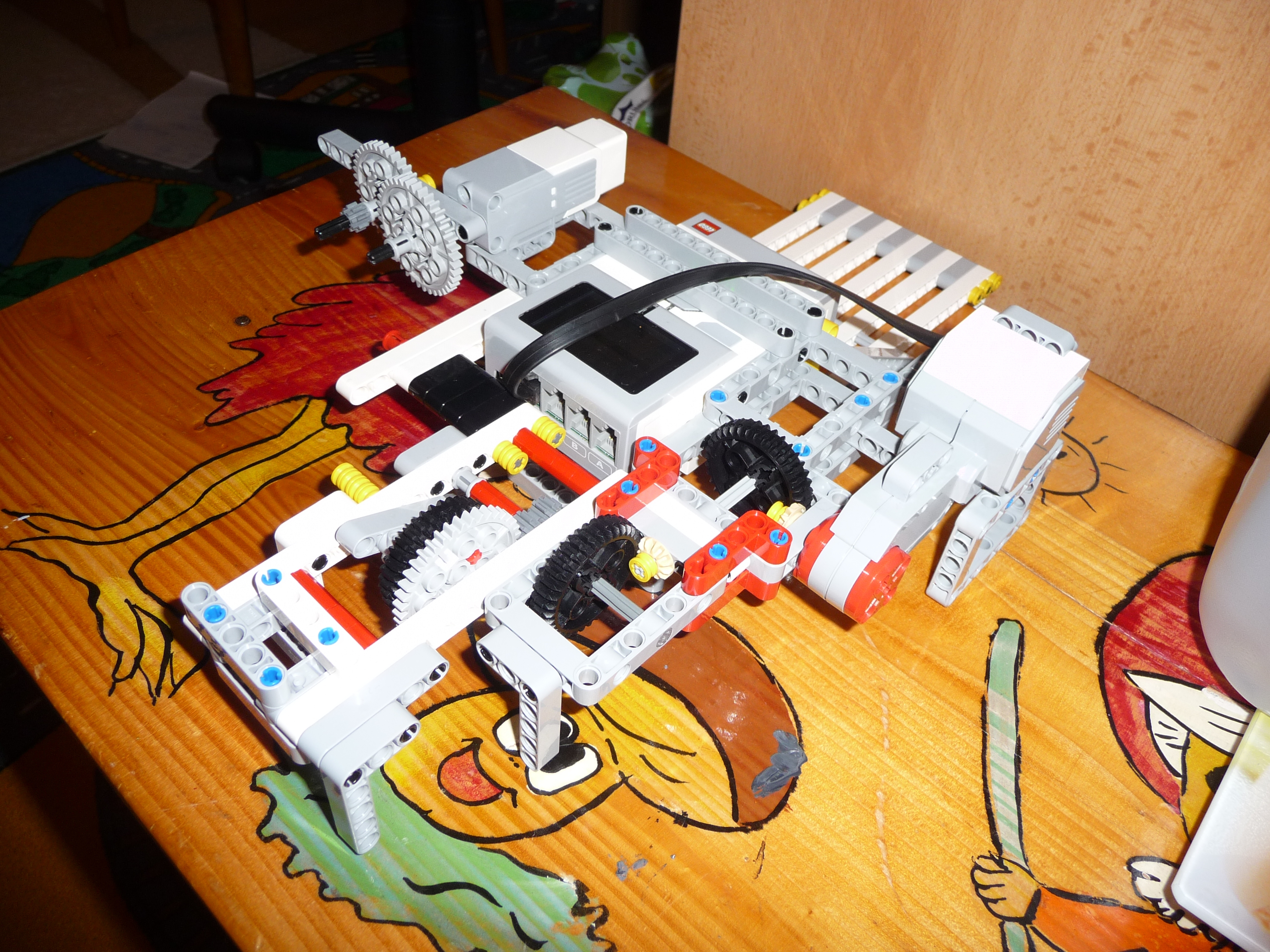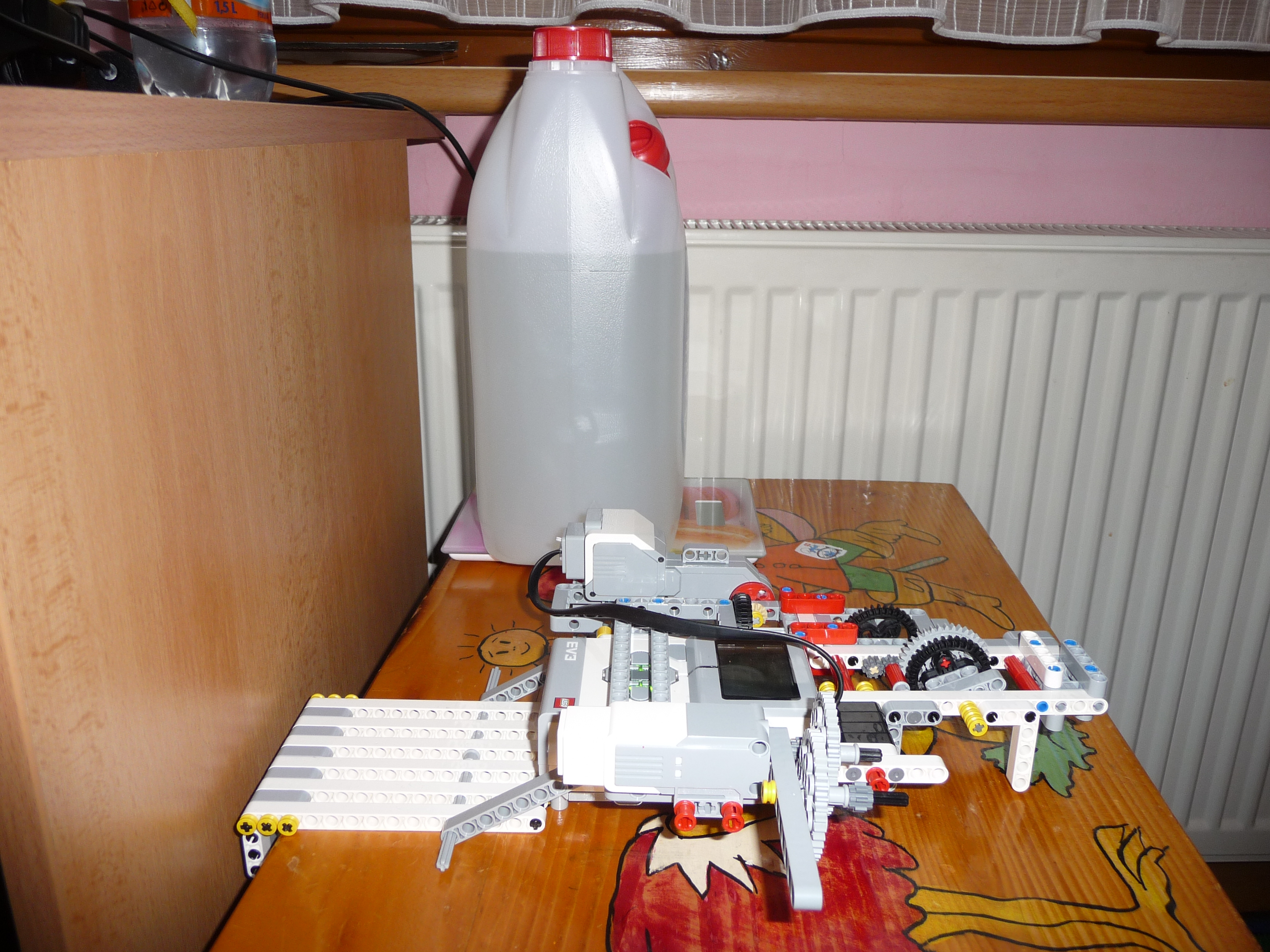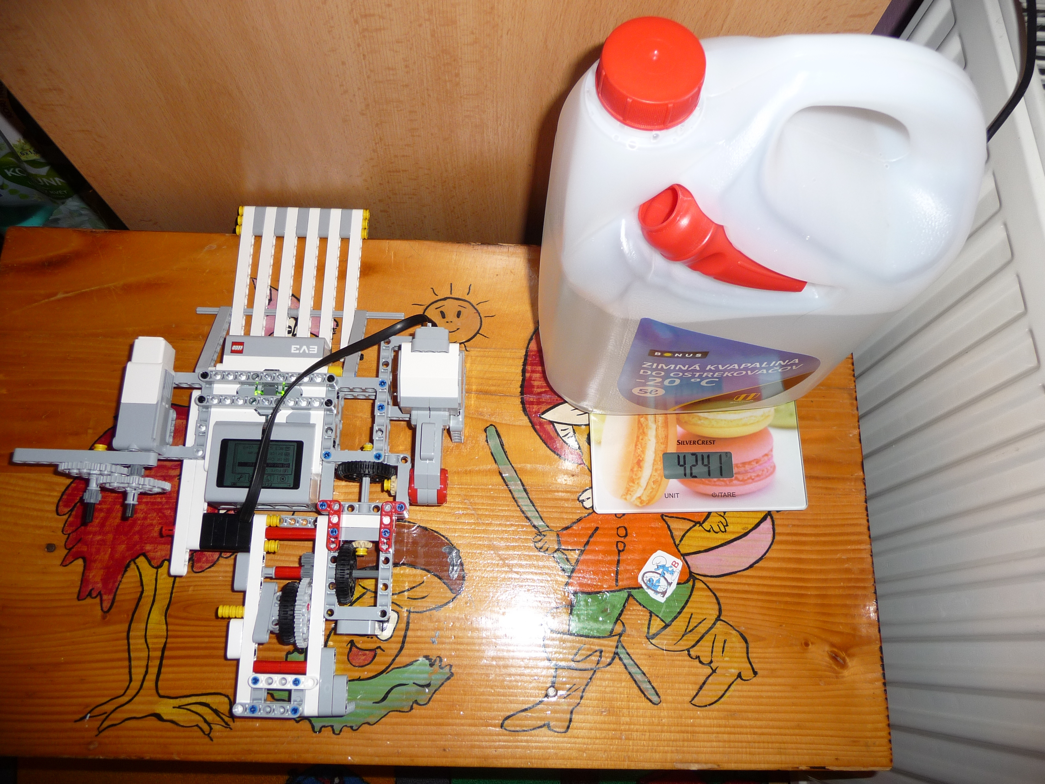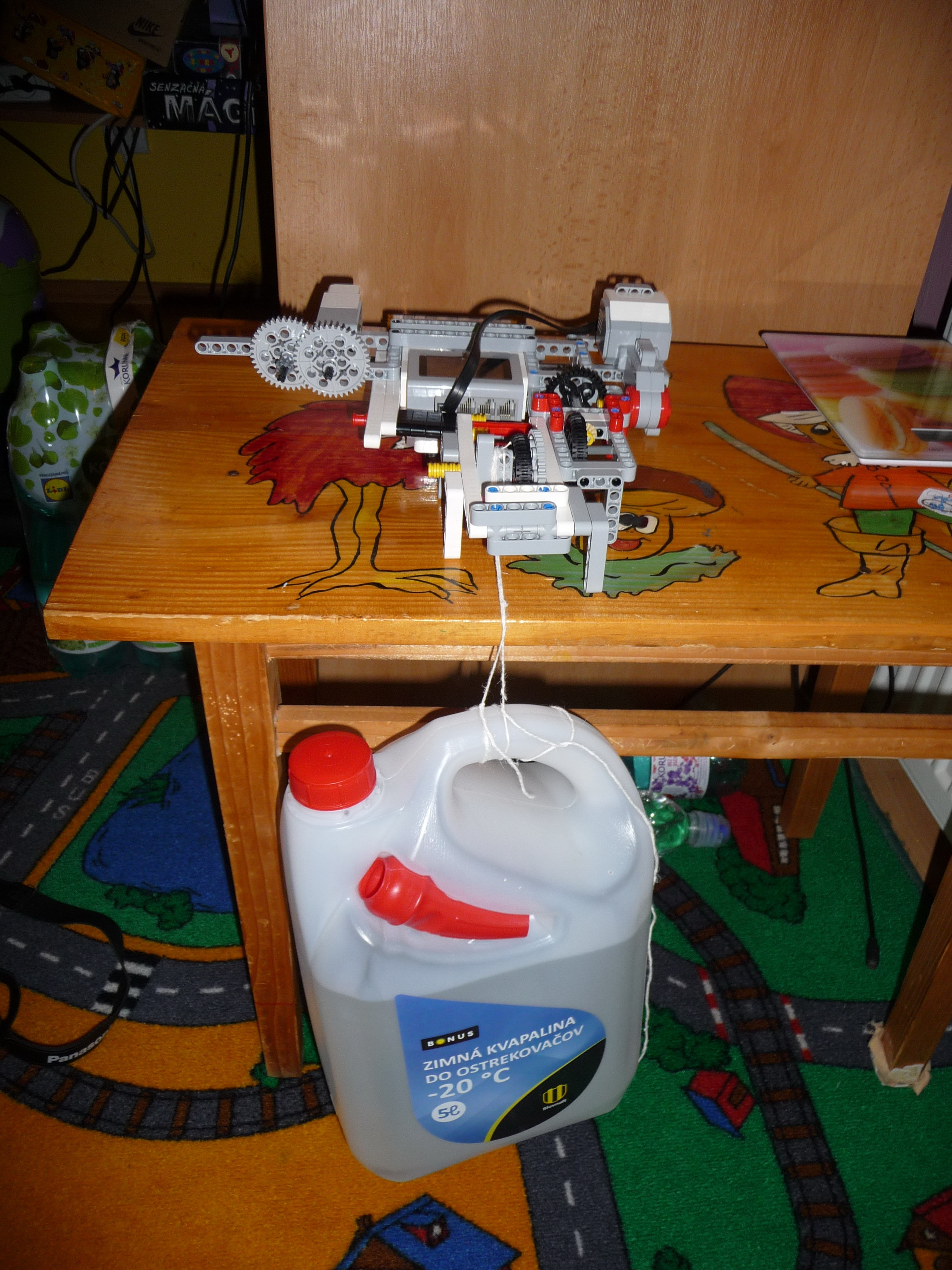 Dvíhač: Konštrukcia robota: na veľký motor sú pripojené 3 prevody, ktoré na seba nadväzujú. Prvý prevod je 1:3, druhý je tiež 1:3 a tretí je 1:5. Dokopy je výsledný prevod 1:45. Na výstupe z posledného prevodu je spevnená súčiastka na ktorú je pripojené lanko na dvíhanie závažia. Robota sme museli prichytiť ku stolíku pomocou pevnej konštrukcie, aby sme ho nemuseli držať. Na ľavej strane robota je aj malý motor s prevodmi, lebo sme chceli vyskúšať aj silu malého motora. Postup: Pôvodne sme chceli postaviť robota typu žeriav, ale nepodarilo sa nám urobiť dostatočne pevnú konštrukciu. Preto sme urobili robota na dvíhanie za pomoci prevodov a lanka. Ako závažie sme použili bandasku s vodou aby sme mohli ľahko pridávať alebo uberať hmotnosť za pomoci prilievania alebo odlievania vody. Kuchynskou váhou sme kontrolovali váhu a stopkami stopovali čas. Záver: Robot zvládol dvíhanie za asi 40 sekúnd a zdvihol závažie s váhou 4,2 kg. Zistili sme, že motor by určite zvládol aj väčšie hmotnosti, ale nech sme konštrukciu akokoľvek spevňovali, najslabším článkom bola vždy oska posledného prevodu, na ktorej bolo zavesené závažie, lebo sa nebezpečne ohýbala, ozubenie koliesok nezapadalo do seba a hrozilo, že sa oska alebo ozubené koliesko zničí.