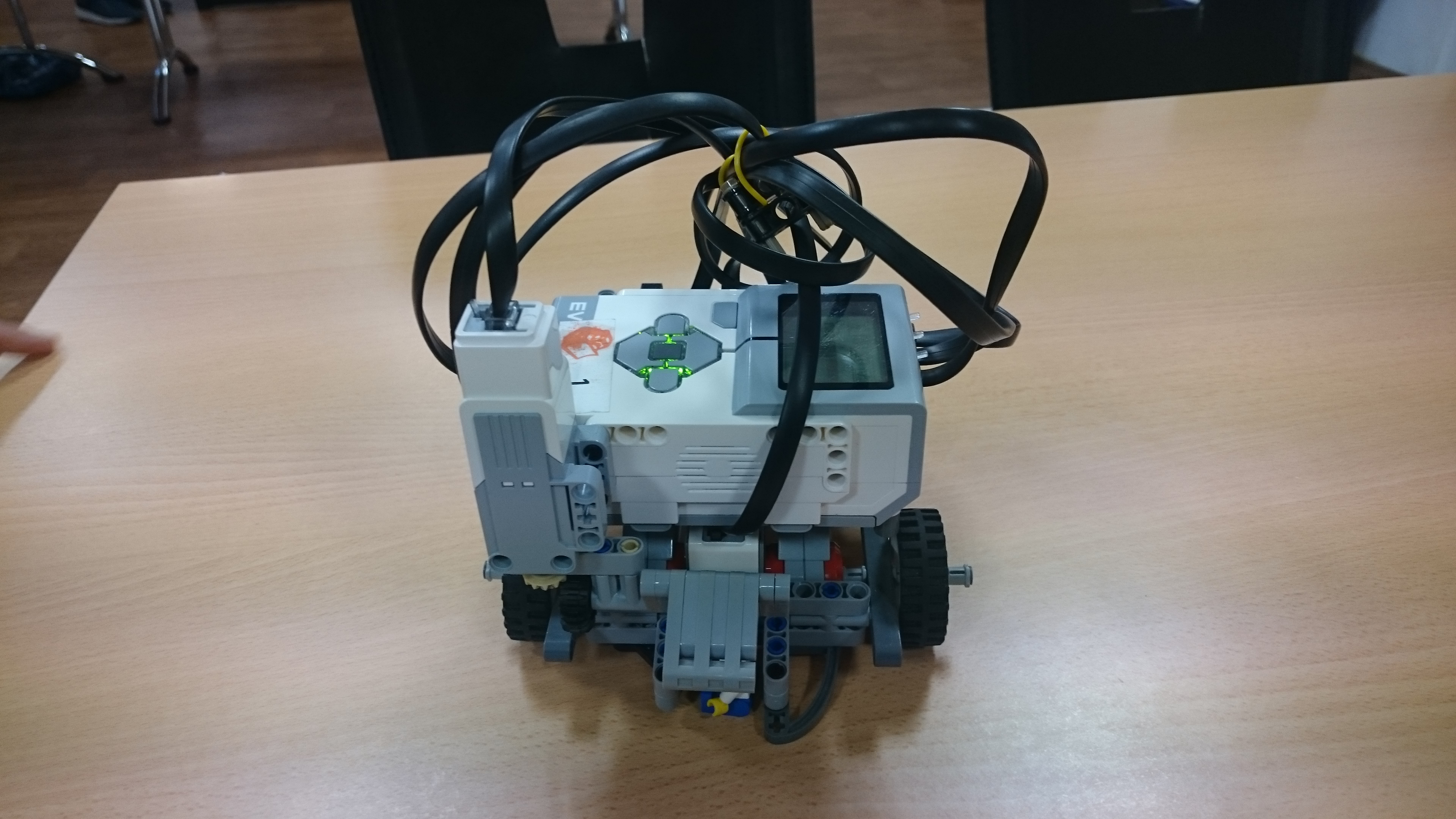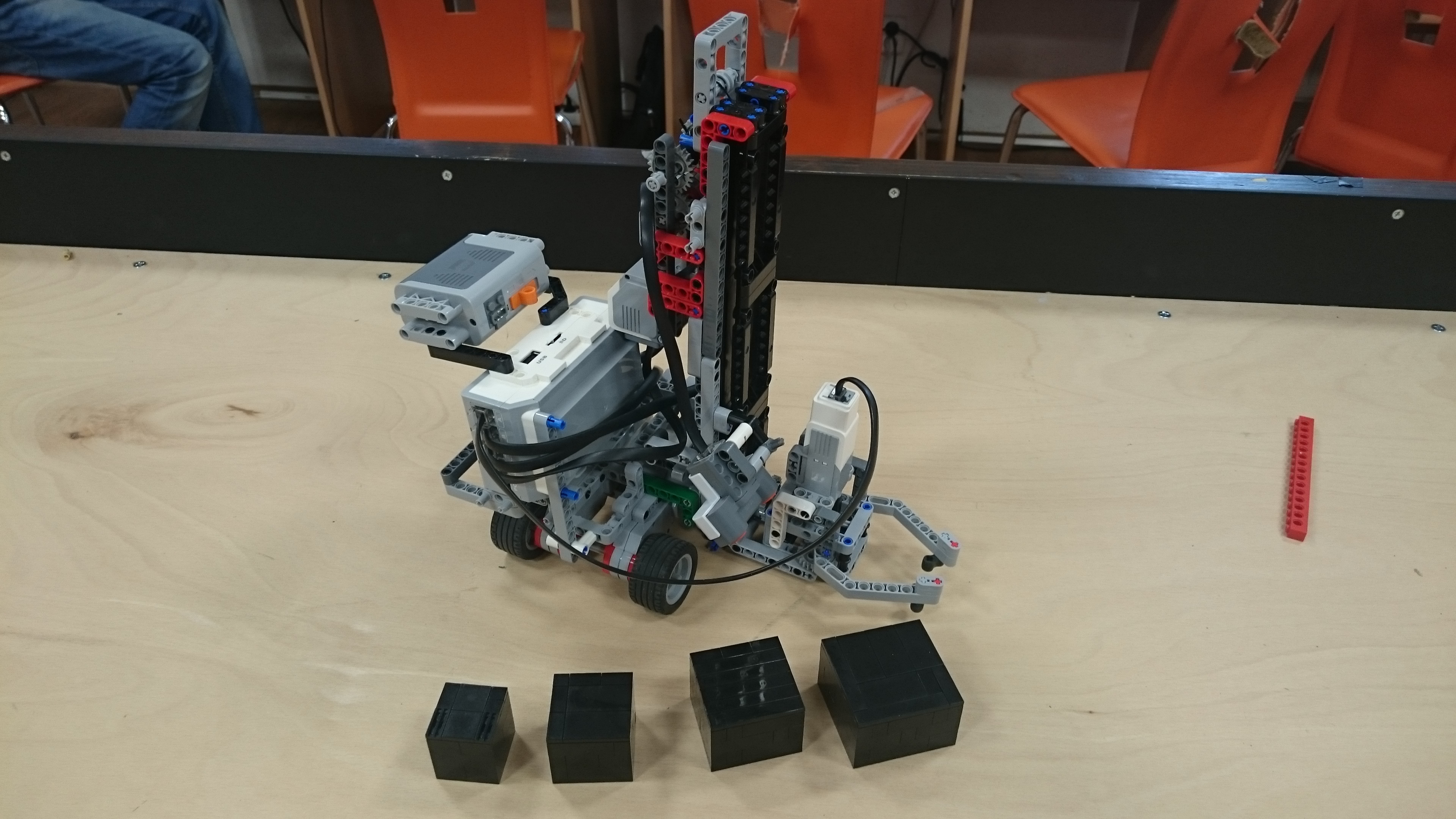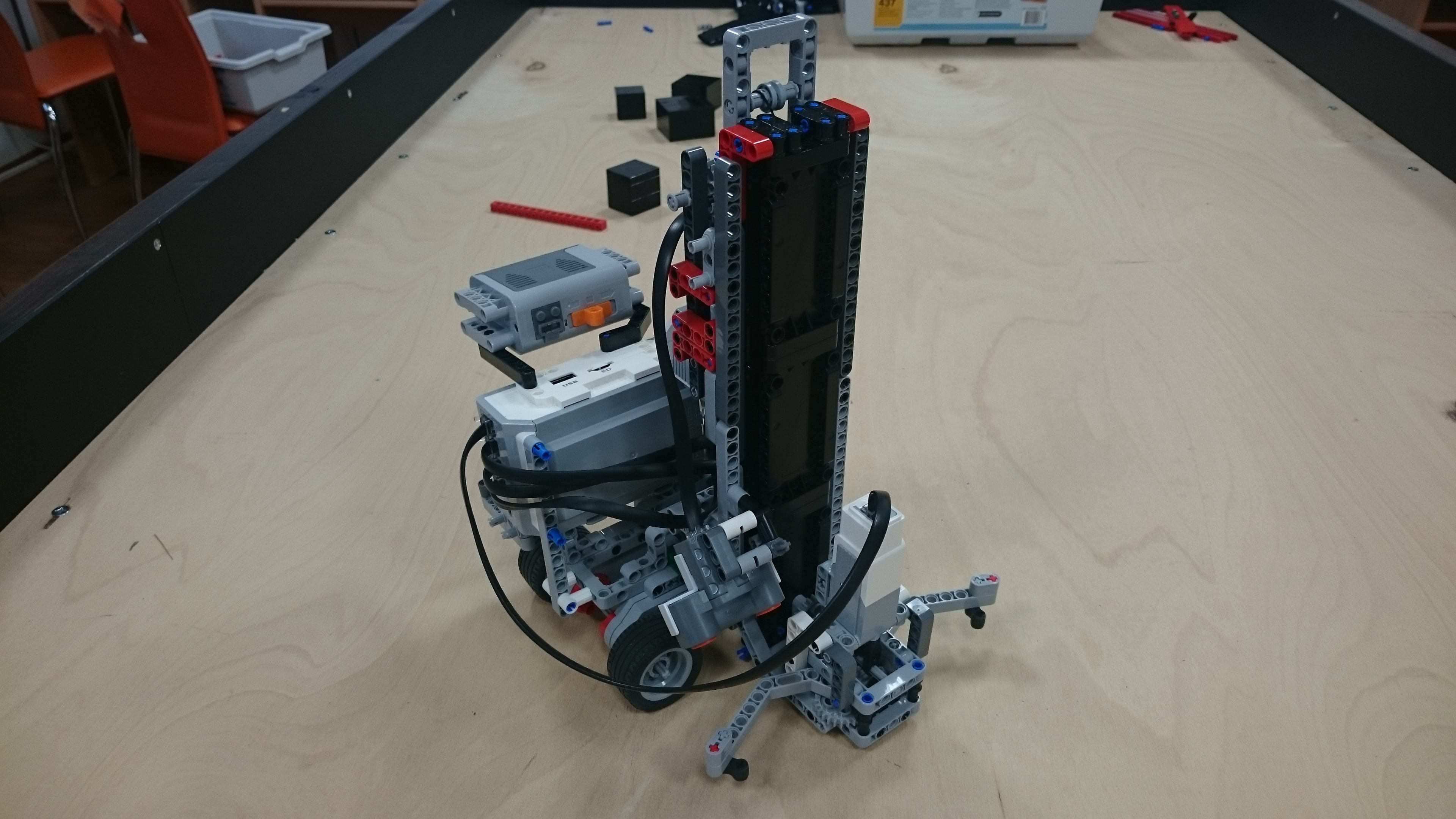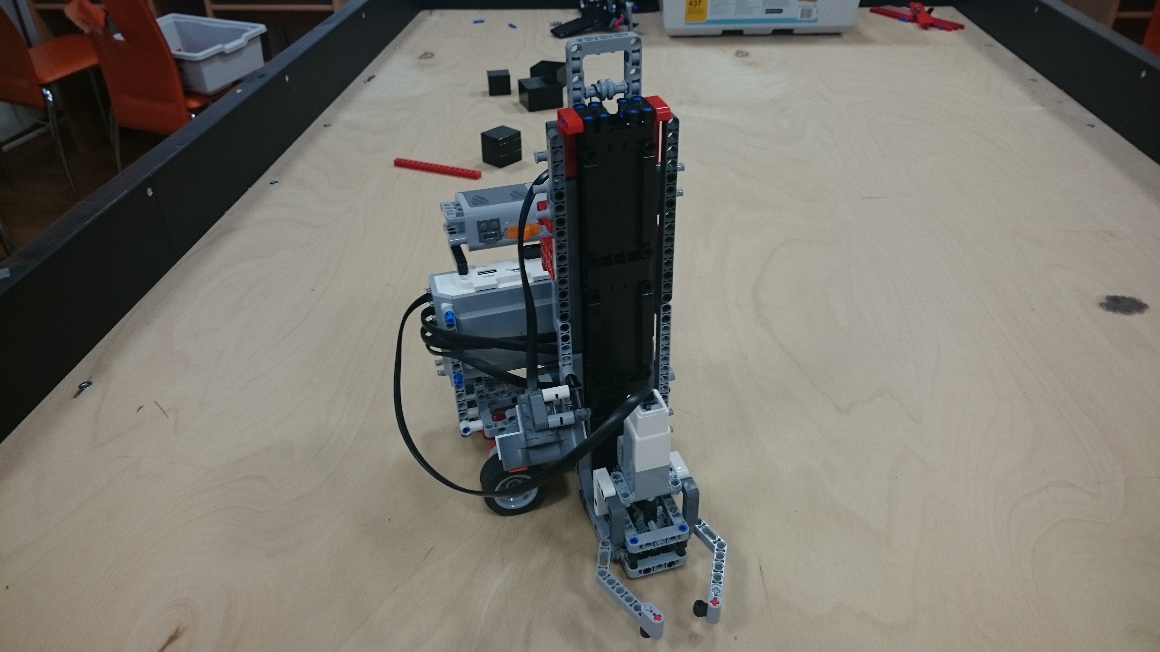 Pekár Robot: Náš robot má veľmi jednoduchú konštrukciu, má dva veľké motory s kolesami ako podvozok a na nich vysoko-zdvižnú vidlicu s klepetom trčiacim z boku robota, pri ktorom má ultrazvukový senzor. Vysoko-zdvižnú vidlicu zdvíha za pomoci navyjáku v zadnej časti, navíjaním šnúrky uchytenej na klepeto s malým motorčekom. Klepeto sa zatvára pomocou šnekovej prevodovky, aby sa z neho kváder nemohol uvolniť. Kvádre sme všetky zladili do čierna (aj keď na vrch namenšieho kvádra sme museli trochu improvizovať), a chceli sme ich spraviť v čo najpodobnejších veľkostiach (aby to bolo náročné pre robota), takže sú rozmerov: 4x4, 5x5, 6x6, 7x7 a všetky sú výšky 3. Program: Robot najprv vyhľadáva kvádre za pomoci ultrazvukového senzora tak, že si vždy zaznamená začiatok a koniec kvádra a potom prejde klepetom (väčšinov) presne do stredu kvádra (Vďaka tomu by mohol mať akékoľvek dlhé medzery medzi kvádrami). Vždy keď nejaký nájde, uchopí ho klepetom (zmeria si ho), zapíše si jeho veľkosť a priradí si rozmery k umiestneniu kvádra. Keď má už všetky zapísané vyhodnotí situáciu a vydá sa k najväčšiemu kvádru, chytí ho, zodvihne a odnesie na začiatok radu. Toto následne urobí so všetkými krádrami v poradí od najväčšieho po najmenší, pri čom zdvíha každý kváder vyššie ako predošlí. Robot zvláda program aj bez pomocnej steny, popri ktorej chodí, ale kvôli súťaži Protech, uzatváraniu známok a triednemu výletu sme nemali čas, takže sme videá museli natáčať len tak na rýchlo. Kvôli nedostatku času sme stihli iba 3 videá a aj to 2 z nich sme museli natáčať doma. Vesmírna loď Robot: Robot má jeden farebný senzor medzi kolesami v osi otáčania robota (senzor 1), a druhý vpredu (senzor 2). Vzadu má rameno za ktorým má panáčika, a vpredu má gyro-senzor na zaznamenávanie o koľko stupňov sa otočil. Program: Robot ide najprv dopredu, až kým nezaznamená senzorom 1 čiernu čiaru, potom sa otáča doľava, kým ju nezaznamená aj predným senzorom. Vtedy je presne zarovnaný o prvú čiernu čiaru a zresetuje si gyro-senzor. Potom ide po čiare (podľa gyro-sonzora), až kým nedojde senzorom 1 na jej koniec, potom sa otočí do prava tak, aby mal predný senzor na ďalšej čiernej čiare, a zapíše si jej uhol oproti prvej čiare. Robot má databázu všetkých uhlov, s ktorými sa v tomto súhvezdí môže stretnúť (zaokrúhľujú sa na desiatky), takže už pri prvom zmeranom uhle vie, čo má robiť, aby sa dostal na určenú čiaru (spojnicu prednej strany voza). Vo väčšine prípadov k nej ide priamo, ale ak to nie je možné, ide do stredu voza a z tade k nej. Keď sa na ňu dostane, čo najpresnejšie sa o ňu zarovná, prejde na jej koniec a potom ešte prejde jej vzdialenosť 4,3-krát (samozrejme podľa gyro-senzora). Na danom mieste (na Polárke) zdvihne rameno, tým vypustí panáčika a prejde trochu daľej.