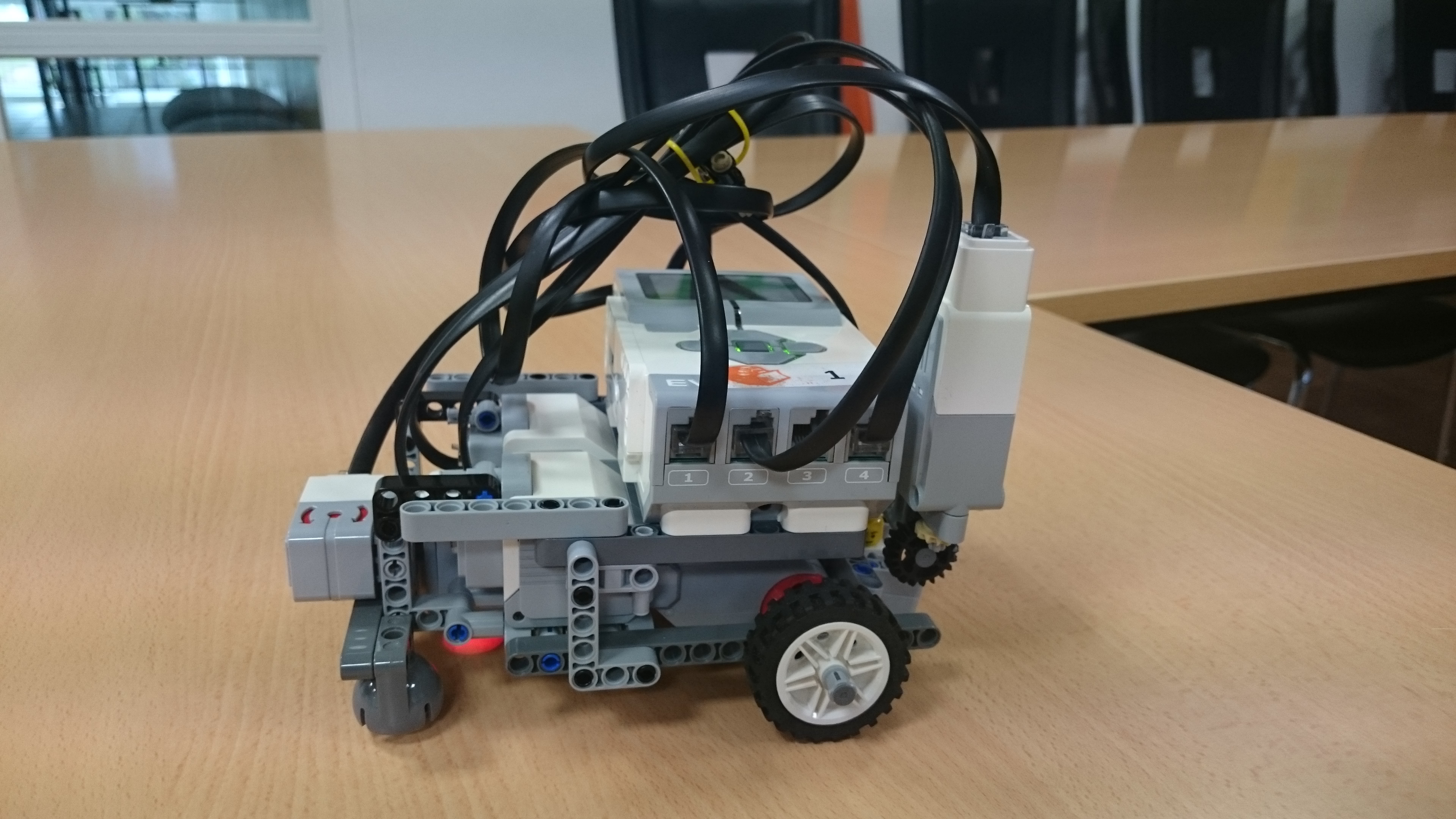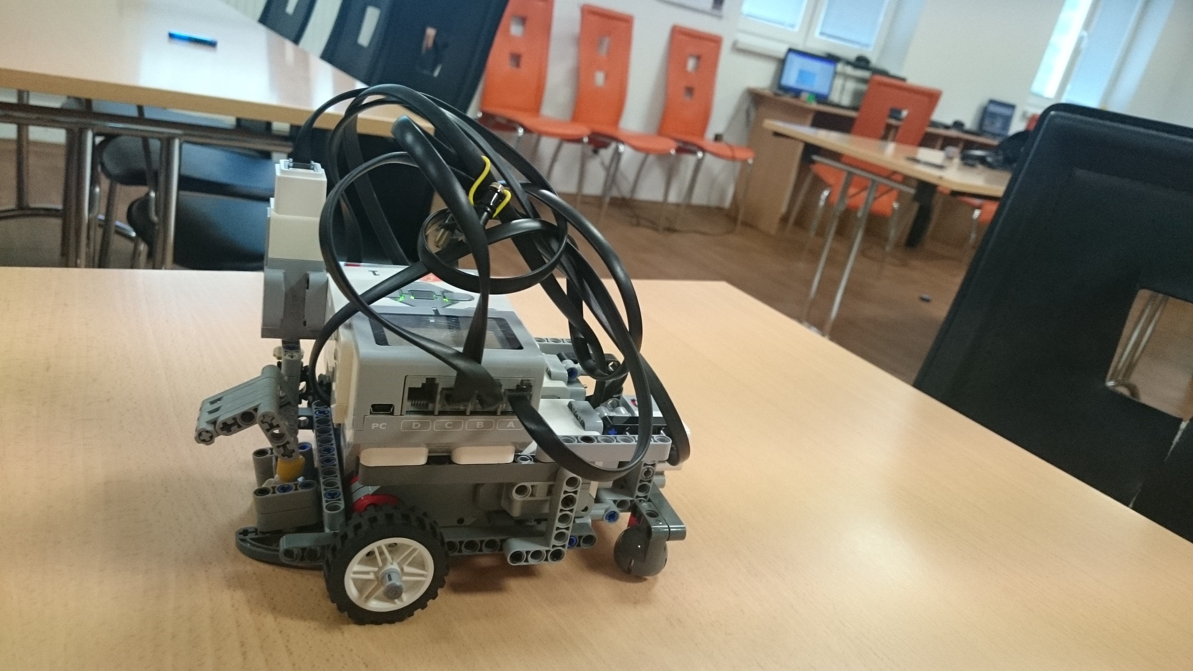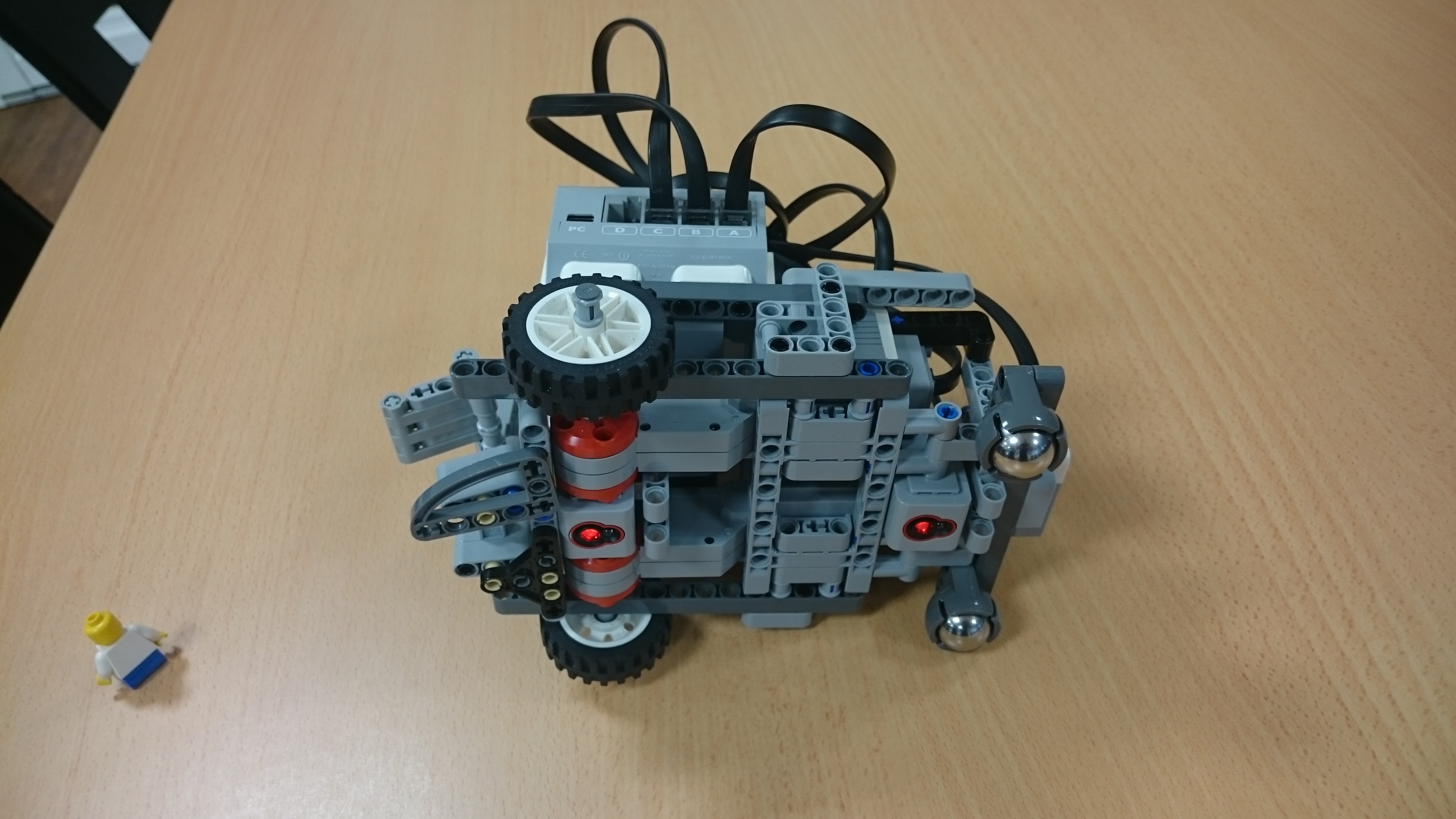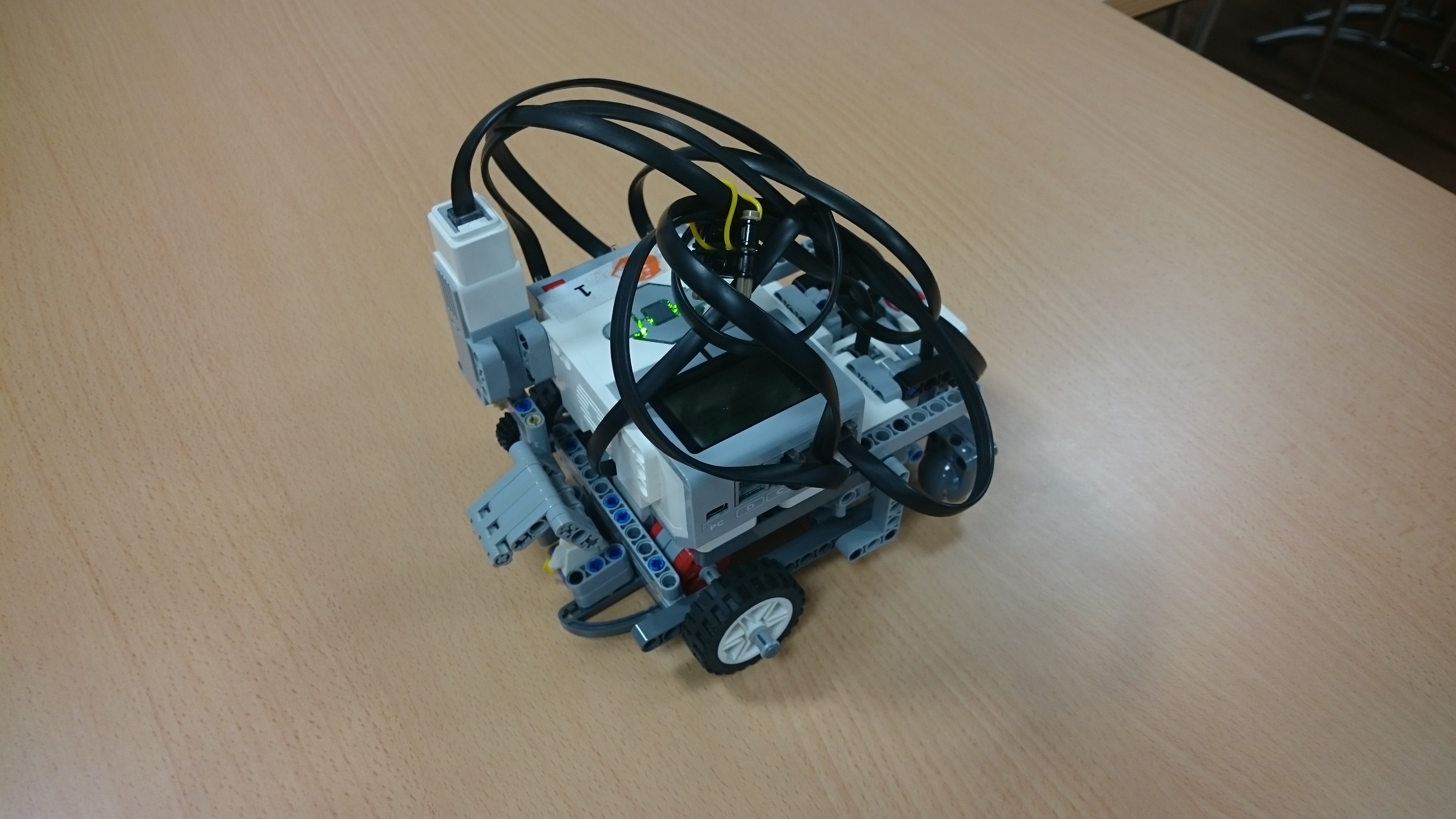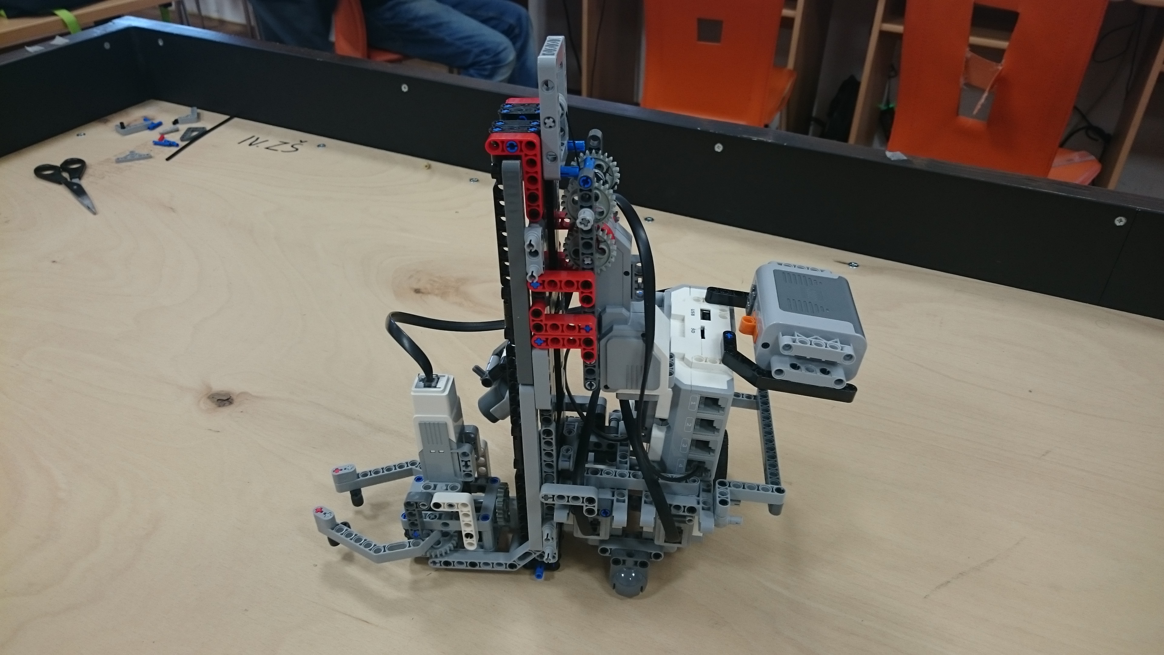 Pekár Robot: Náš robot má veľmi jednoduchú konštrukciu, má dva veľké motory s kolesami ako podvozok a na nich vysoko-zdvižnú vidlicu s klepetom trčiacim z boku robota, pri ktorom má ultrazvukový senzor. Vysoko-zdvižnú vidlicu zdvíha za pomoci navyjáku v zadnej časti, navíjaním šnúrky uchytenej na klepeto s malým motorčekom. Klepeto sa zatvára pomocou šnekovej prevodovky, aby sa z neho kváder nemohol uvolniť. Kvádre sme všetky zladili do čierna (aj keď na vrch namenšieho kvádra sme museli trochu improvizovať), a chceli sme ich spraviť v čo najpodobnejších veľkostiach (aby to bolo náročné pre robota), takže sú rozmerov: 4x4, 5x5, 6x6, 7x7 a všetky sú výšky 3. Program: Robot najprv vyhľadáva kvádre za pomoci ultrazvukového senzora tak, že si vždy zaznamená začiatok a koniec kvádra a potom prejde klepetom (väčšinov) presne do stredu kvádra (Vďaka tomu by mohol mať akékoľvek dlhé medzery medzi kvádrami). Vždy keď nejaký nájde, uchopí ho klepetom (zmeria si ho), zapíše si jeho veľkosť a priradí si rozmery k umiestneniu kvádra. Keď má už všetky zapísané vyhodnotí situáciu a vydá sa k najväčšiemu kvádru, chytí ho, zodvihne a odnesie na začiatok radu. Toto následne urobí so všetkými krádrami v poradí od najväčšieho po najmenší, pri čom zdvíha každý kváder vyššie ako predošlí. Robot zvláda program aj bez pomocnej steny, popri ktorej chodí, ale kvôli súťaži Protech, uzatváraniu známok a triednemu výletu sme nemali čas, takže sme videá museli natáčať len tak na rýchlo. Kvôli nedostatku času sme stihli iba 3 videá a aj to 2 z nich sme museli natáčať doma. Vesmírna loď Robot: Robot má jeden farebný senzor medzi kolesami v osi otáčania robota (senzor 1), a druhý vpredu (senzor 2). Vzadu má rameno za ktorým má panáčika, a vpredu má gyro-senzor na zaznamenávanie o koľko stupňov sa otočil. Program: Robot ide najprv dopredu, až kým nezaznamená senzorom 1 čiernu čiaru, potom sa otáča doľava, kým ju nezaznamená aj predným senzorom. Vtedy je presne zarovnaný o prvú čiernu čiaru a zresetuje si gyro-senzor. Potom ide po čiare (podľa gyro-sonzora), až kým nedojde senzorom 1 na jej koniec, potom sa otočí do prava tak, aby mal predný senzor na ďalšej čiernej čiare, a zapíše si jej uhol oproti prvej čiare. Robot má databázu všetkých uhlov, s ktorými sa v tomto súhvezdí môže stretnúť (zaokrúhľujú sa na desiatky), takže už pri prvom zmeranom uhle vie, čo má robiť, aby sa dostal na určenú čiaru (spojnicu prednej strany voza). Vo väčšine prípadov k nej ide priamo, ale ak to nie je možné, ide do stredu voza a z tade k nej. Keď sa na ňu dostane, čo najpresnejšie sa o ňu zarovná, prejde na jej koniec a potom ešte prejde jej vzdialenosť 4,3-krát (samozrejme podľa gyro-senzora). Na danom mieste (na Polárke) zdvihne rameno, tým vypustí panáčika a prejde trochu daľej.