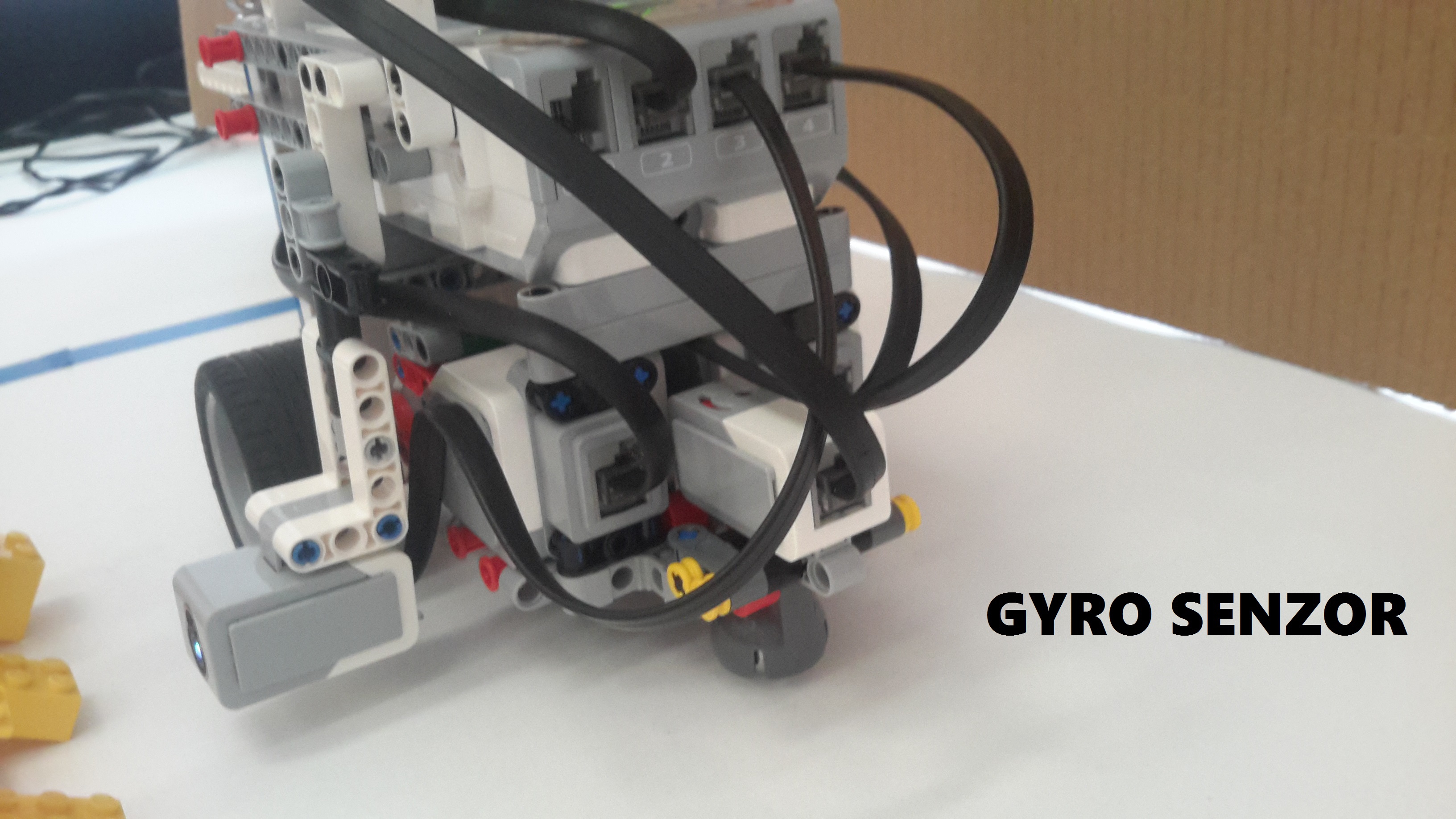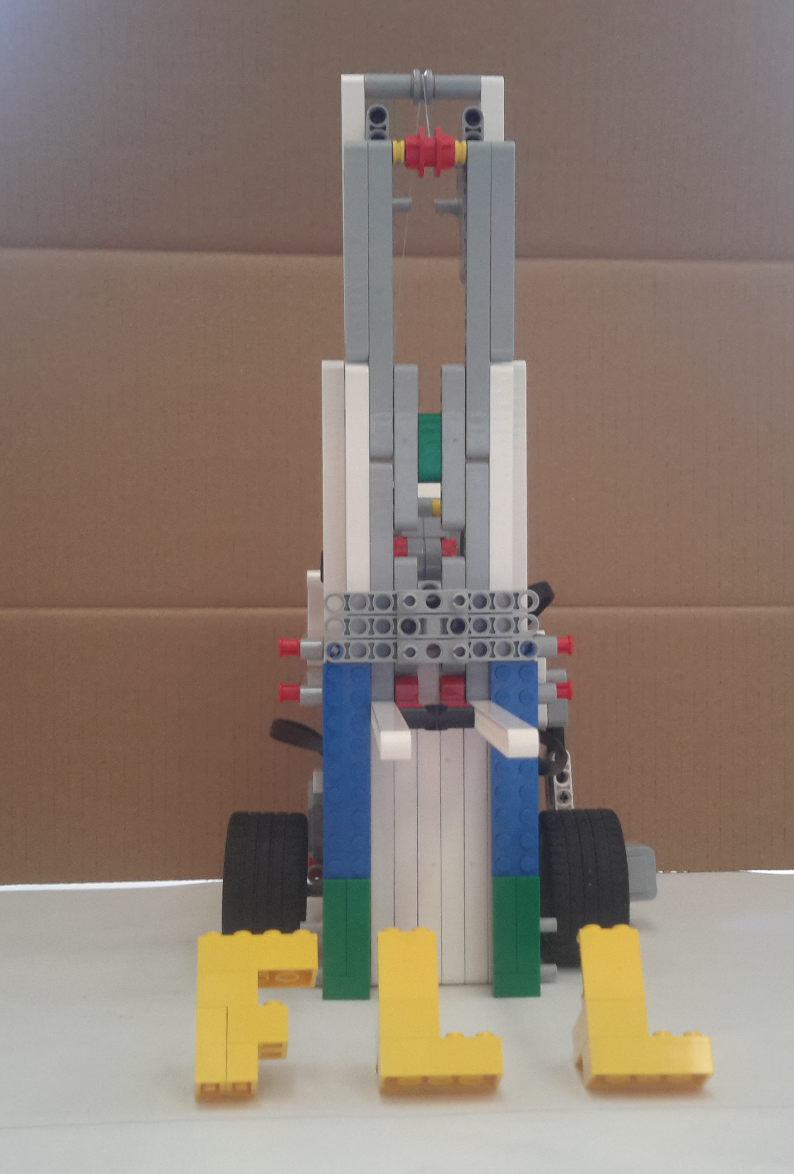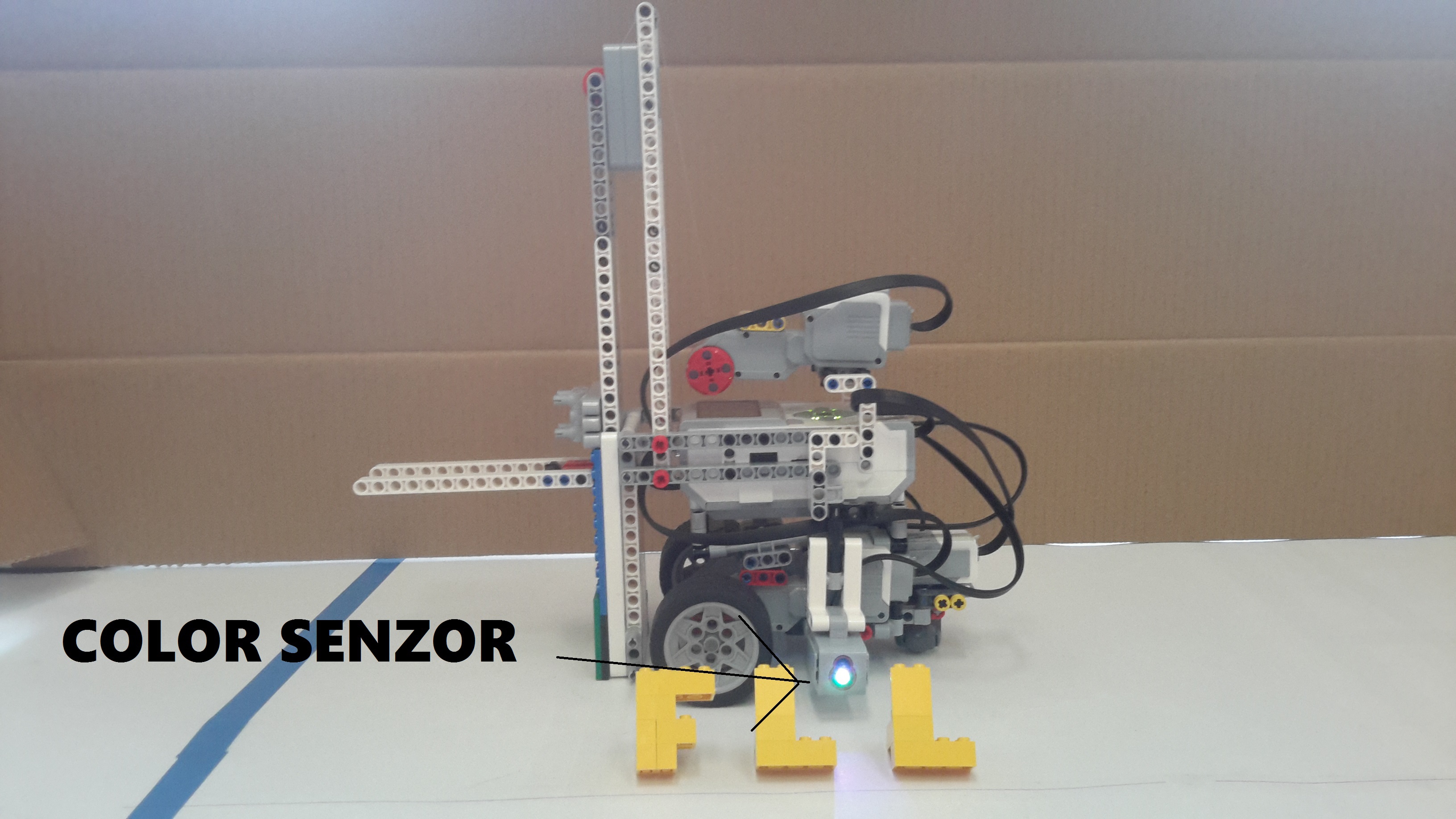 Robot funguje na princípe vysokozdvižného vozíka poháňaného veľkým motorom . Má 2 farebné senzory: jeden smerom k zemi na detekciu „štartu“ a miesta kde bude torta. Druhý pomáha zistiť, aký "veľký" je „korpus“ pred ním. Použili sme taktiež gyroskopický senzor na presnejšie otáčanie o 90°. Program začína tým, že robot zdvíha plošinu a hľadá zelenú, čiže najväčšiu kocku pomocou farebného senzora. Keď ju nájde, otočí sa o 90 stupňov pomocou gyro senzora, naberie zelenú časť, cúvne, otočí sa pomocou gyro a ide k miestu na tortu. Zastaví sa na červenej čiare, ktorá symbolizuje koniec dráhy. Keď sa po vyložení vráti, zastane na modrej štartovacej čiare.Takto postupne nájde, naberie, prenesie a vyloží všetky kocky. Riešenie funguje pri akomkoľvek poradí kociek, pretože farebný senzor rozpozná tú správnu farbu. Prvý korpus je zelený, naň kladieme červený, potom modrý a posledný žltý korpus. Dobrú chuť!