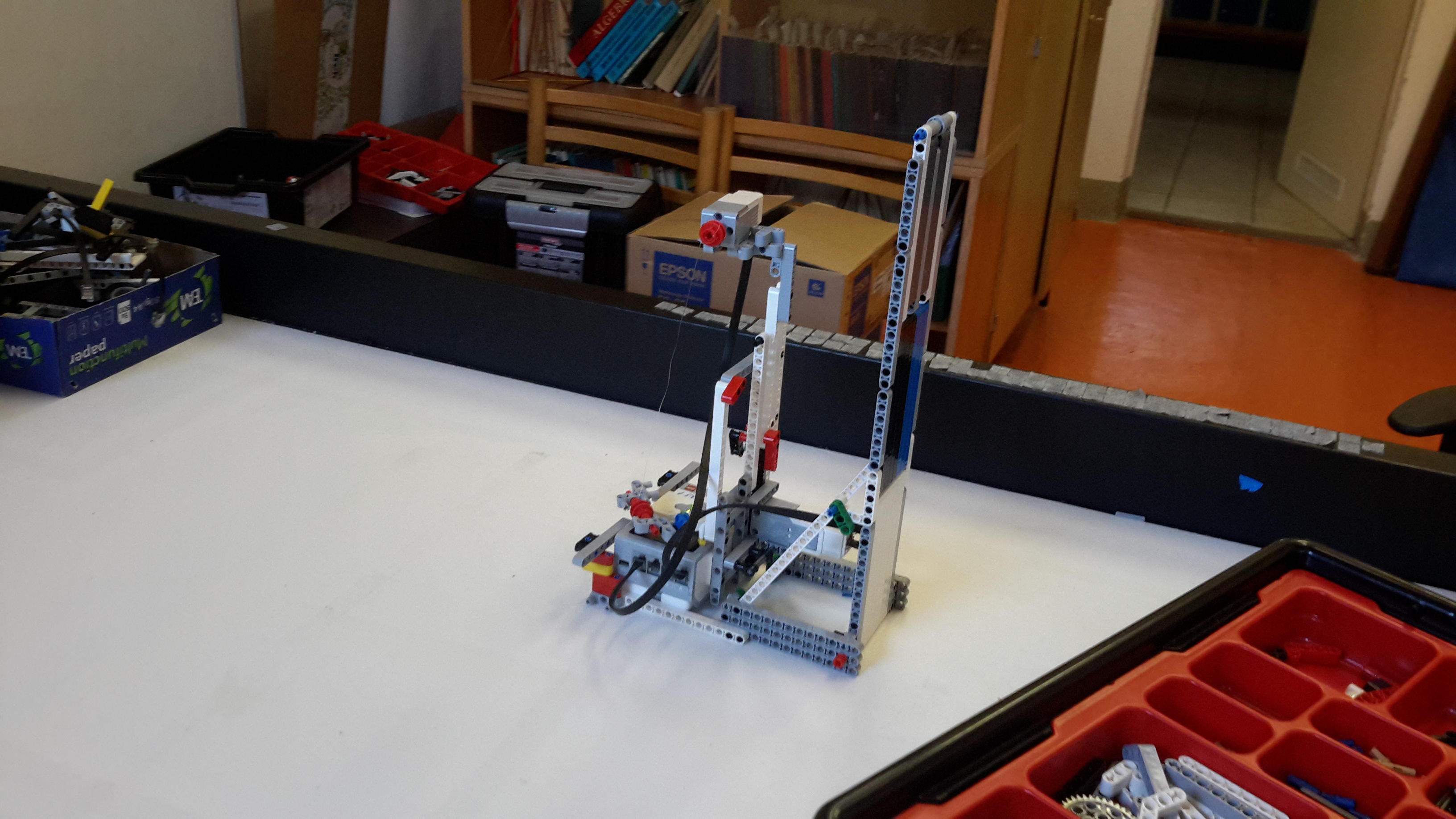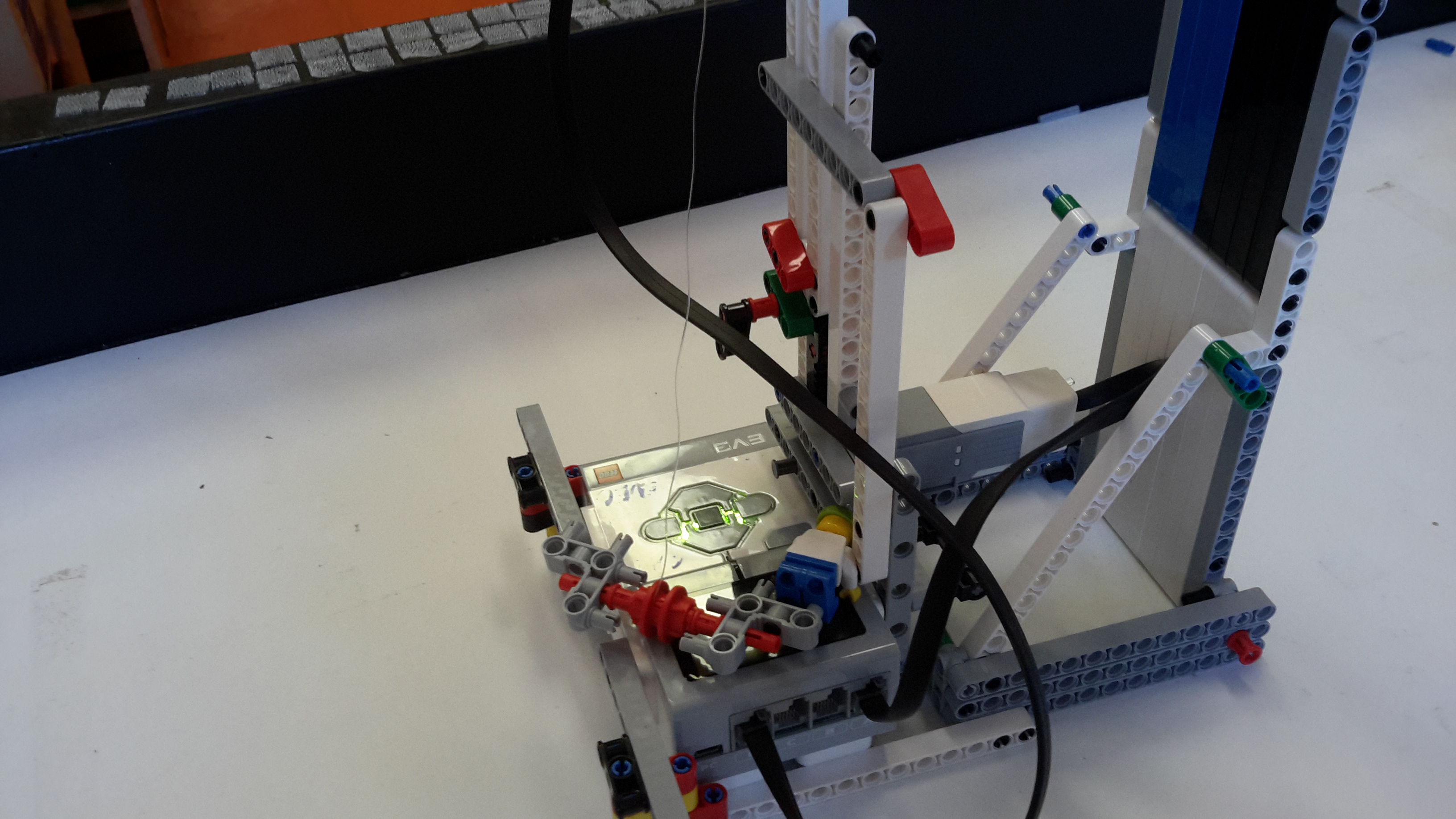 Preto sme sa rozhodli riešiť aj druhú úlohu prázdniny (viď. obr. robot1 až robot3). Naša konštrukcia robota obsahuje výsuvné rameno s 2 strednými motormi. Jeden zvislo vysúva a zasúva rameno robota, druhý vytiahne študenta hore a za plotom ho spustí. A plot je prelezený a prázdniny môžu začať.