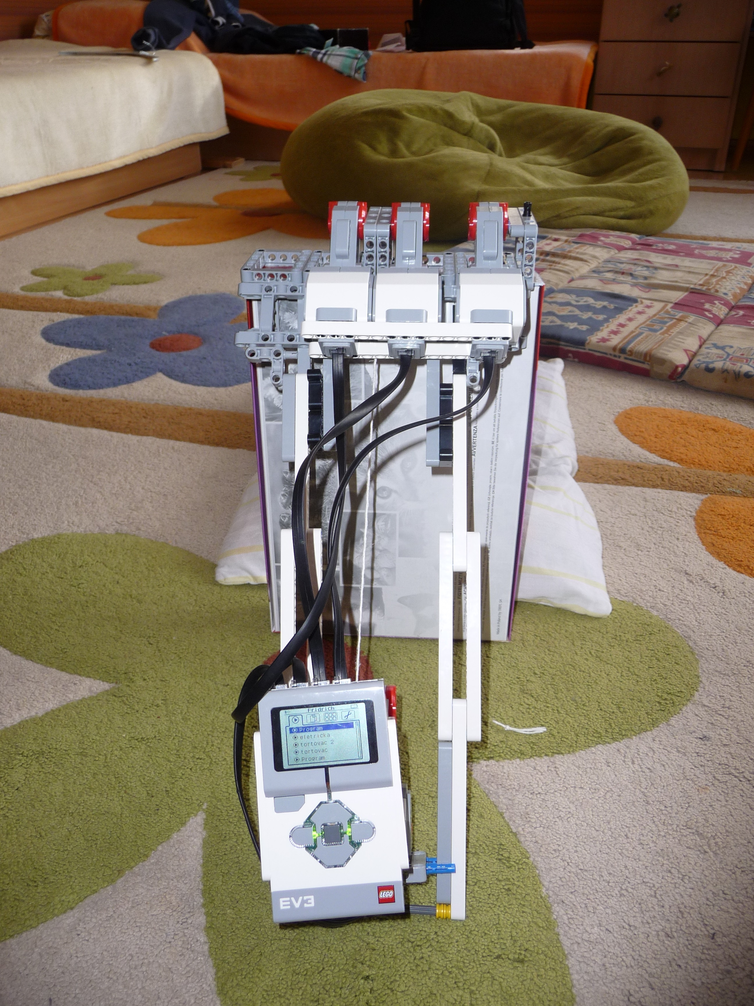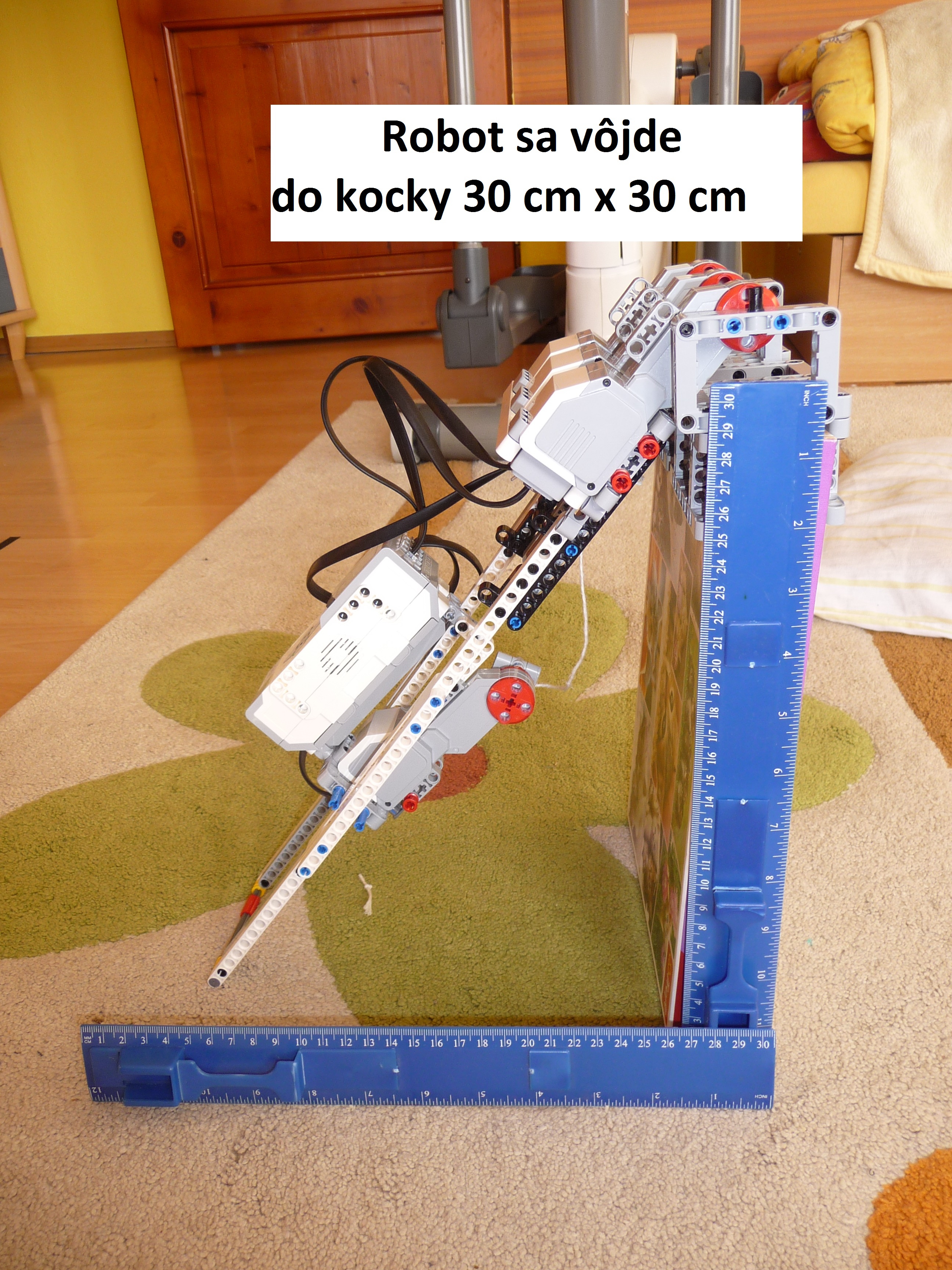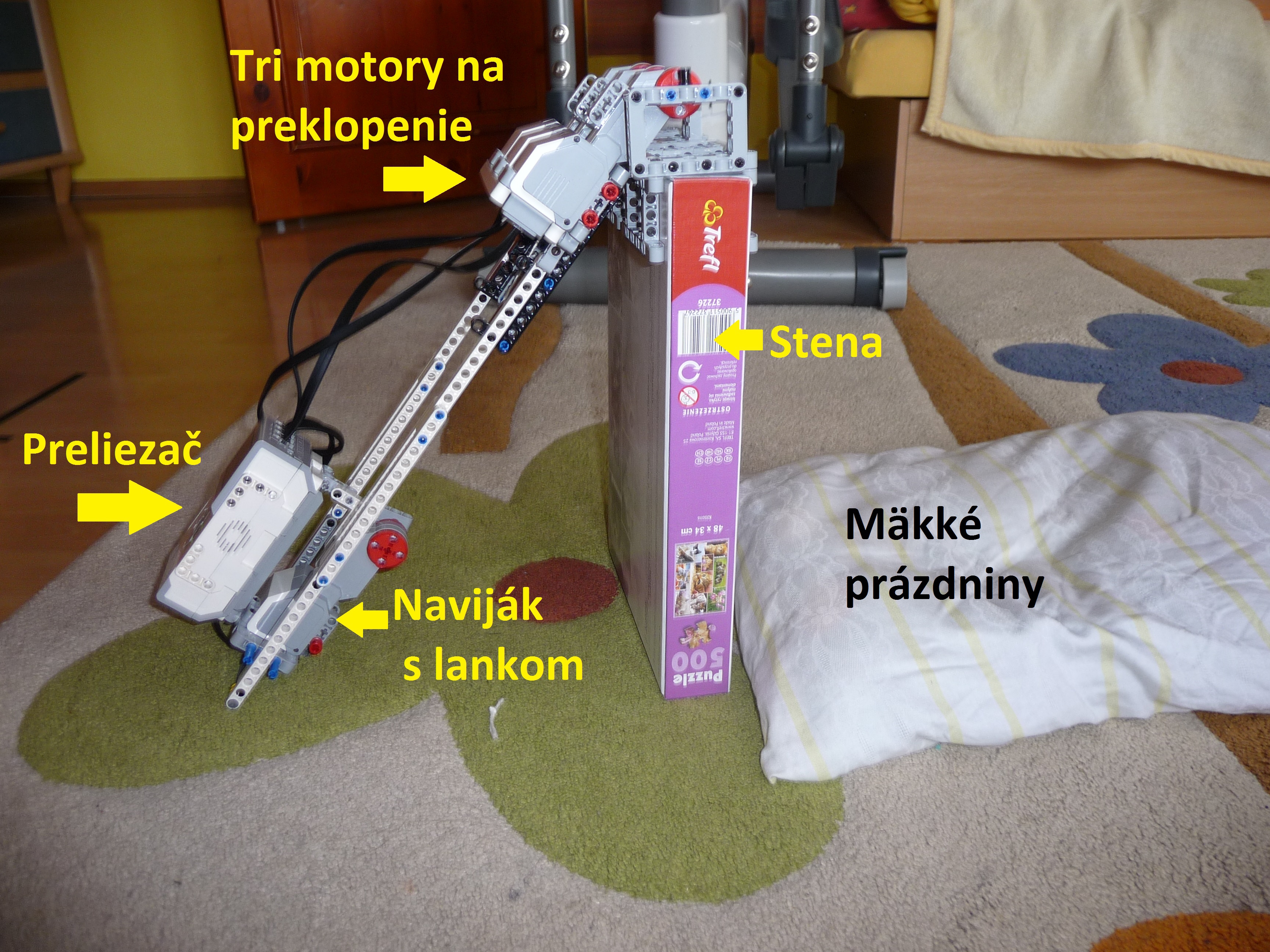 Preliezač: Robot príde k stene tým, že sa vytiahne za pomoci navijaka a vylezie po rebríku. Pomocou 3 motorov (trochu nevládali preklopiť rebrík) preklopí rebrík na druhú stranu steny a znova za pomoci navijaku a lanka zlezie po rebríku na zem. Aby mäkko zoskočil na prázdniny, má tam pripravený vankúš. Potom môže robot isť smelo na prázdniny. Ospravedlňujeme sa, video je na začiatku trochu trhaná ale zvuk je možné počuť. ----- Konštrukcia: Navijak, ktorým robot vylezie po rebríku je urobený z malého motora a lanka upevneného k k rebríku. Celý rebrík sa preklopí pomocou 3 motorov (viac sa nedalo použiť - iba štyri výstupy). Robot sa vojde do kocky 30 x 30 cm - síce po uhlopriečke. ------- Program: jednoduchý program na točenie motorom navijaka a na preklopenie rebríka. ---- Keďže sa na konci školského roka finišovalo kvôli známkam a tiež sme boli na koncoročnom výlete, nedokázali sme robota dostatočne vylepšiť. Pôvodne mal rebrík priniesť a zavesiť ho na stenu pomocou hrebeňa, ale ten nebol dostatočne dlhý. Preto sme použili rebrík zavesený na stene a navijak.