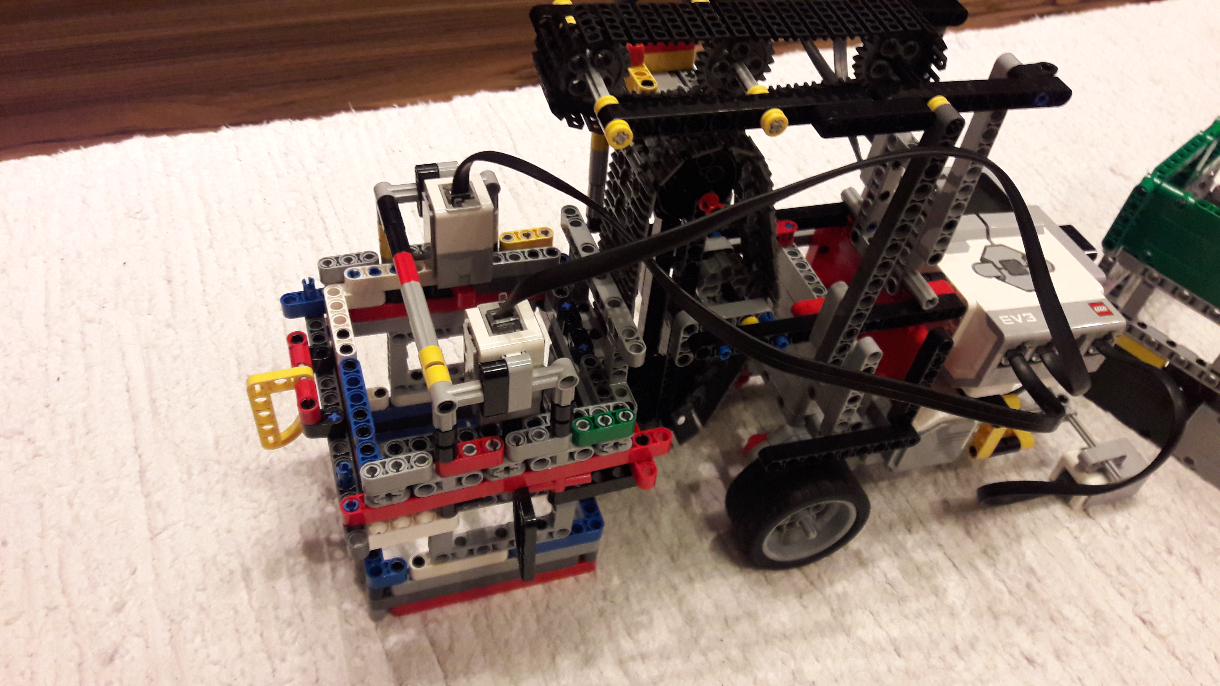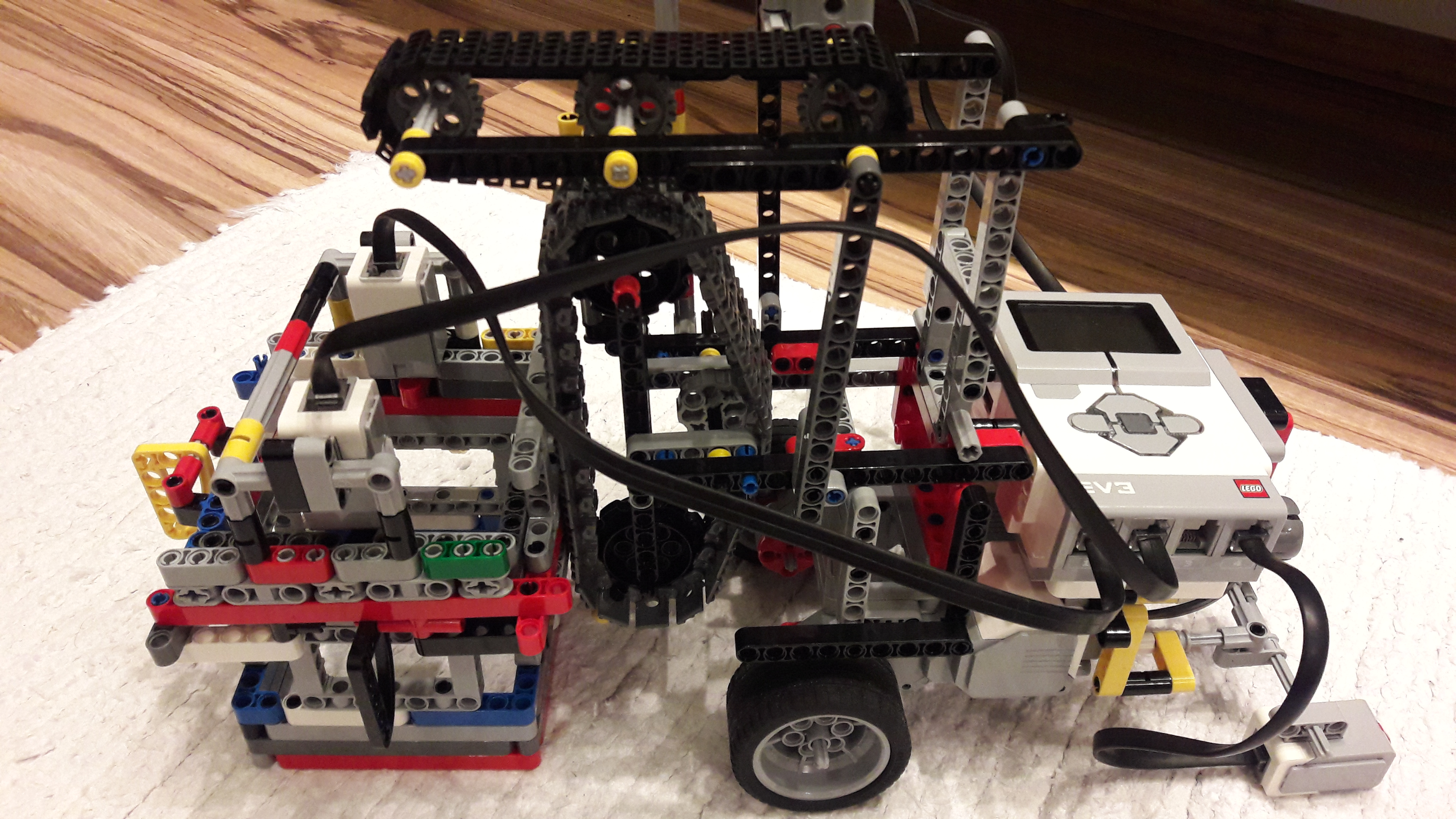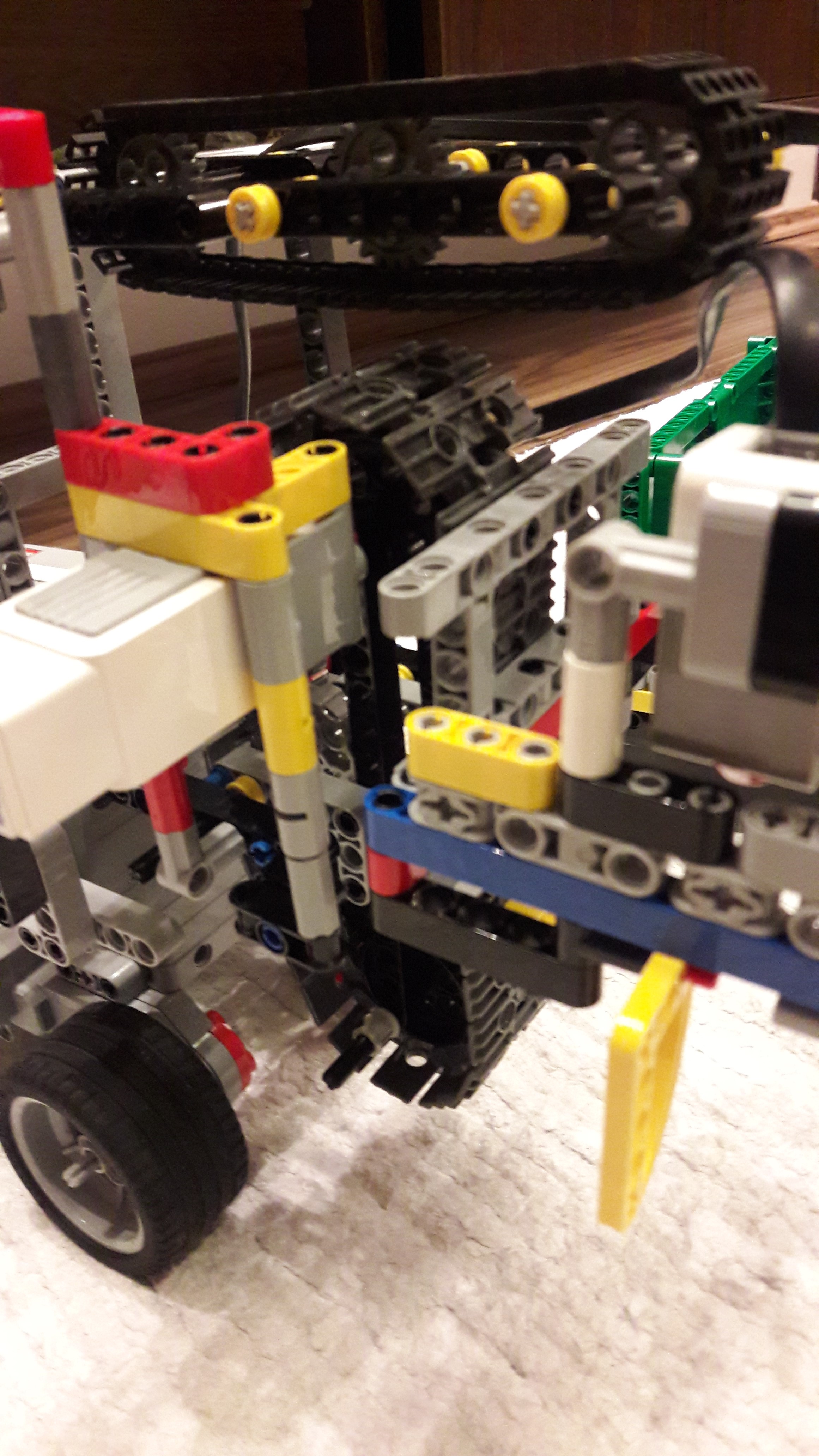 Náš postup: 1.Najprv sme postavili podvozok s dvoma large motormi a pripevnili tlakový senzor, ktorý použijeme na určenie veľkého koša, lebo je umiestnený tak, aby bol vo väčšej vzdialenosti ako je šírka malej nádoby.