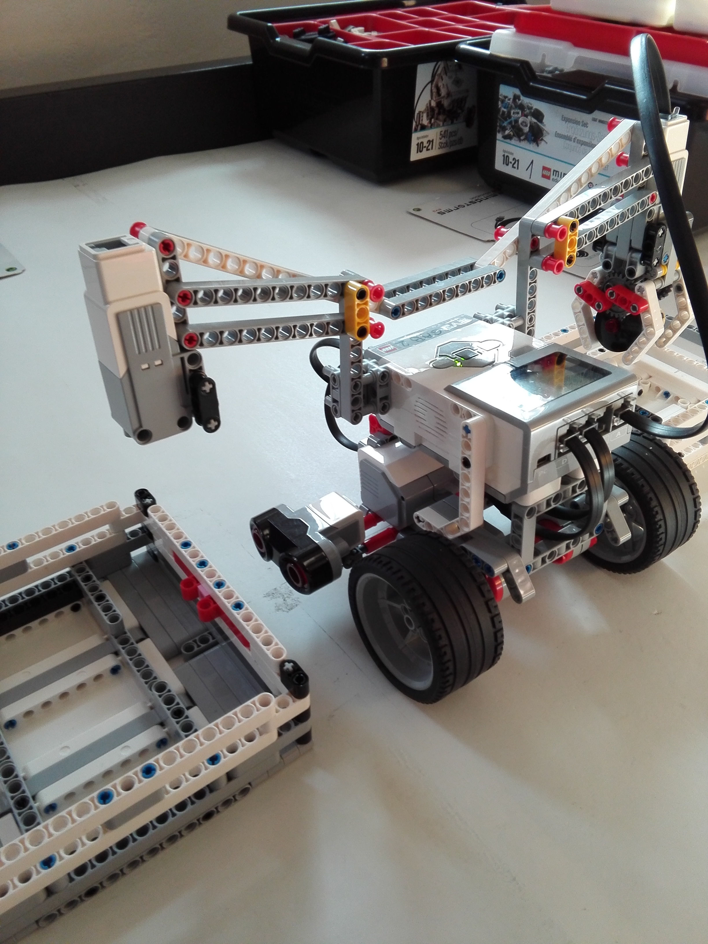 Robot pozostáva z kocky a dvoch veľkých motorov, z ktorých každý ovláda jedno koleso a jedného stredného motora, ktorý ovláda rameno, ktoré drží odpad. Použili sme aj ultrazvukový senzor, ktorým meriame vzdialenosť od prekážky.