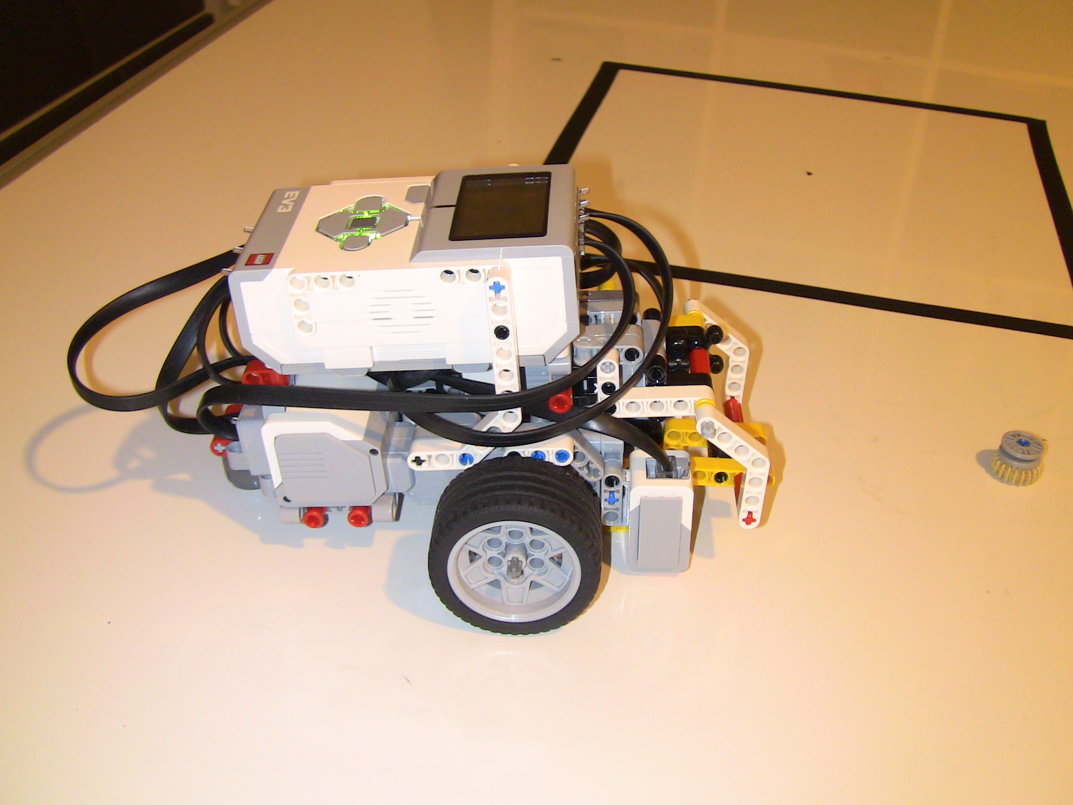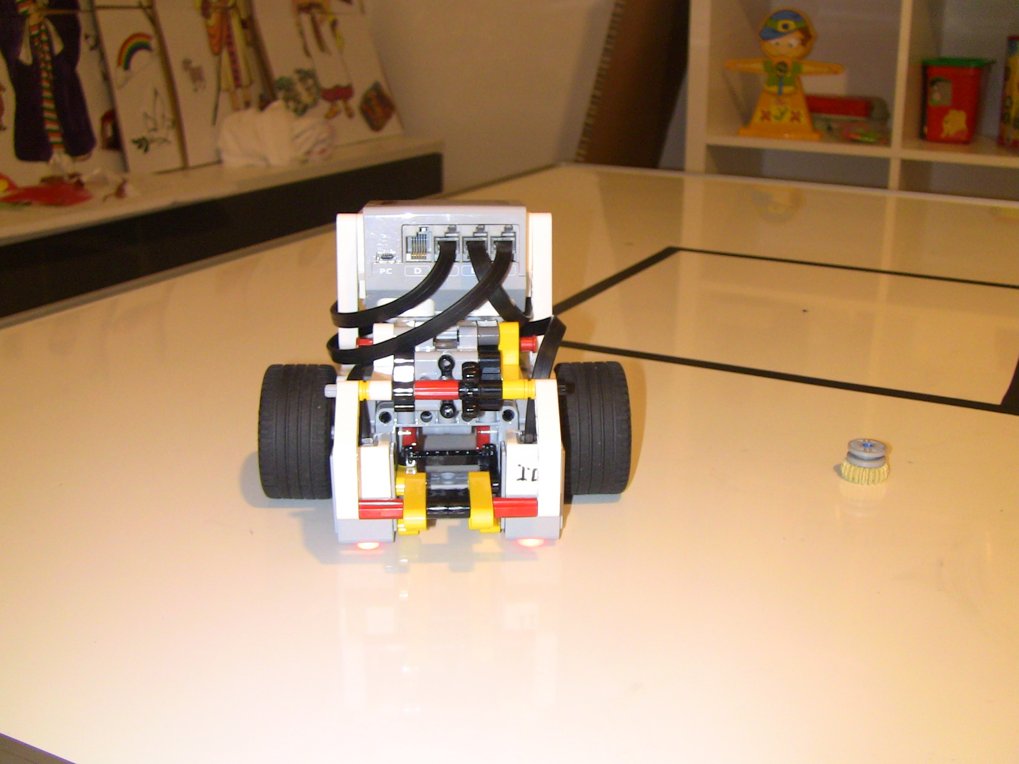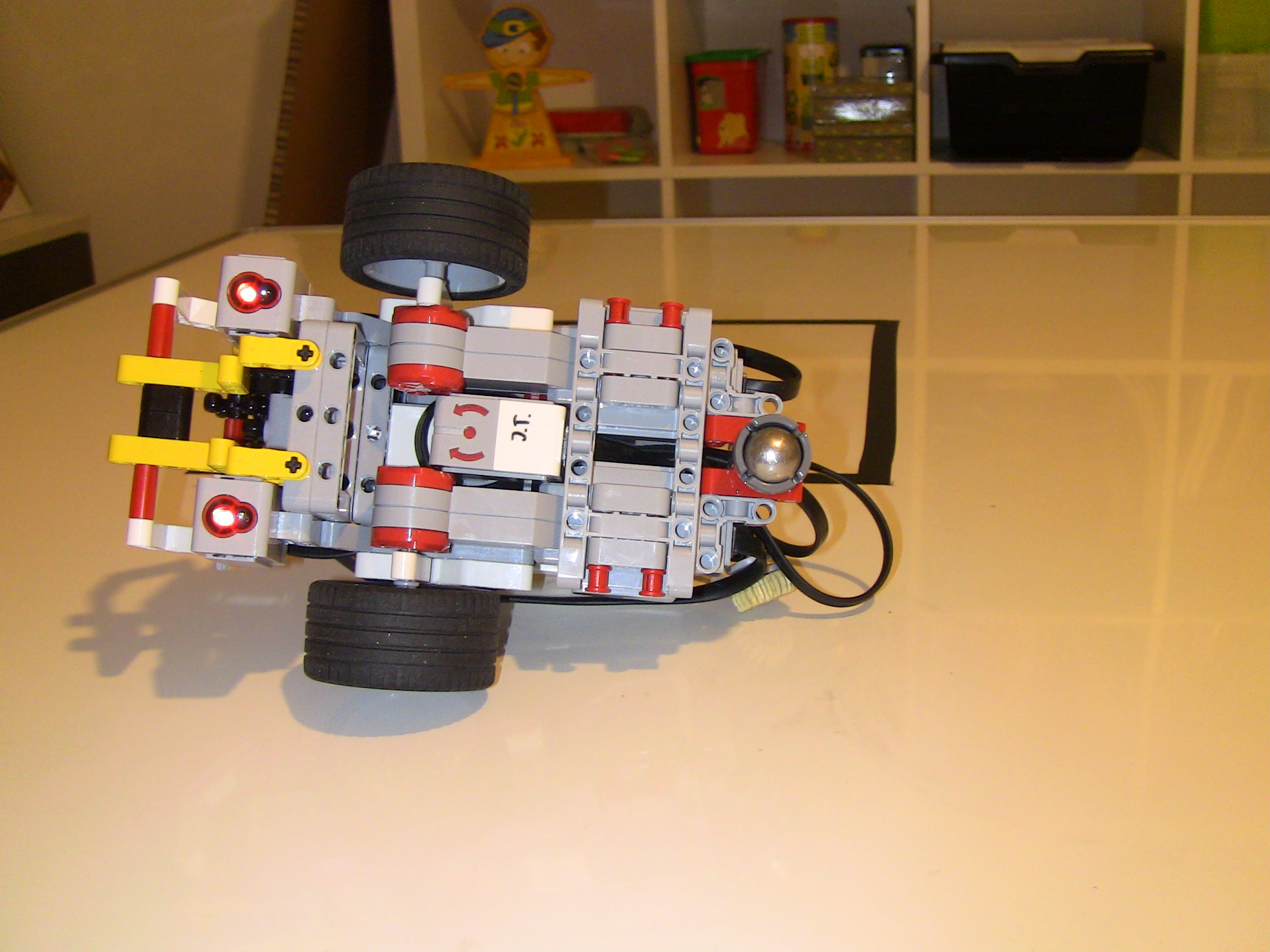 1. Za úlohu presné umiestnenie získavate 2,7b. Popis, video a program je v poriadku, ale chýba mi fotka tímu. Body: 2.7 2. Myslím, že tam máte zopár zbytočných pohybov, napríklad pri prvom určení stredu sa predsa nemusí robot vracať na základnú čiaru, už na konci by mal vedieť, o koľko má zacúvať. A ešte je škoda, že ste neukázali viac ako jeden prípad. Body: 2.2 3. Dobrá práca. Páči sa mi, že ste použili gyro senzor na otáčanie a nepoužívate pevnú hodnotu. Body: 3 4. Oceňujem hudobné osvieženie, ktoré robot vydáva. Viacnásobné premeranie vnútornej strany štvorca je zaujímavé, nie som si však istá, nakoľko prispieva k presnejšiemu výsledku. V konečnom dôsledku však ovca naozaj bola položená na stred. Bolo by zaujímavé vidieť na videu aj riešenie pre inú veľkosť štvorca. Body: 3 Celkový počet: 2.73
