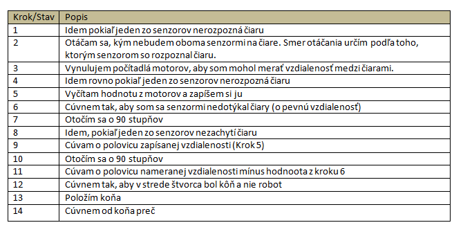 Milí organizátori letnej ligy, predstavujeme vám nášho robota, ktorý rieši úlohu presné umiestnenie.Robot sa orientuje pomocou 2 senzorov.Jeden z nich je HLAVNÝ, ten je umiestnený presne v strede medzi dvoma kolesami.Druhý, VEDĽAJŠÍ, slúži na to, aby robot vedel pomocou dvoch senzorov zastať presne na čiare.Malý motor pomocou paličky položí koňa.Veľké motory slúžia na pohyb. Tým, že sú umiestnené ďaleko od seba, umožňujú veľmi presný pohyb pri otáčaní.Stratégia, akou robot hľadá stred štvorca, je popísaná na obrázkoch. (prílohy)Tešíme sa na ďalšie úlohy!2H teamAdam a Sebi