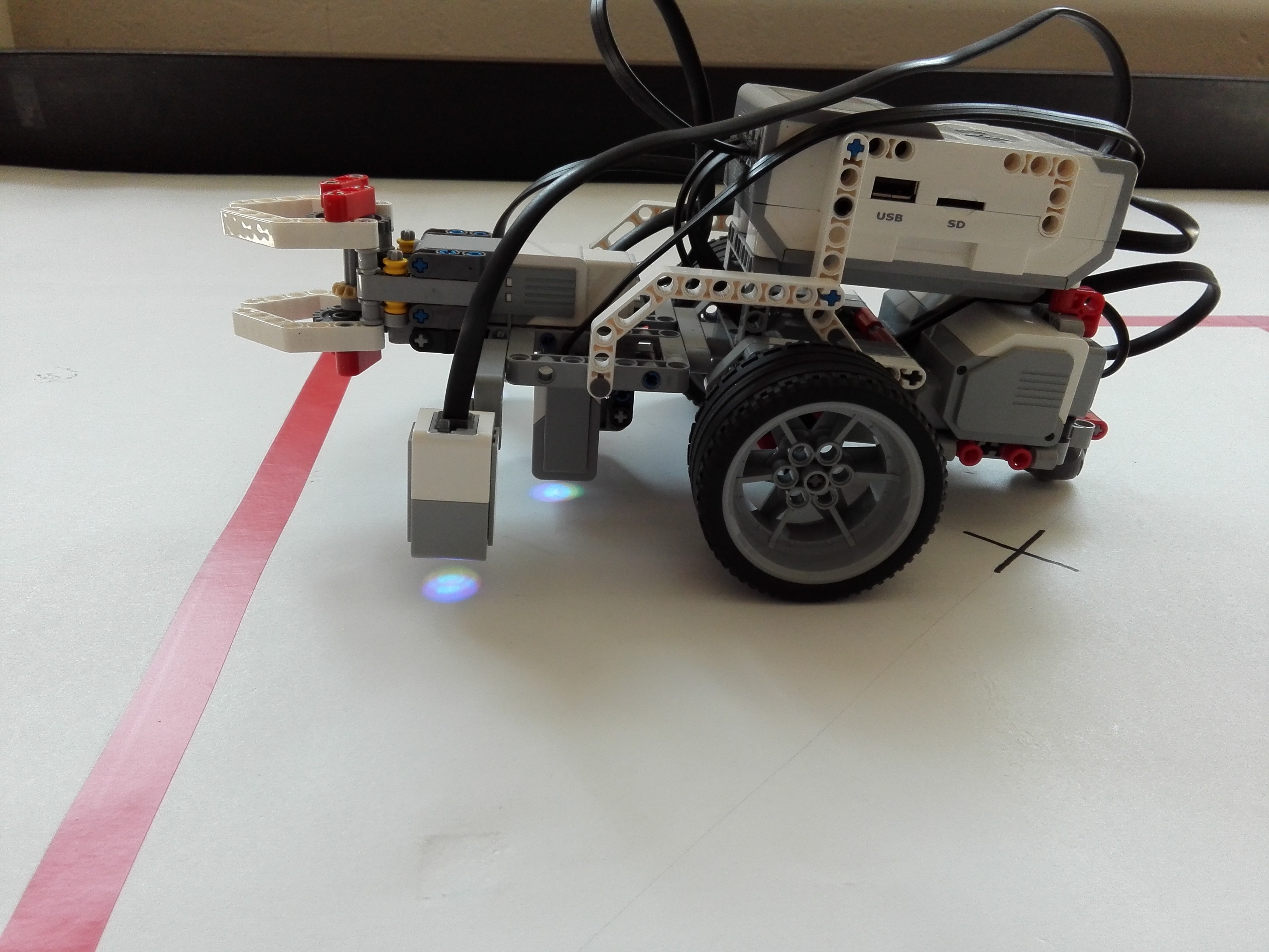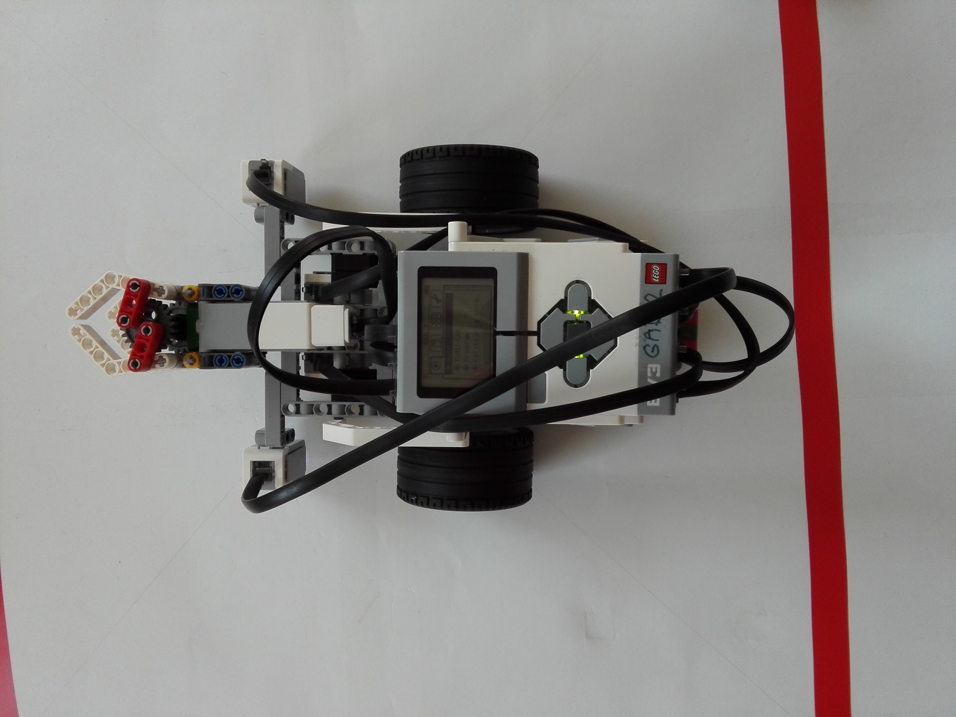 Robot sa skladá z 3 motorov a 4 senzorov. 2 veľké motory slúžia na pohon robota a 1 stredný pohybuje "klepetami" na ramene, aby spustil ovečku. Všetky 4 senzory sú farebné senzory, ktorými sa robot orientuje po štvorci - zaznamenáva rozdiely medzi bielou plochou a červenou páskou pričom 2 senzory, ktoré sú bližšie k stredu robota sú pre plynulé sledovanie čiary a 2 vonkajšie slúžia na zaregistrovanie odbočky v rohu štvorca.