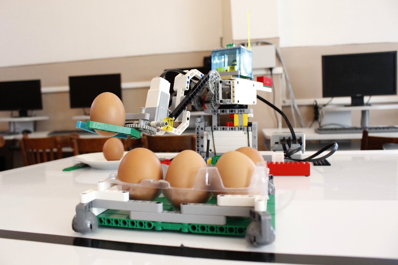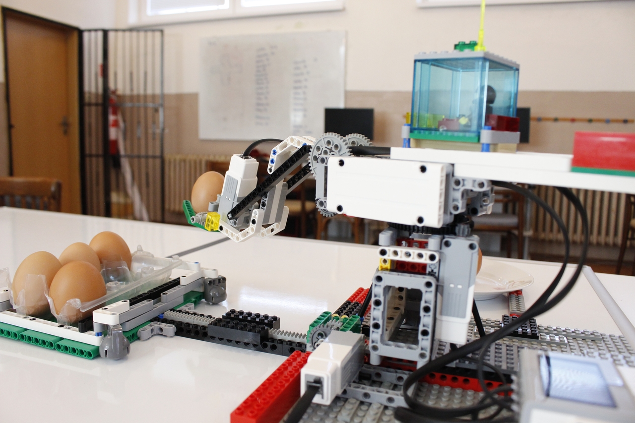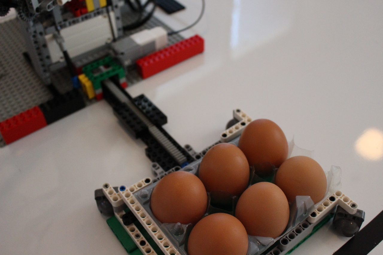 Pri tejto úlohe sme postavili robotický žeriav, ktorý ukladá vajíčka do krabičky. Využili sme 4 motory: