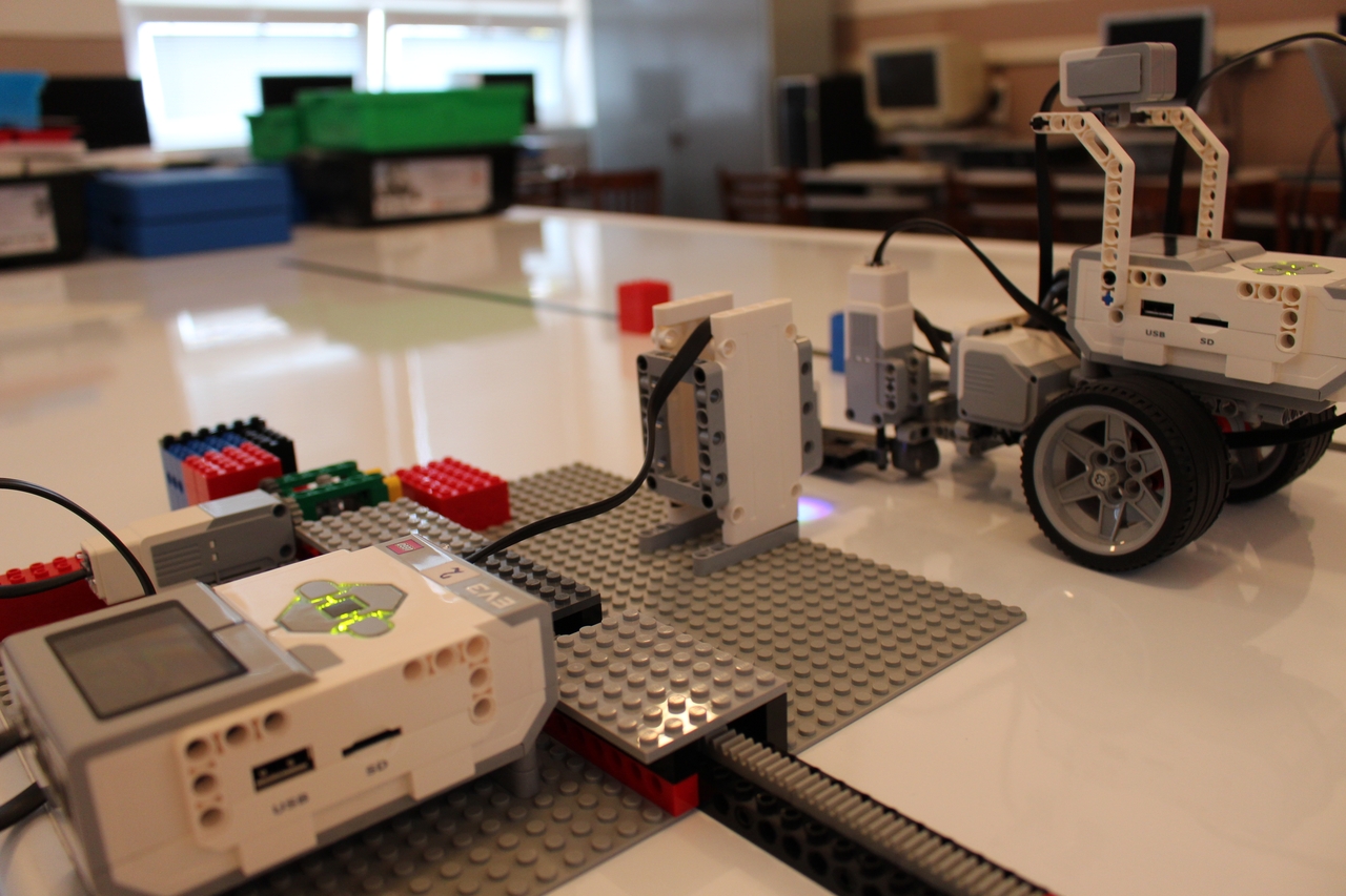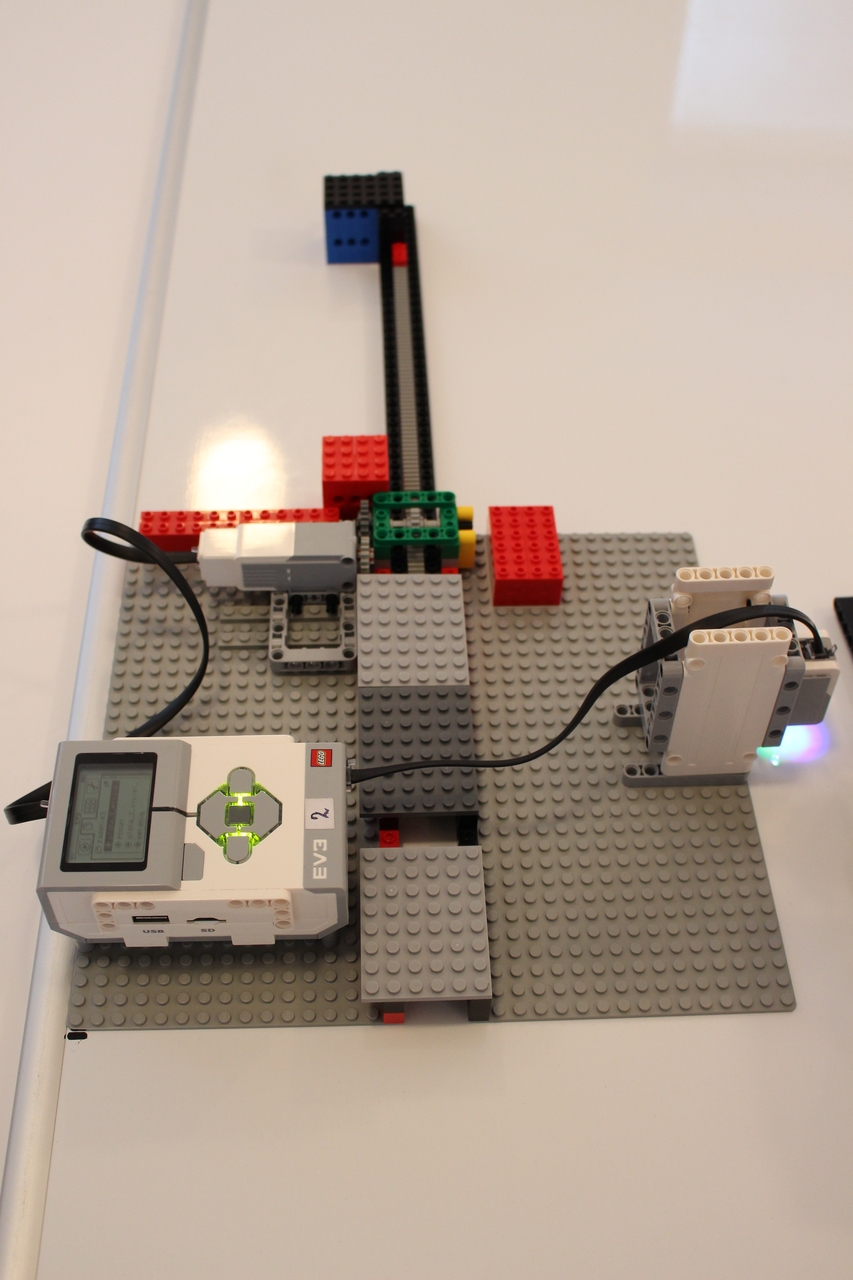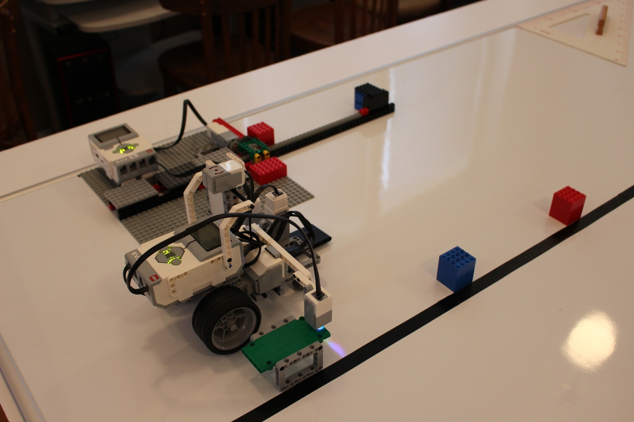 a) Nameranú vdialenosť v cm vyjadríme ako čas v sekundách. Počas tohto času 1. robot ukáže 2. robotovi rameno čiernej farby. 2. robot zmeria čas, počas ktorého jeho farebný senzor "vidí" rameno prvého robota a zapíše ju do premennej čas. Rameno 1. robota sa vráti späť. Keďže senzor je pomerne vysoko tak hlási bielu alebo žiadnu farbu. Aby prenos netrval príliš dlho - hlavne pri veľkých vzdialenostiach medzi kockami - vysielanú vzdialenosť sme podelili 5 a na druhej strane - pri prijímaní sme ju vynásobili 5. Teda napr. vzdialenosť 10 cm sa prenesie tak, že 1. robot ukazuje čierne rameno počas 2 sekúnd. 2. robot zmeria čas a nameraný čas je zasa vzialenosť v cm. Teraz už len stačí zistiť, že koľkým otáčkam motora 2. robota zodpovedá 1 cm vzdialenosti a poslať povel na vykonanie správneho počtu otáčok - ozubený hrebeň cez prevod posunie kocku do správnej vzdialenosti.