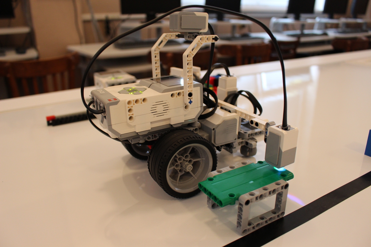 Pri riešení tejto úlohy sme použili farebné senzory. Postavili sme 2 robotov. 1. robot odmeral vzdialenosť medzi kockami a odoslal ju druhému robotovi. 2. robot údaj prijal a nastavil vzdialenosť medzi svojimi kockami.