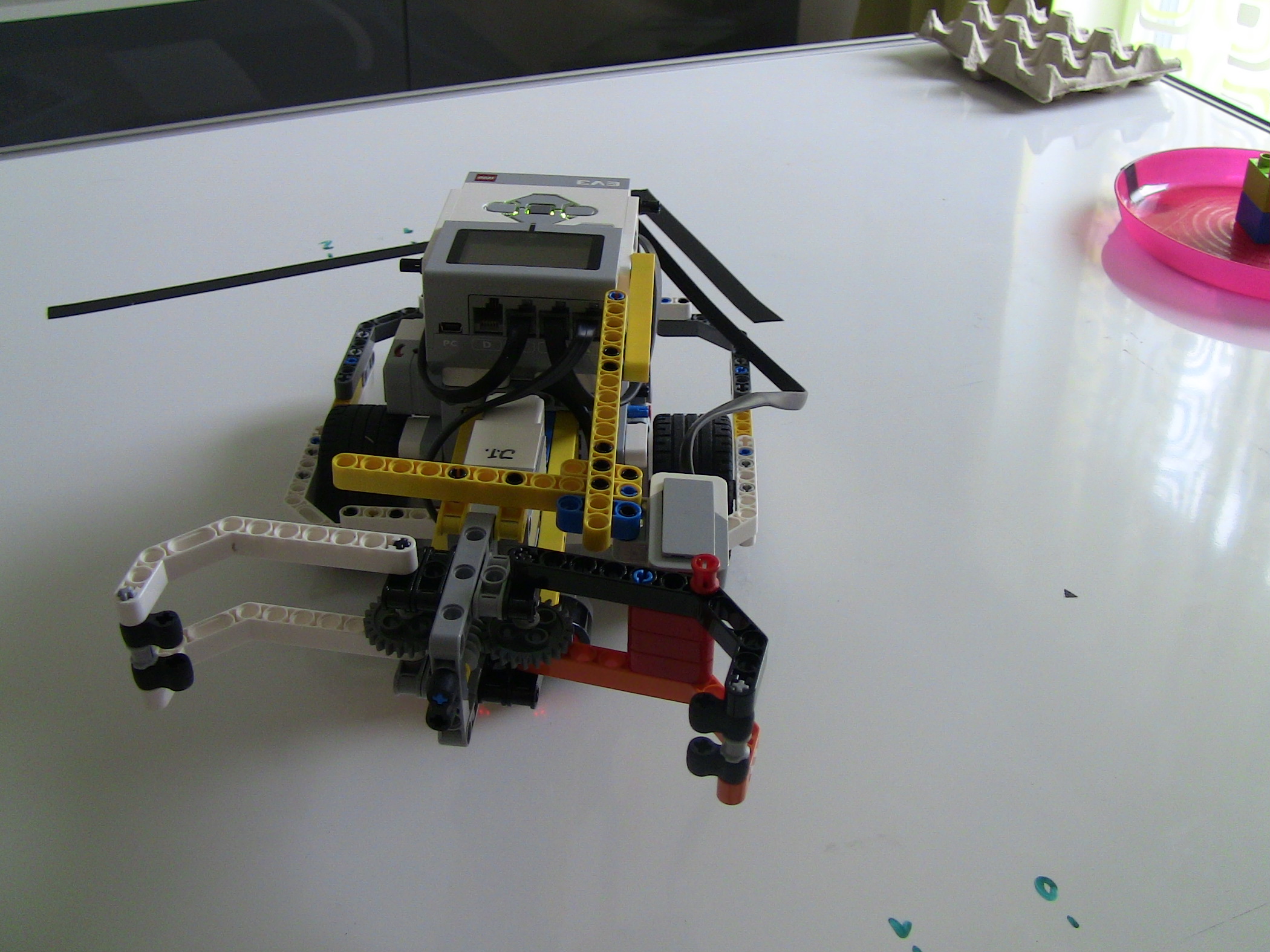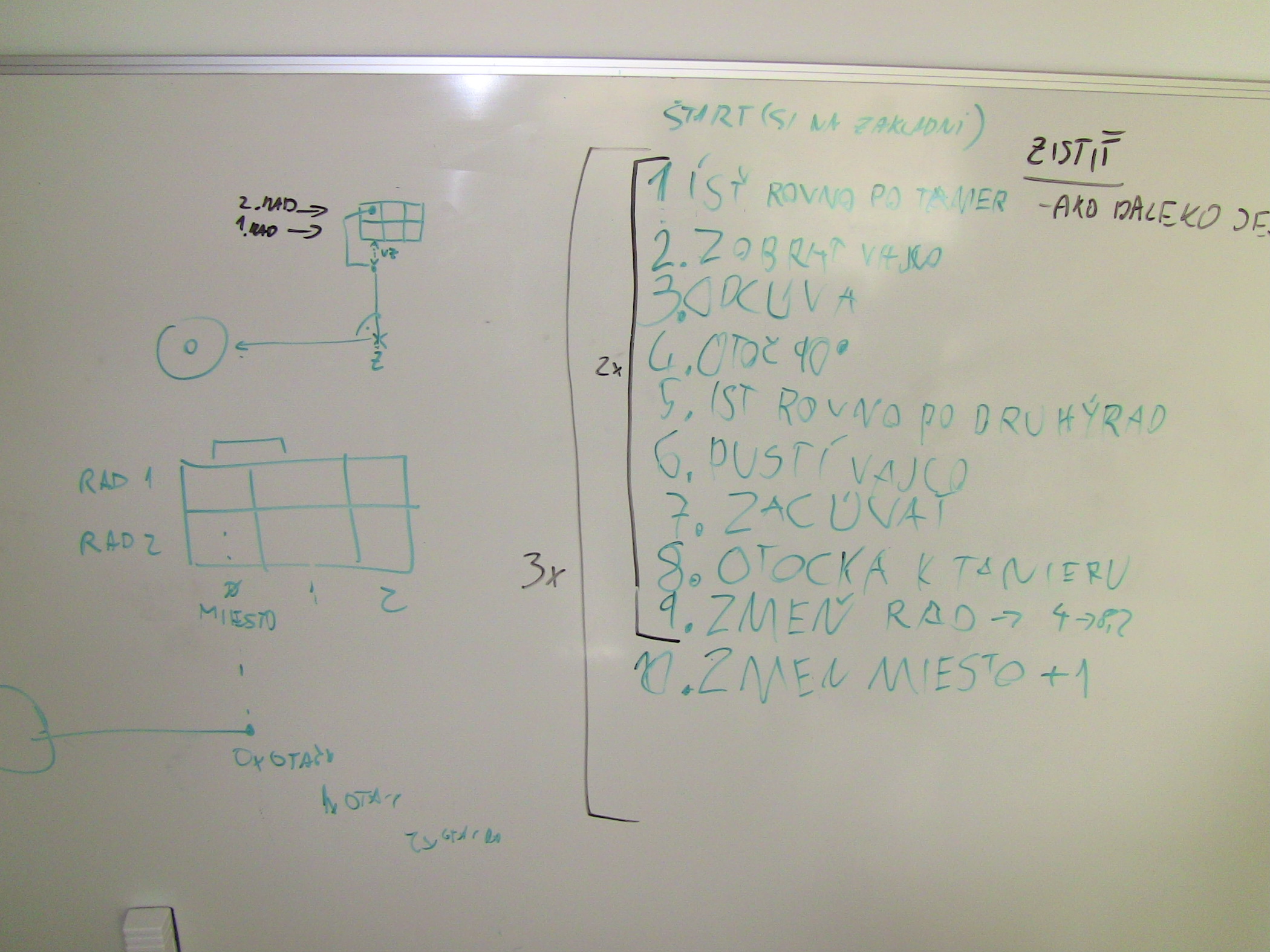 Najprv sme riešili konštrukciu robota, aby dokázal dočiahnut na vajíčko v strede taniera a aby zároveň dočiahol do zadného radu v krabičke.