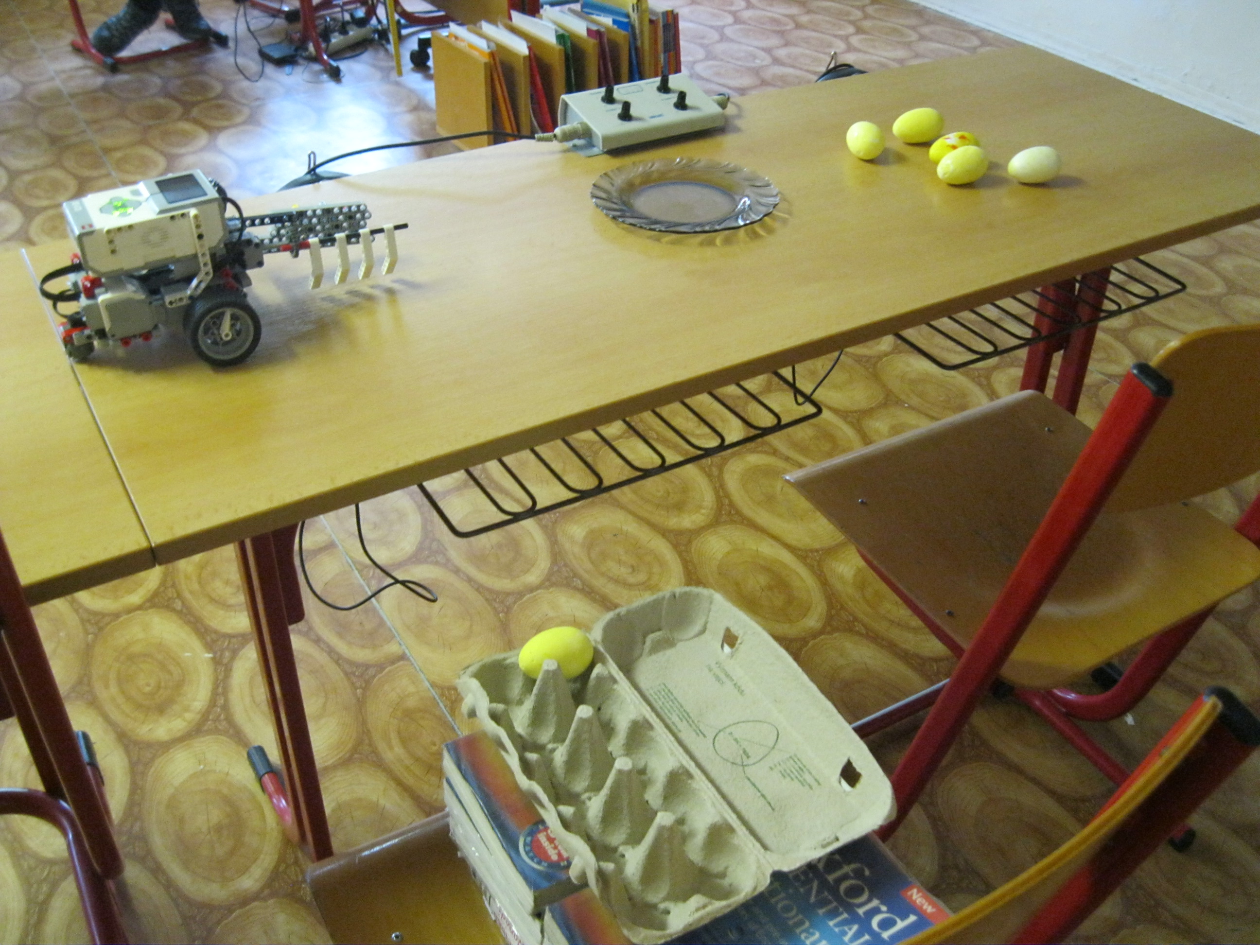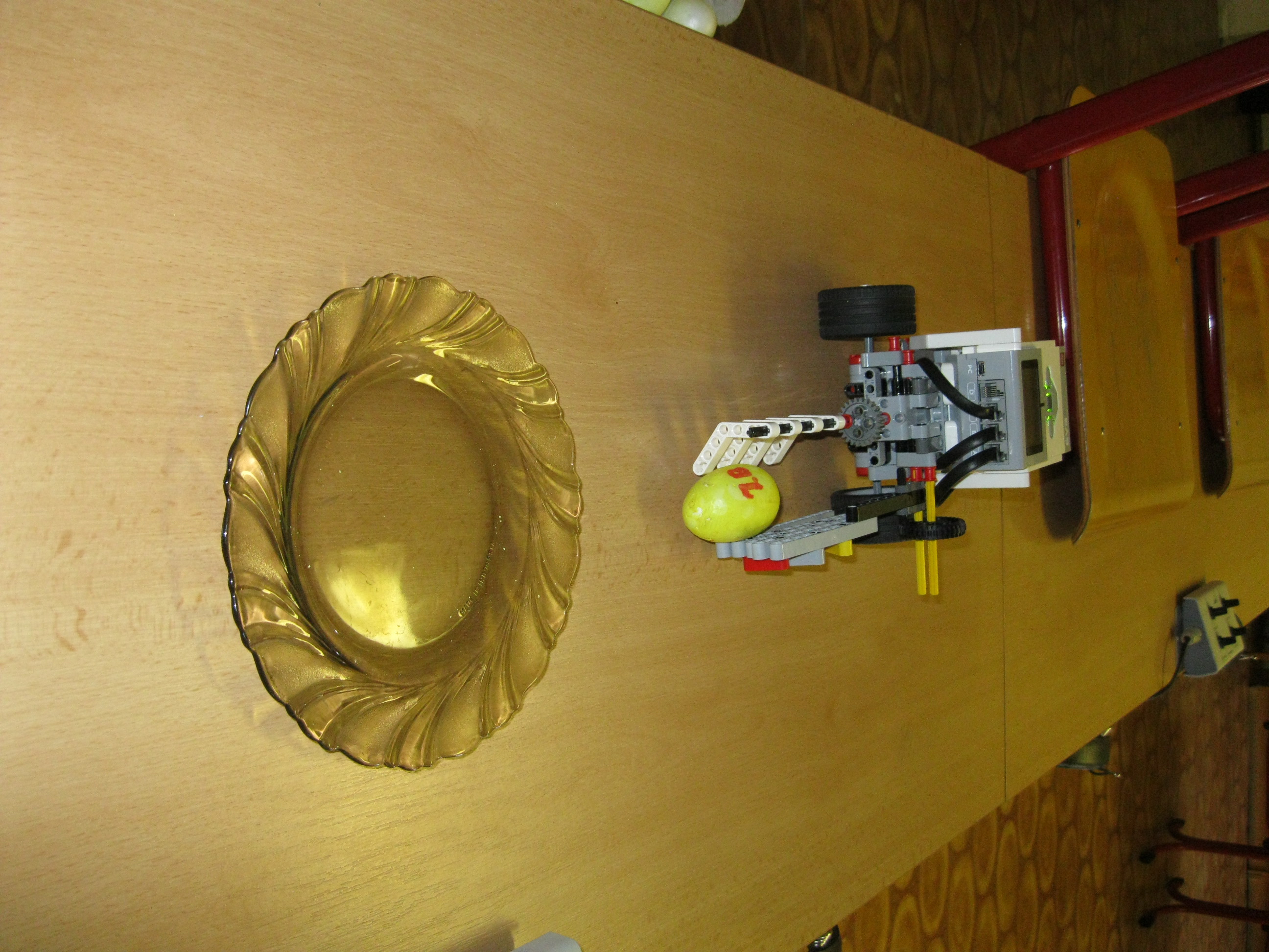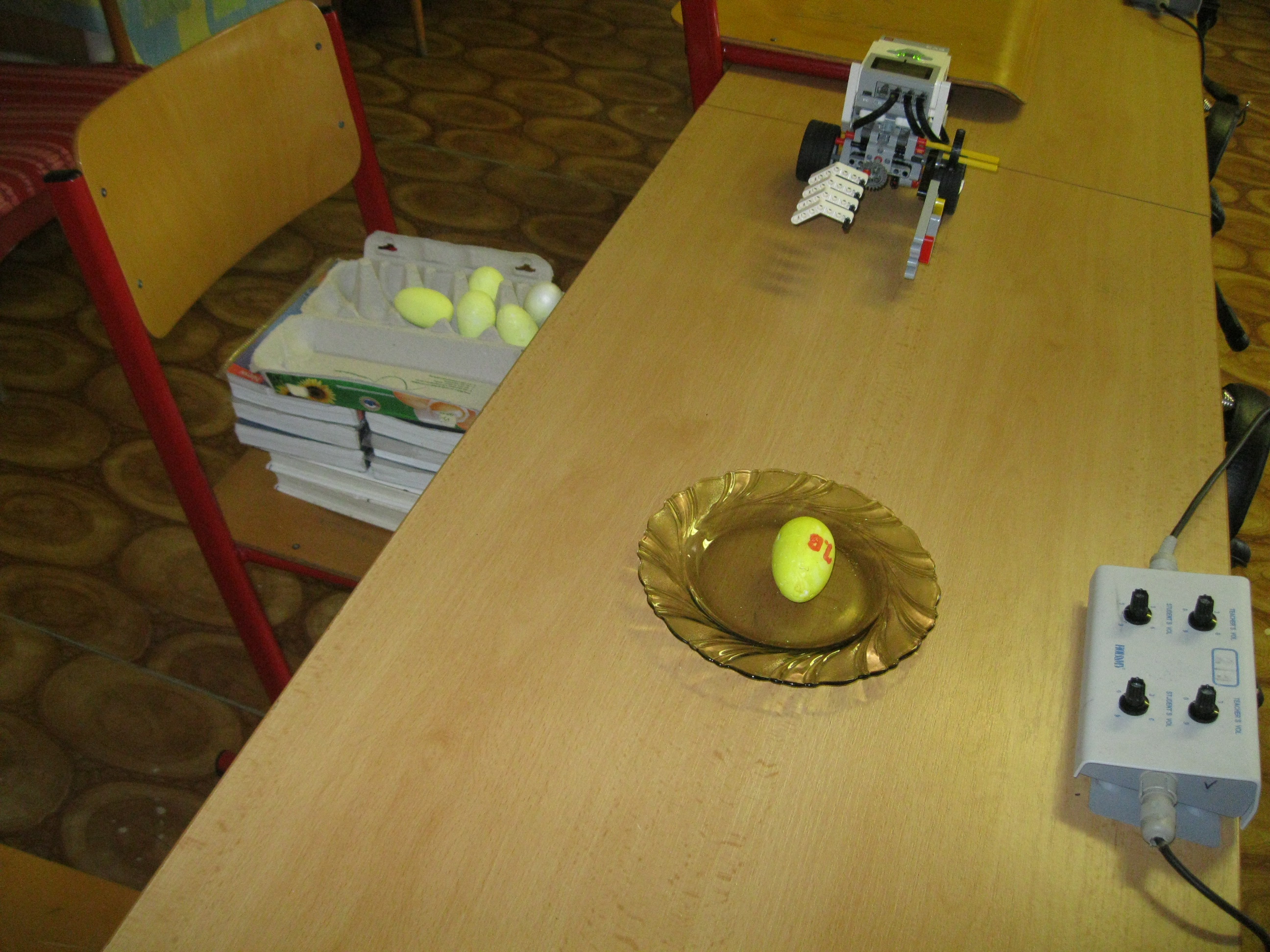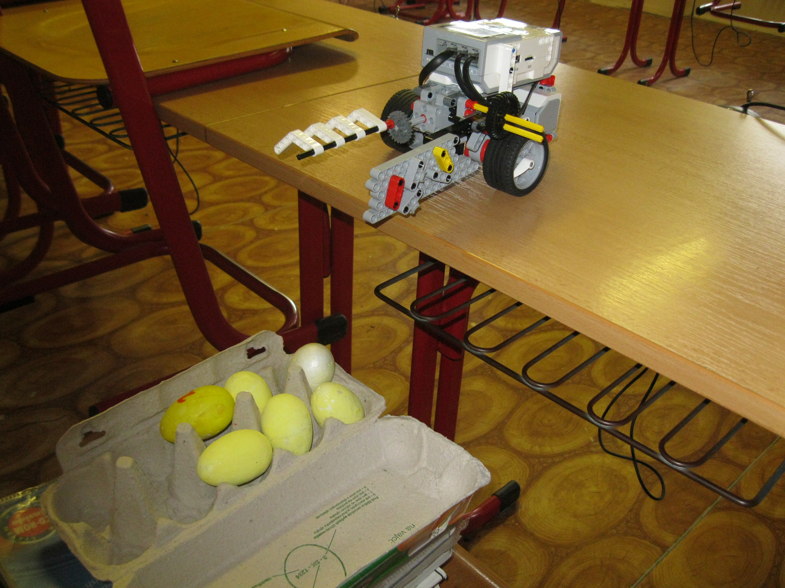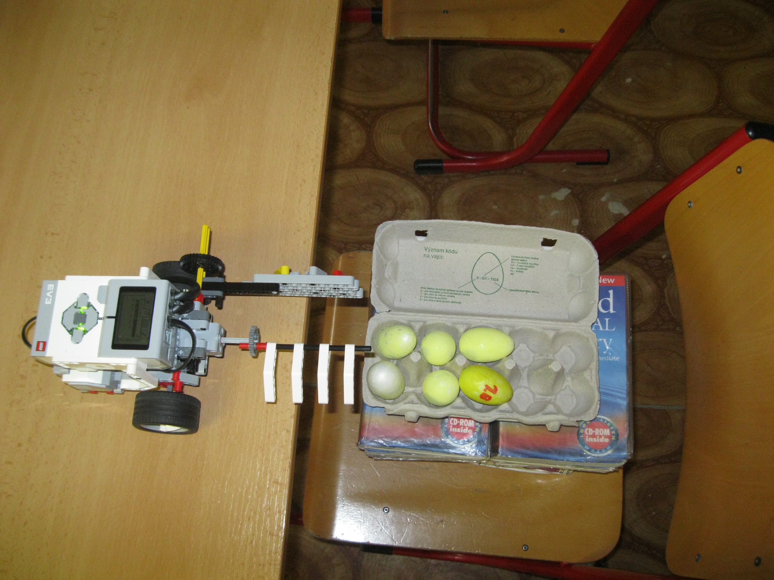1. Máte veľmi pekne vymyslenú tu ruku na naberanie vajíčok. Myslím však, že ich umiestňovanie do krabičky by skutočné vajcia asi neprežili a radšej by sme videli ako si robot sám počíta cykly a nie že ho treba 6x spustiť. Ani to posúvanie krabičky asi nie je celkom doriešené. Body: 2 2. Za úlohu babičkine vajcia získavate 2,6b, pretože ste nenahrali spoločnú fotku tímu. Pre vylepšenie by ste sa mohli pokúsiť o vloženie vajíčok do obalu namiesto hádzania. Body: 2.6 3. Škoda, že ste program nešlo spustiť na jedno spustenie. Trochu by som sa bál výšky, z ktorej boli vajíčka spúšťané. Možno stačilo dať nádobku o niečo vyššie. Body: 2.4 4. Dobrá práca. Síce ste mali preložiť 6 vajec a váš program prekladá len jedno, to by sa dalo vyriešiť napríklad loop blokom. Pre budúcnosť sa skúste vyhnúť prestrihom počas behu programu. Body: 2.8 Celkový počet: 2.45
