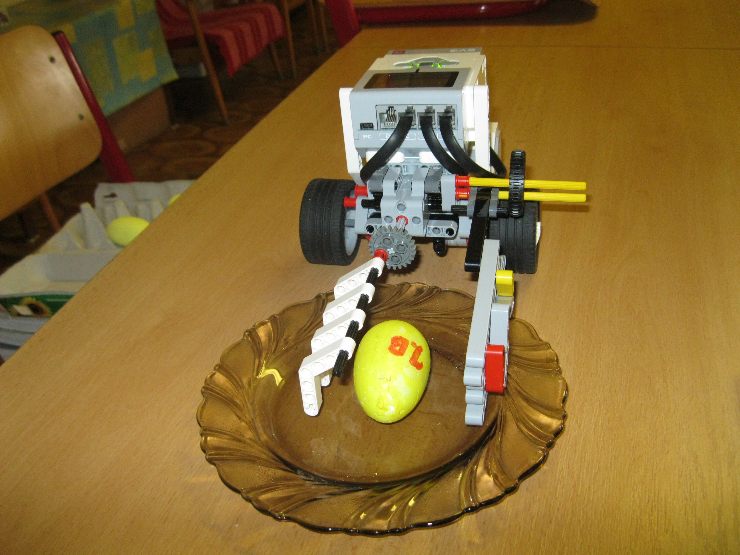 Robot má pripevnenú "naberačku" ktorou vajce zoberie a jemne pritlačí o pomocnu stenu potom už len príde ku krabici a pustí vajíčko do nej.