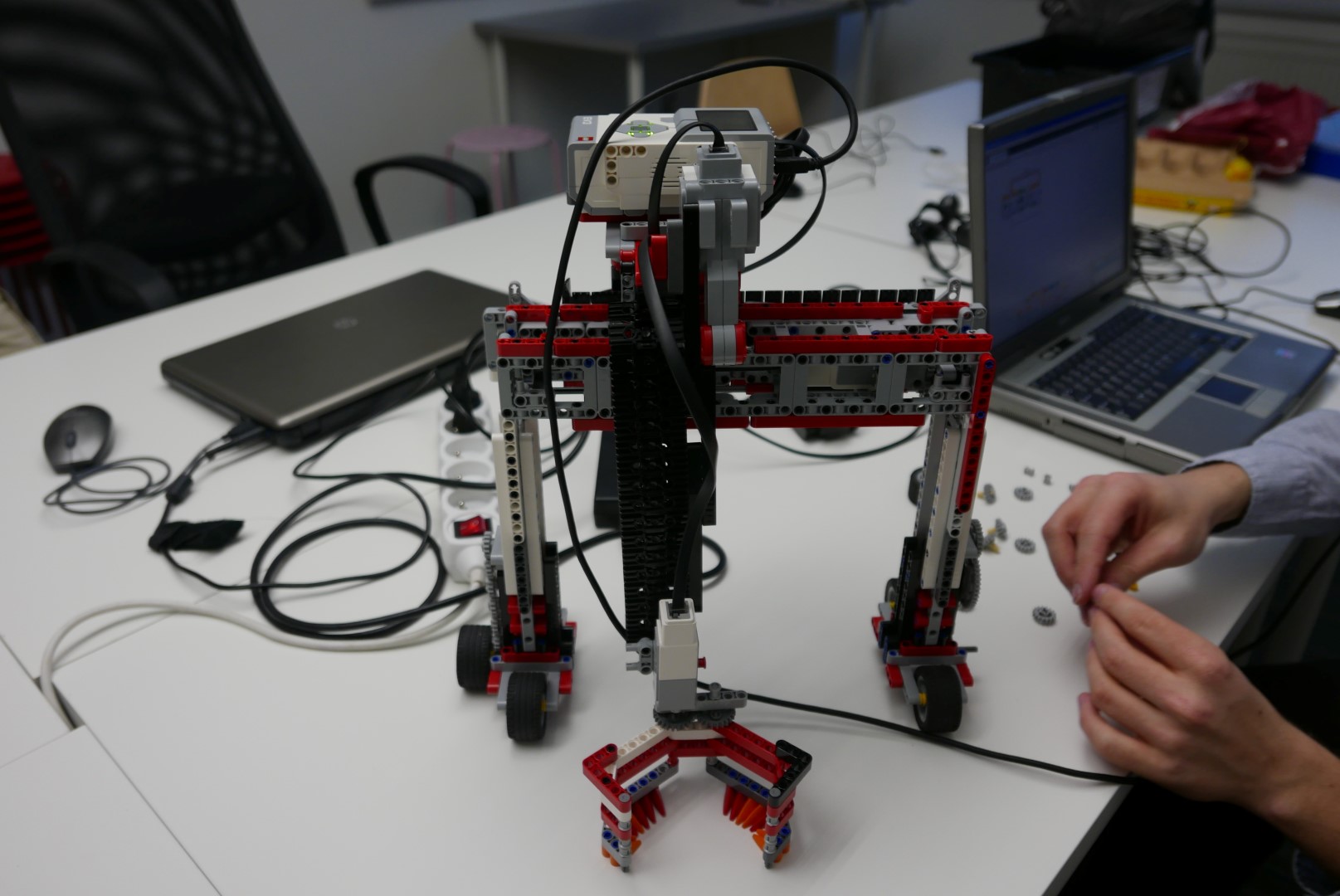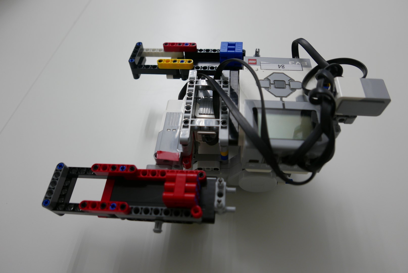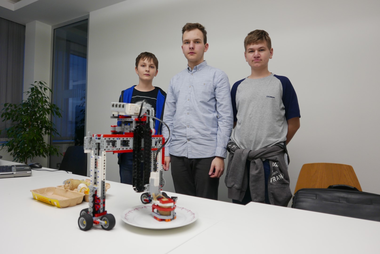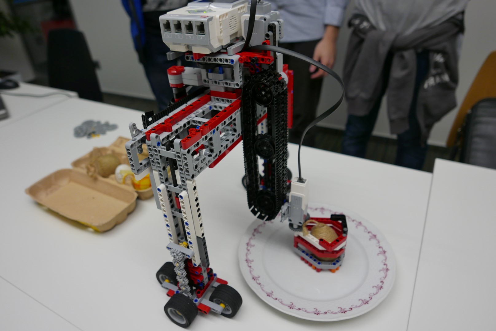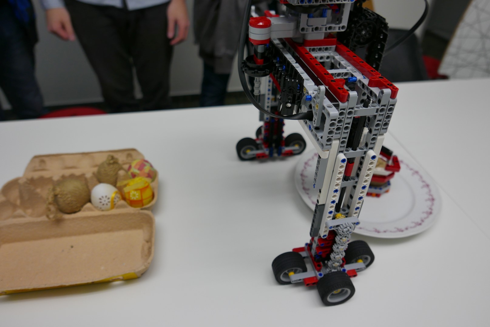 Najskôr mal robot rameno, ktorým dokázal uchopiť z taniera vajíčko a odniesol ho do presne umiestnenej krabičky. S jedným vajíčkom nám to ešte fungovalo, ale umiestnenie druhého už nebolo moc spoľahlivé a tretie sa už vôbec nedarilo presne umiestniť. Postupne sme narážali na priveľa ďaľších problémov, ktoré nás odradili pokračovať touto cestou. Michal už dokončil predchádzjúcu úlohu, z robota si nechal iba rameno na uchopenie vajíčka a pustil sa do iného spôsobu riešenia. Paťo s Tomášom sa radšej pustili do ďalšej veľmi náročnej úlohy 4.kola...