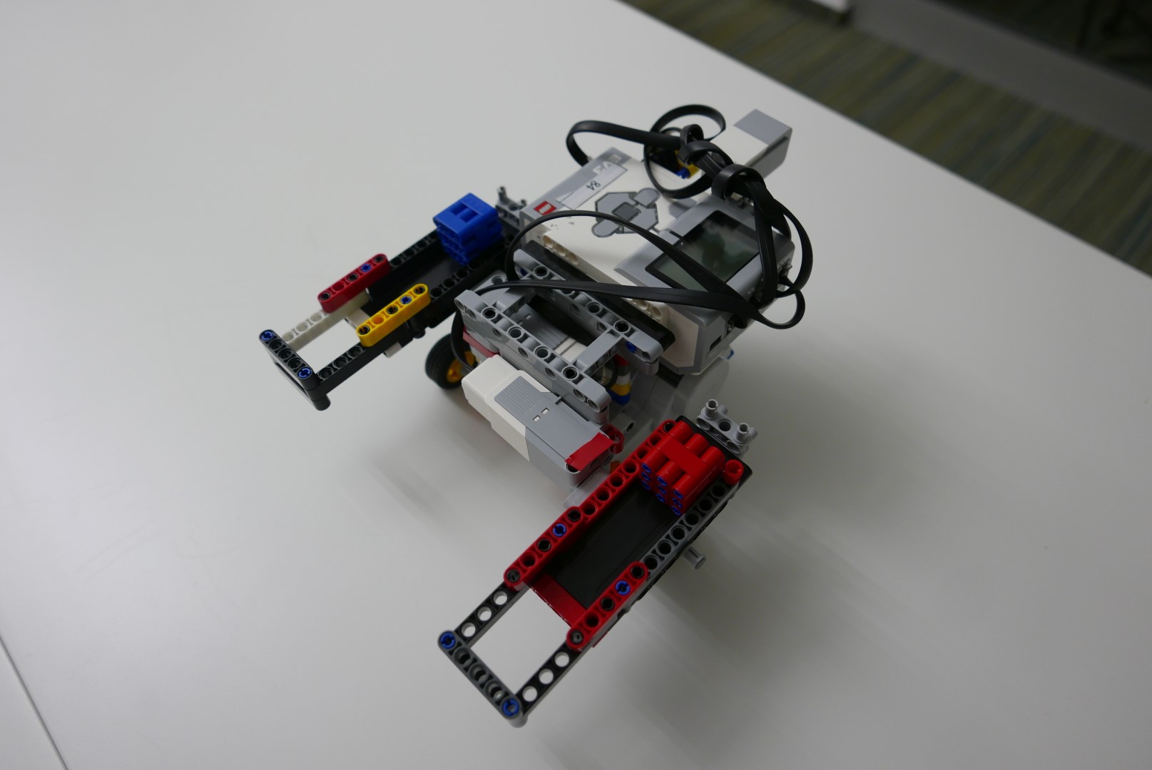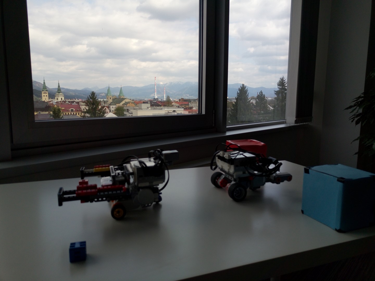 Druhý robot má 2 ramená, na ktorých má pripravené kocky. Keď druhý robot prijme správne informácie najprv položí ľavú kocku podľa toho ako mu to druhý robot poslal. Potom prejde vzdialenosť medzi kockami a položí druhú kocku. Potom len prejde kúsok preč a to je všetko.