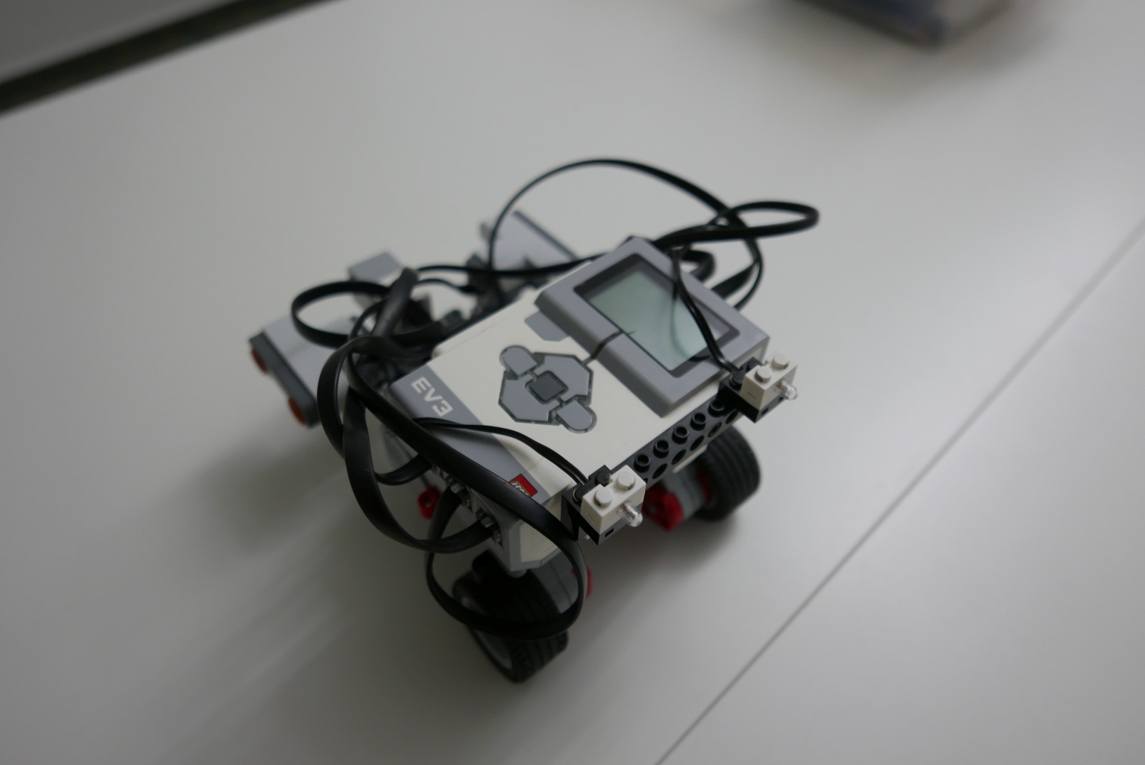 Robot má dva ultrazvukové senzory, ktorými zistí vzdialenosť kociek tak, že medzi ne vojde a ku jednotlivým vzdialenostiam pripočíta svoju šírku. Toto je druhé číslo, ktoré neskôr robot vysiela. Potom sa otočí vľavo a prejde takú vzdialenosť, aby sa dostal ku ľavej kocke tak, že farebný senzor dokáže zistiť farbu ľavej kocky. Zistí, či je kocka červená a toto je ukryté v prvom čísle, ktoré robot vysiela. Vráti sa na pôvodnú pozíciu tak, aby svojimi vysielacími svetlami mieril na svetelný senzor prijímača a začne vysielanie.