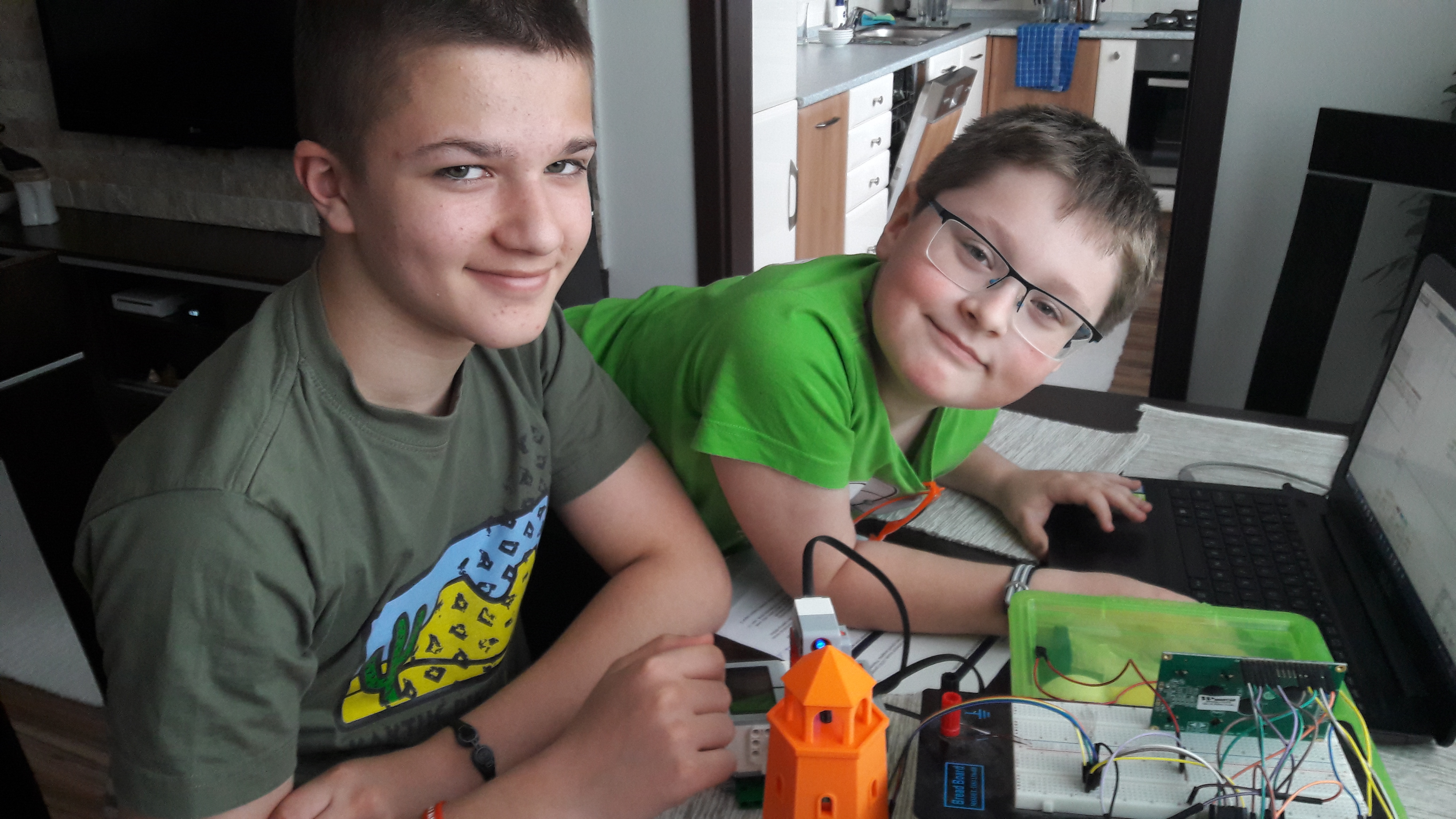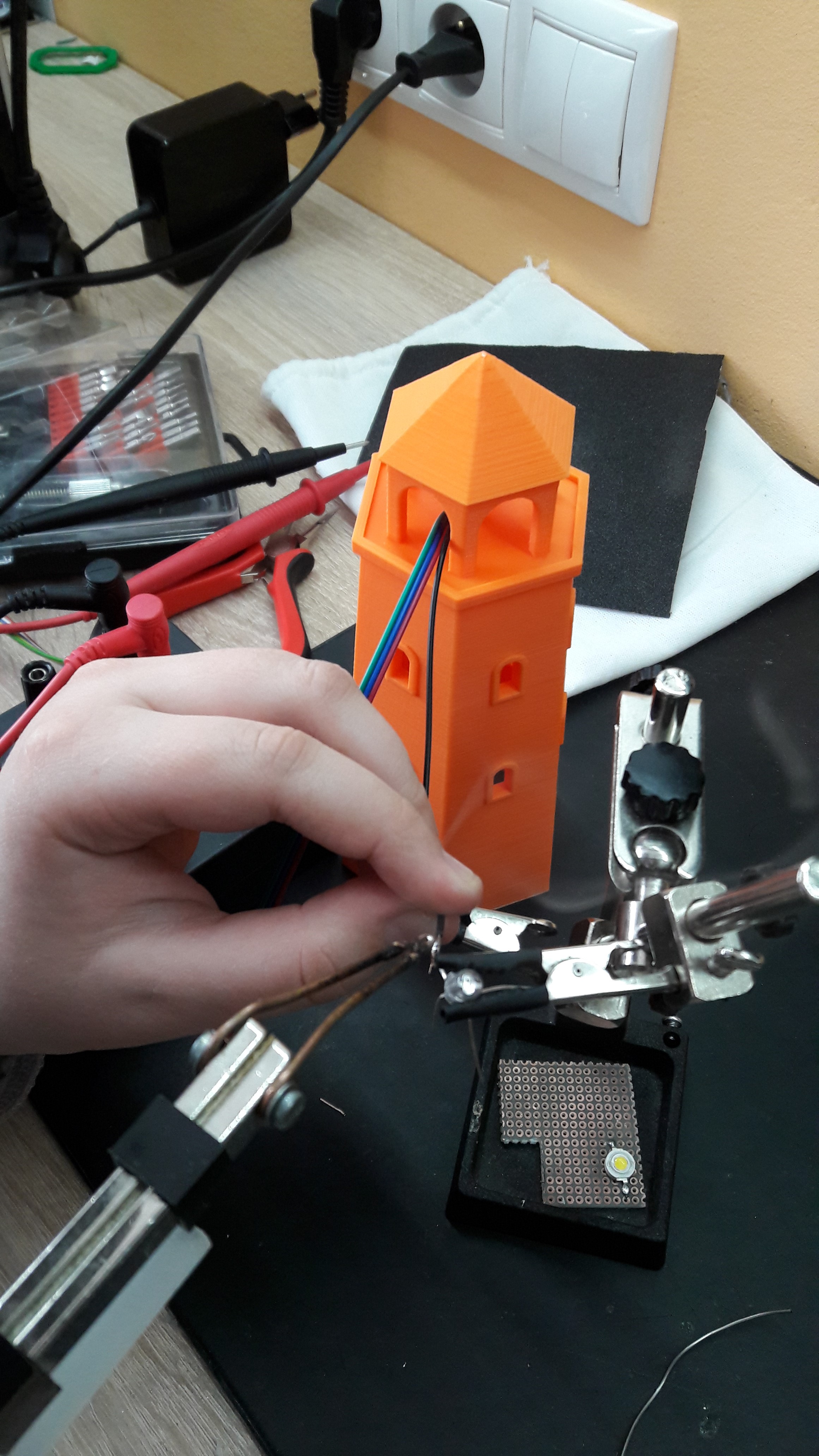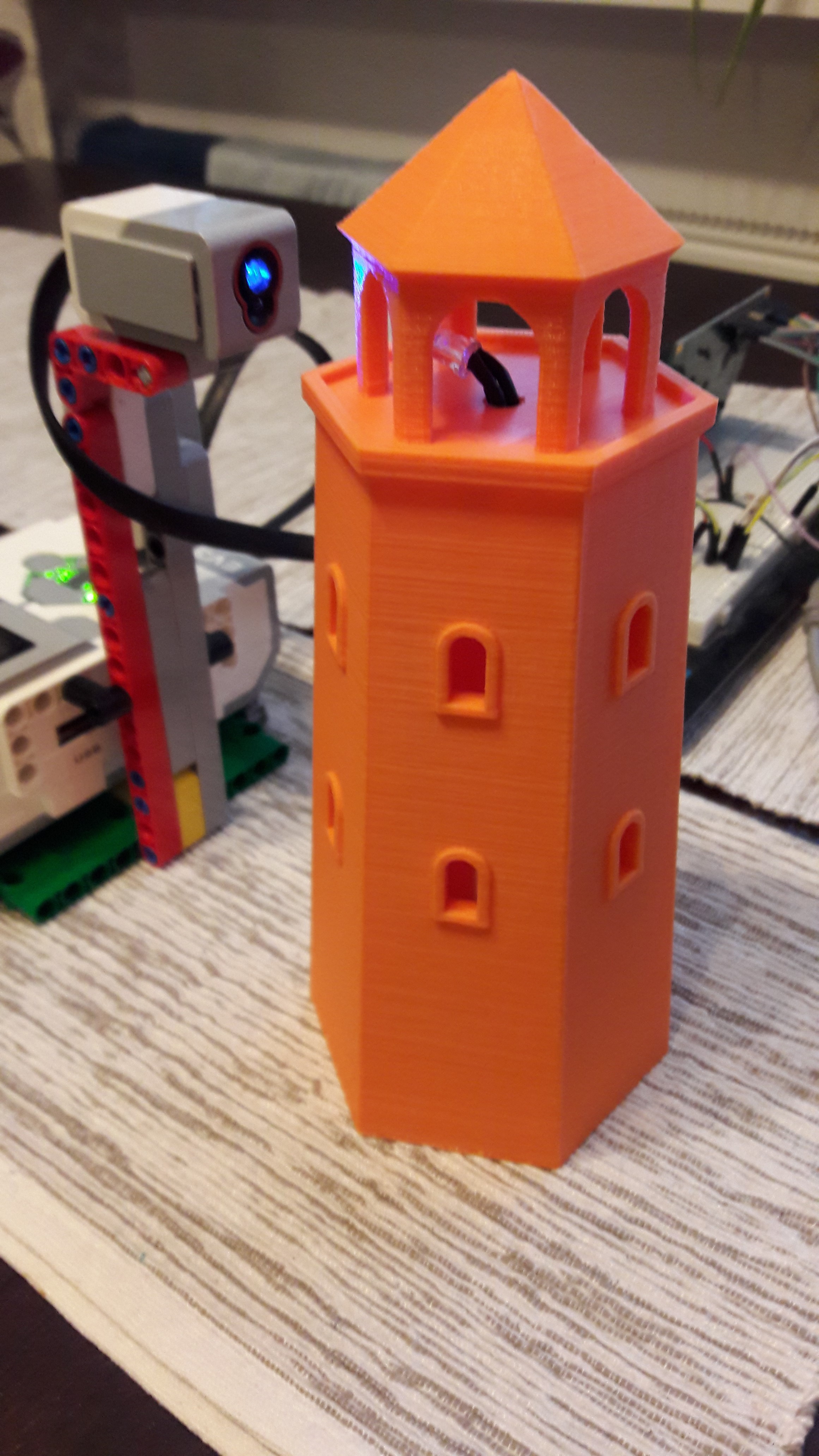 KONŠTRUKCIA - MAJÁK:Model majáka sme si vytlačili na 3D tlačiarni. Pre zostrojenie funčnej elektročasti sme použili Arduino Mega2560, ktorý tvorí mozog majáku. Ďalšou súčasťou je aflanumerický LCD displej 20X4 na vypísanie typu blikania a poradového čísla. A samozrejme nesmie chýbať jedna RGB LED 5mm ! Na prepínanie programov rôznych typov svietenia sme použili malé tlačítko.