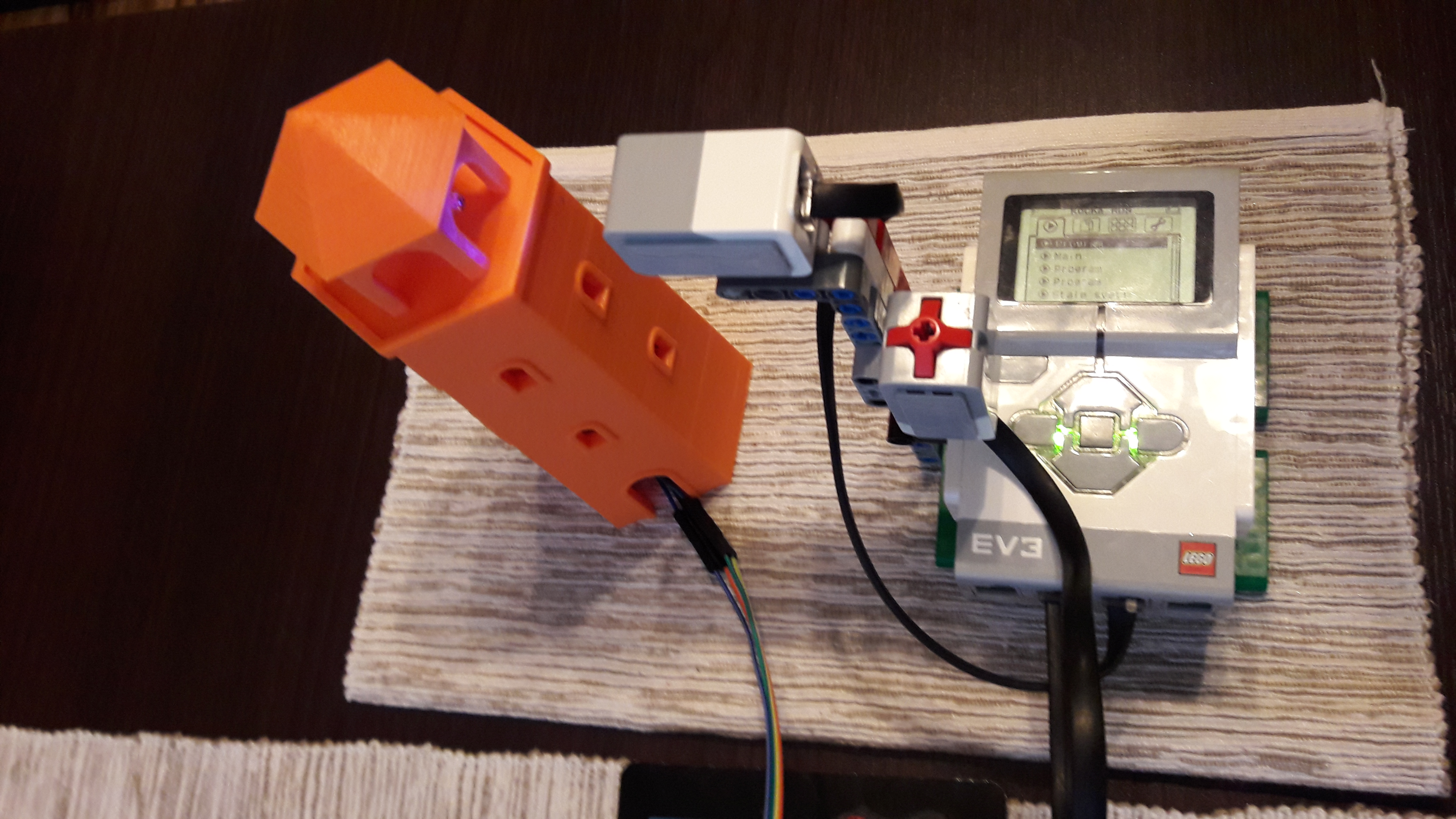 robot ako časť zariadenie pre námorníkov je veľmi jednoduché uchytenie color senzoru, ktorý je pripevnený v presnej výške, tak aby dovidel k okienku majáka. Za ním je pripevnený touch senzor, ktorý slúži na aktiváciu merania.