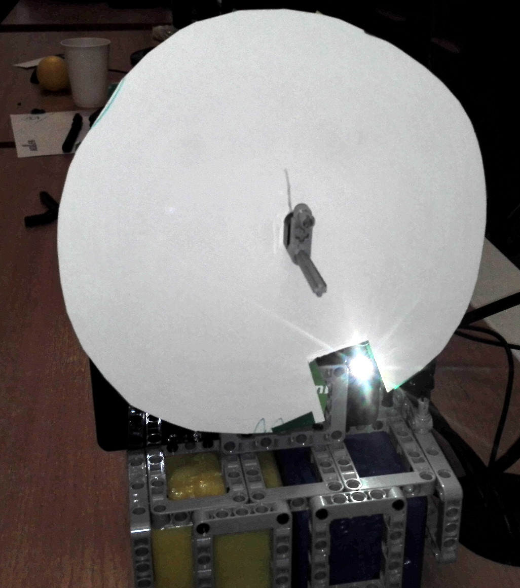 Maják tvorí papierové tienidlo s otvorom, ktoré sa otáča a cez otvor pri každom otočení raz prenikne svetlo baterky.