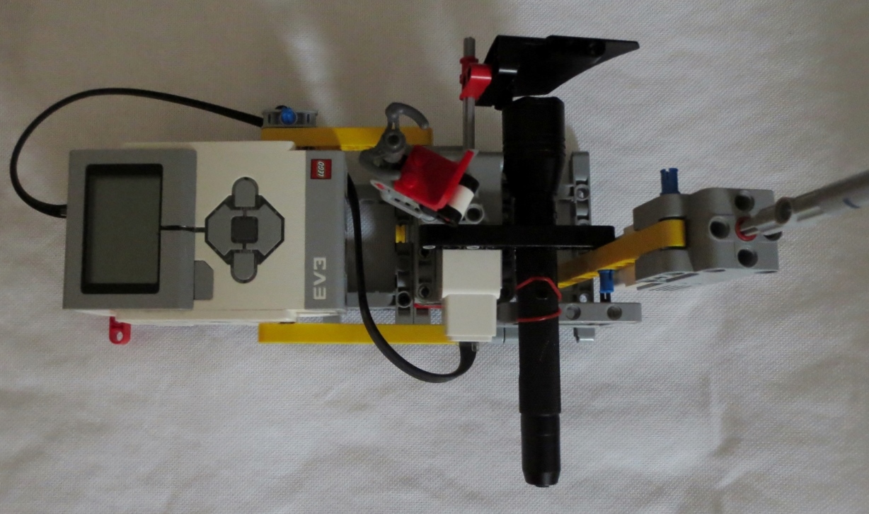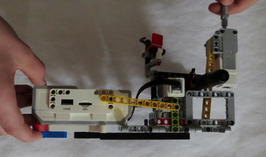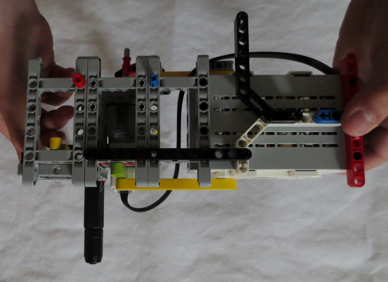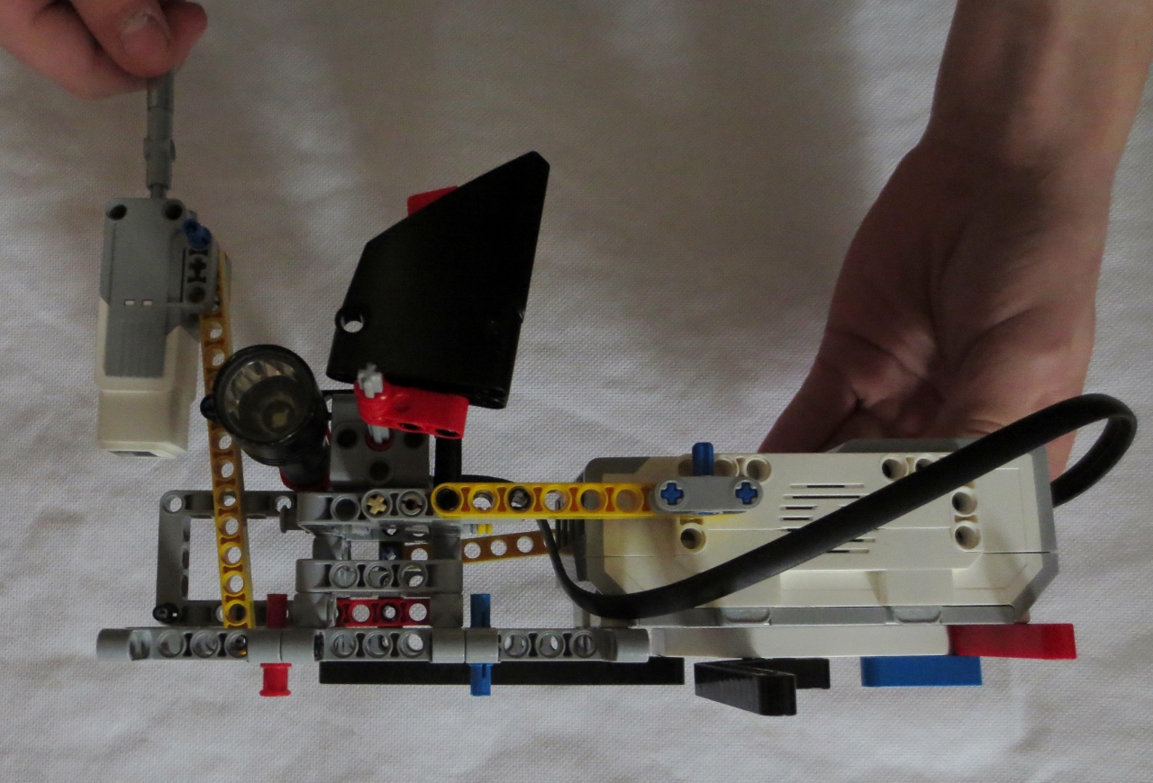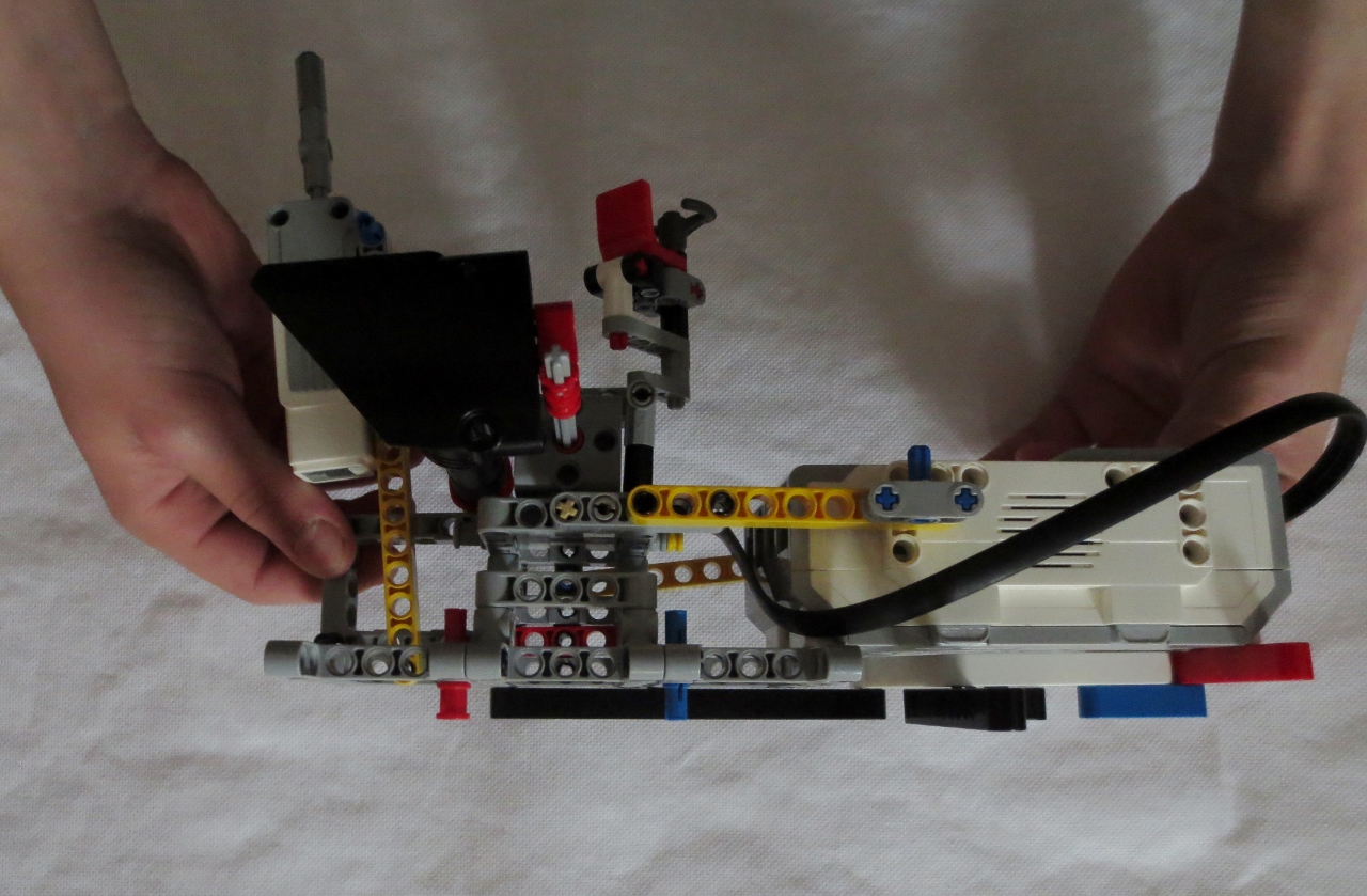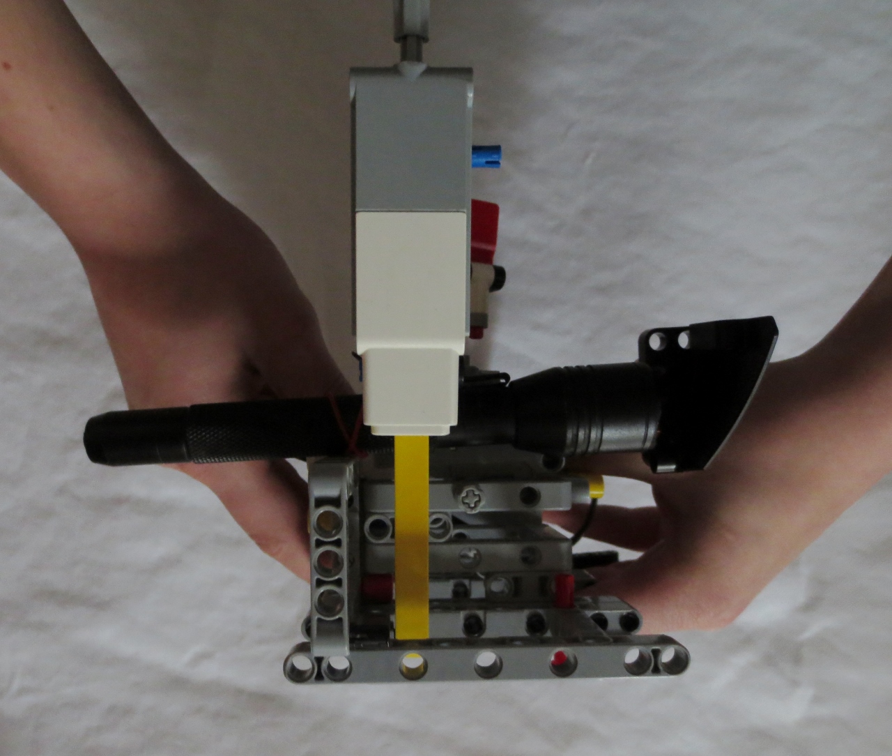 Tentokrát sme spravili najjednoduchšie riešenie aké nám prišlo na um. Náš robot pozostáva z kocky baterky a jedného medium motora. Motor otáča čiernu plochu ktorá zacláňa svetlo vysielané z baterky. Pomocou toho že sa motor pootočí dokážeme vysielať svetlo (ktoré kvôli efektu na videu premietame na bielu látku)