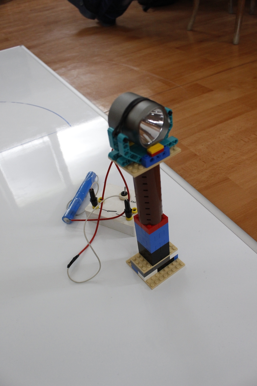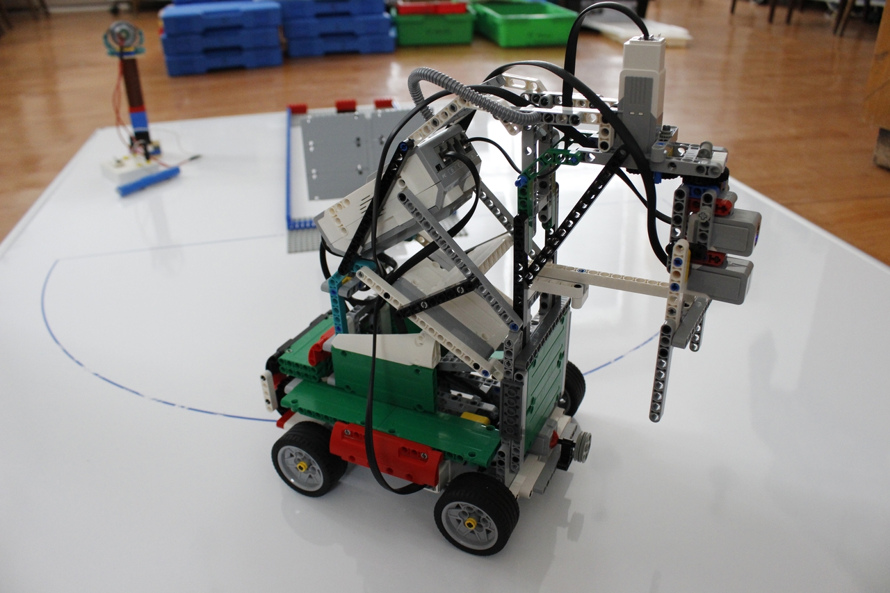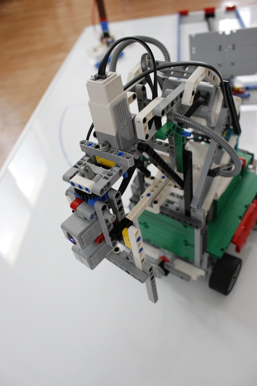 3. Hľadali sme chybu v programe, no na nič sme neprišli - program bežal správne, ale robot nenastavoval panel presne. Nevedeli sme čo s tým... Napokon Michal - to je náš hlavný programátor :) - si zasvietil lampu, pomaly otáčal ramenom a na kocke pozeral, čo hlási farebný snímač. Všimol si zaujímavú vec - naše Slnko vydáva pás svetla - a veľkosť jasu je v celom svetelnom páse rovnaká. Gyroskopom sme odmerali, že tento pás svetla je široký asi 20 stupňov. A tu bol celý problém - robot síce zmeral uhol, pri ktorom bolo svetlo najsilnejšie - ale do premennej uhol zapísal prvú hodnotu, pri ktorej bolo svetlo najsilnejšie - čiže nameral okraj svetelného pásu. Teda napr. ak Slnko bolo vľavo pod uhlom 30 stupňov - lampa vytvorila svetelný pás so šírkou asi 20 stupňov. Čiže robot nameral uhol nie 30 stupňov, ale 20 stupňov - o 10 stupňov menej. Preto o 10 menej, lebo stred lampy bol v strede svetelného pásu (20:2=10).