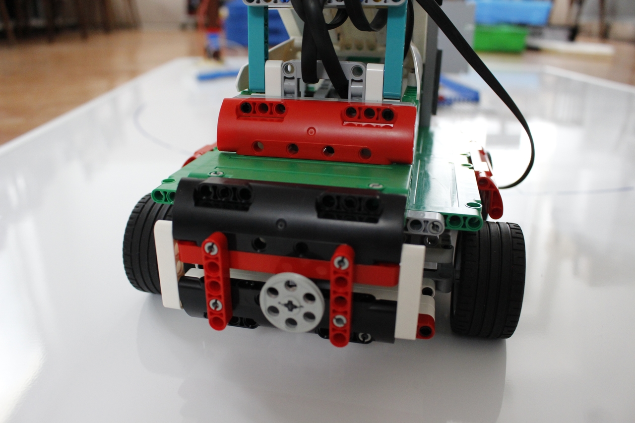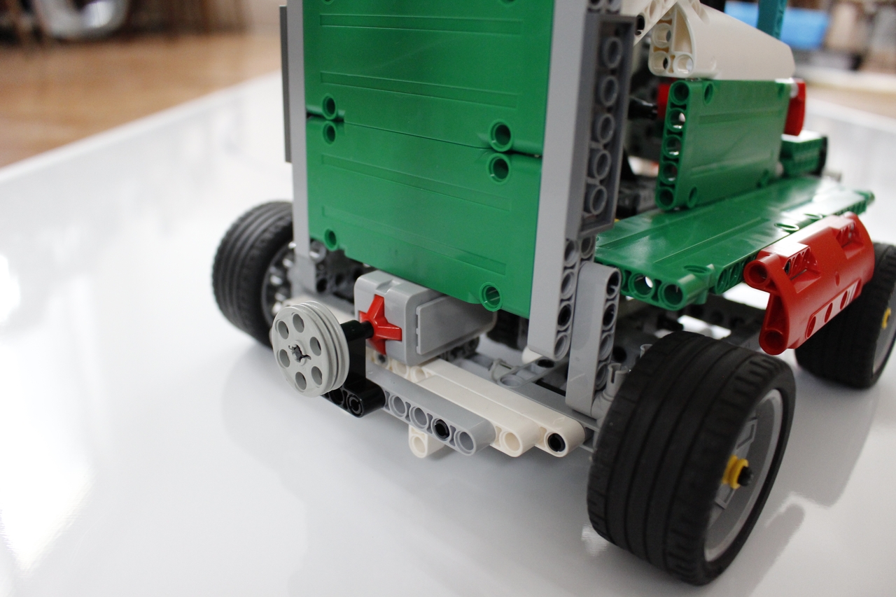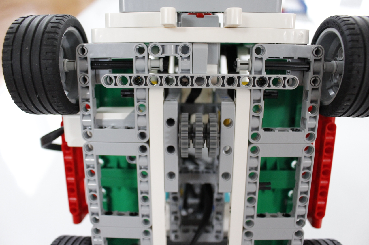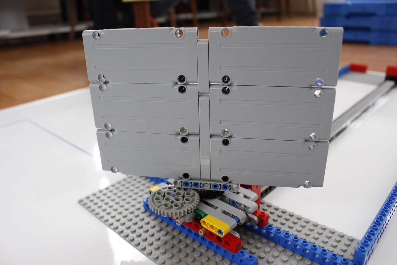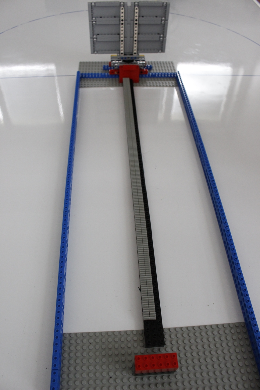 Robot je vzdialený od panelu približne 35 cm. Je veľmi dôležité, aby robot zastavil na presnom mieste a aby došiel presne k stredu panela. Preto má náš robot dva dotykové snímače, ktoré vypínajú pohyb robota pri dotyku s prekážkou a robot sa pohybuje po ozubenej koľajnici pomocou stredného motora. Prvý dotykový snímač vypína pohyb pri príjazde k solárnemu panelu, druhý snímač vypína pohyb pri návrate robota.