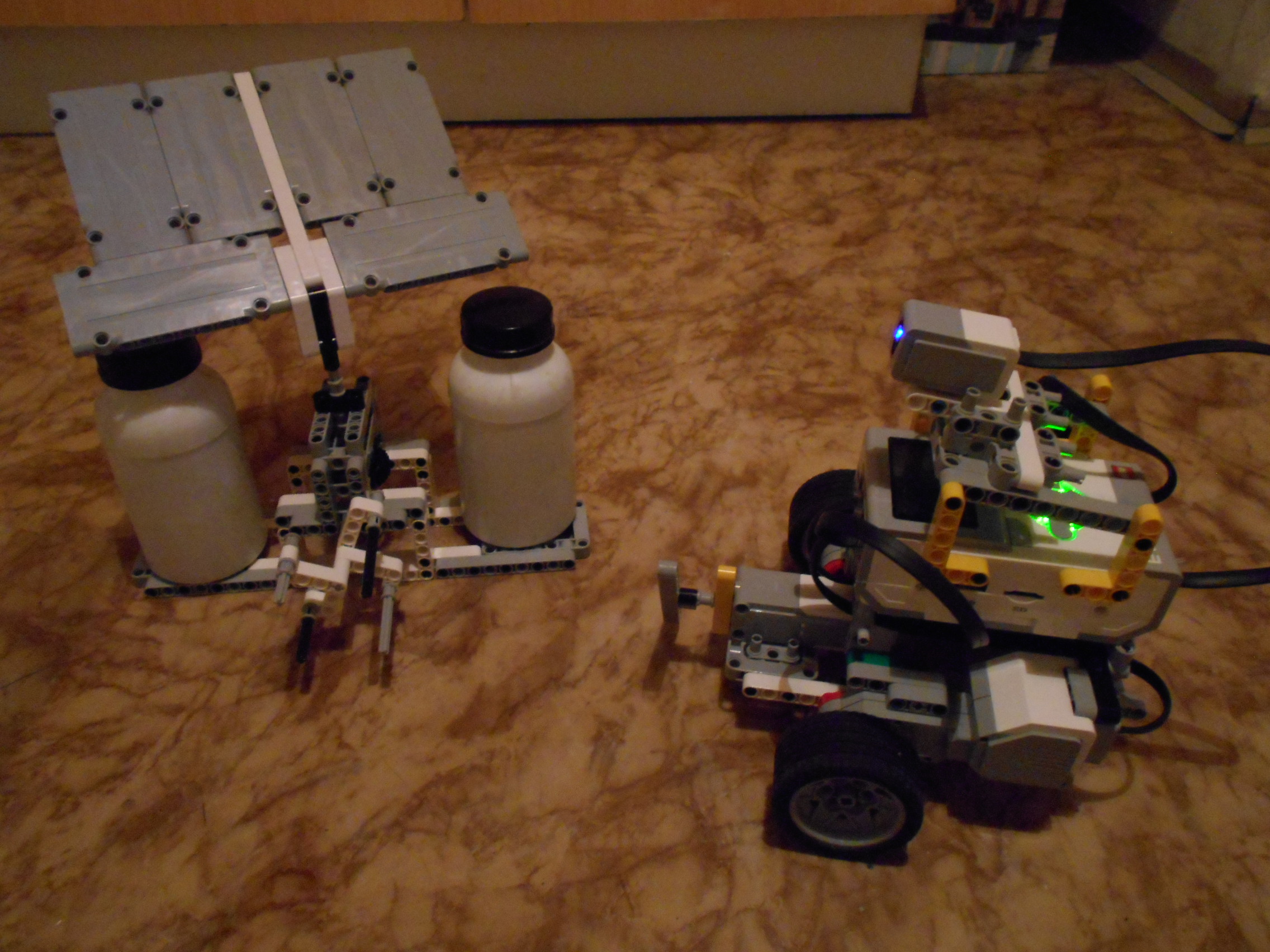 Na riešenie úlohy sme použili jedného robota a dva programy. Robot má v zadnej časti značkovač - rozdávač kociek a v prednej časti ultrasonic senzor.