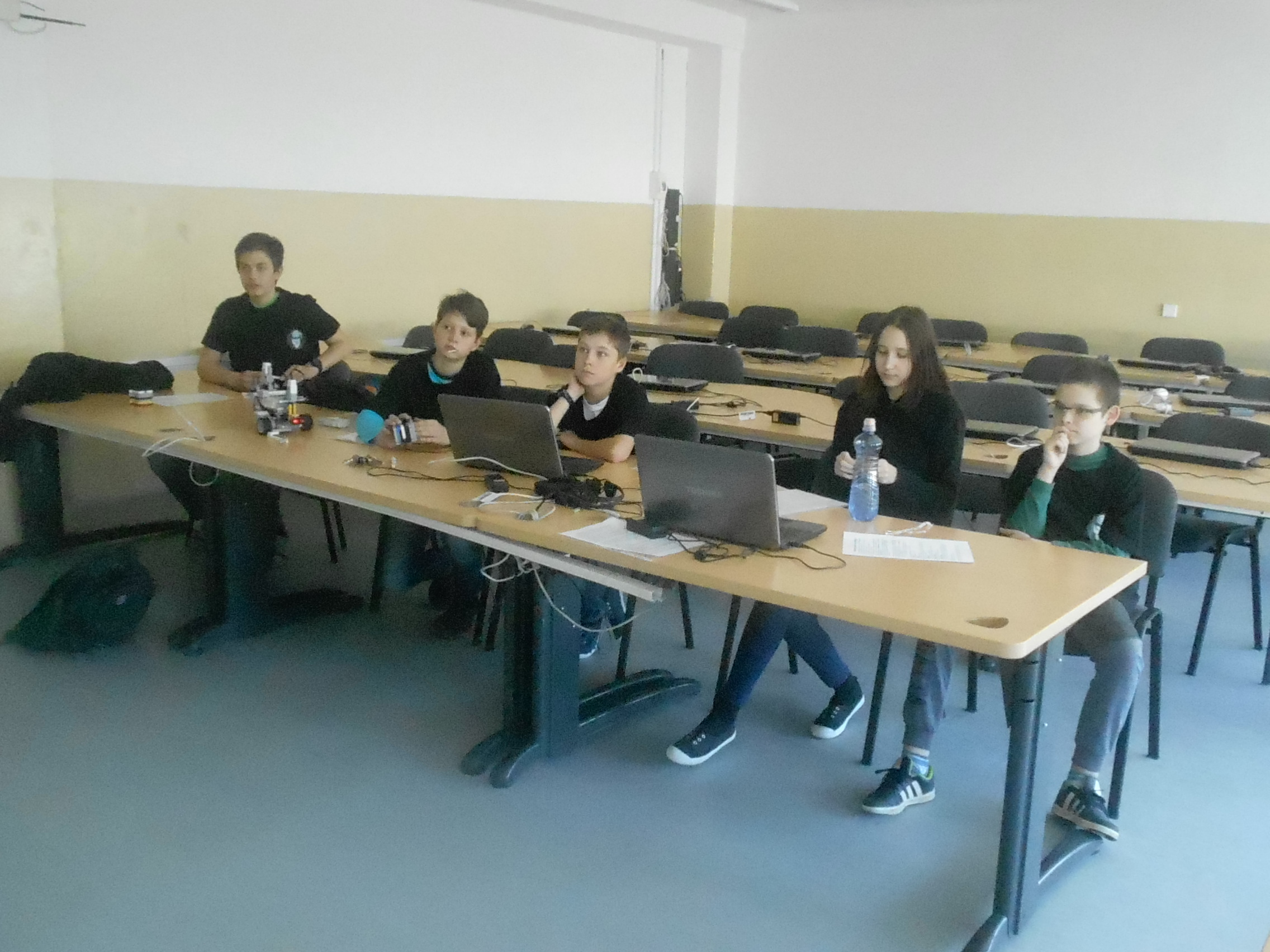 1. Za úlohu mravce získavate 3b. Zostrojili ste robota, ktorý vyznačí cestu a robota, ktorému sa podarilo túto cestu nájsť pomocou ultrazvukového senzora. 2. Fíha, to sú riadne veľké značky! Mal som predstavu, že tie mravce budú zanechávať niečo nenápadnejšie. Ale viac mi prekáža, že robot tie značky upratuje nabok, takže prípadný ďalší mravec by ich už nemohol nasledovať rovnakou cestou. Trajektória mohla byť aj trocha dlhšia (ale to by ste museli mať viac značiek) a mali ste zdokumentovať viac ako jeden prípad. 3. Chválim detailný popis riešenia správania robotov. Riešenia môžu byť. 4. Výborné riešenie. Musím povedať, že ten otáčací ultrazvukový senzor je naozaj super nápad.
