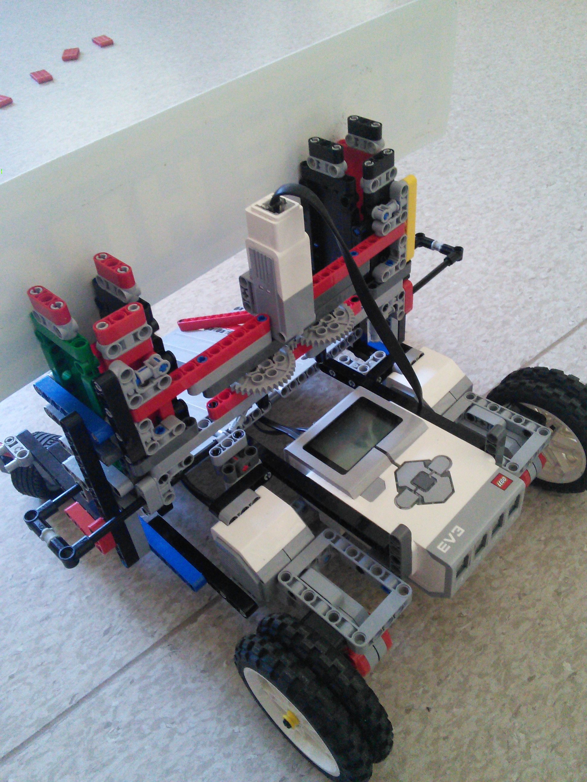 Robot značkovač: Robot má dva motory na pohyb tretím vypúšťa LEGO kocky, ktoré fungujú ako stopy. Kocky sú uložené v dvoch dávkovačoch, ktoré vďaka mechanizmu vypúšťajú kocky striedavo. Kocky sa zošuchú dolu po naklonenej rovine. Robot sa pohybuje s náhodným steeringom a otáčkami. Počas toho vypúšťa za sebou značky.