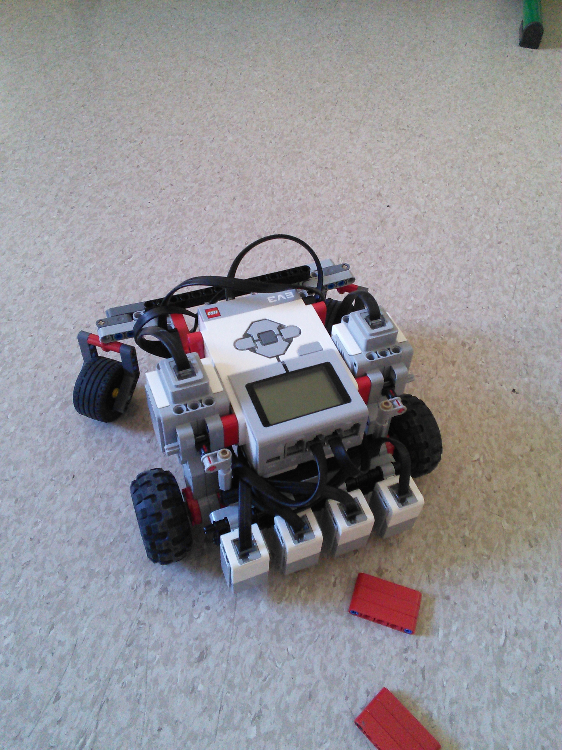 Robot čítač stôp: Robot má dva motory na pohyb. Má tiež štyri farebné senzory na čítanie stôp. Podľa toho v ktorých senzoroch vidí značku ide daným steeringom. Ide tak dokým neuvidí ďalšiu značku. Takto sa to opakuje donekonečna.