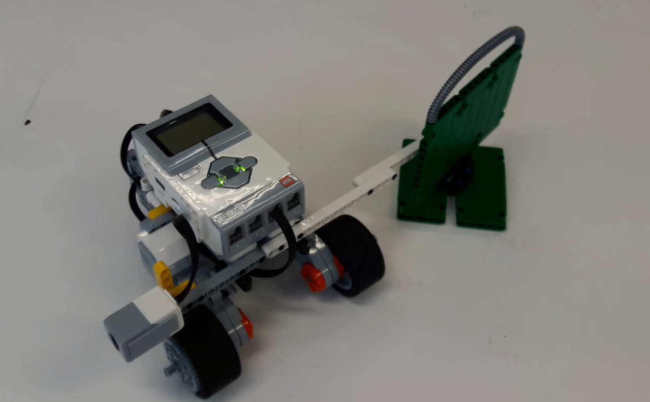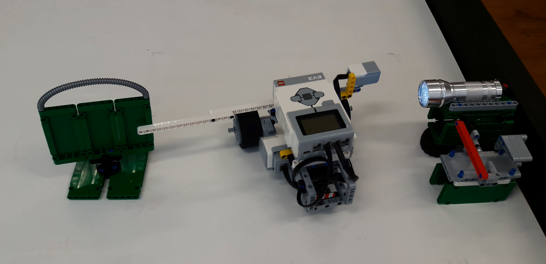 ROBOT: využili sme základného robota, ktorý má 2x large motor na pohyb kolies a vzadu guličku. Na pravú stranu sme vpredu pripevnili color senzor na bočné snímanie intenzity svetla z batérky - „Slnka“. Na ľavej strane robota máme predĺžené rovné rameno, ktoré sa používa na otáčanie panelu do kolmej pozície oproti zdroju svetla. Panel sme zostrojili z plochých súčiastok, otáčanie zabezpečuje malá 3cm ozubená otočná základňa. Celý panel sme k podložke museli pripevniť Dual Lockom.