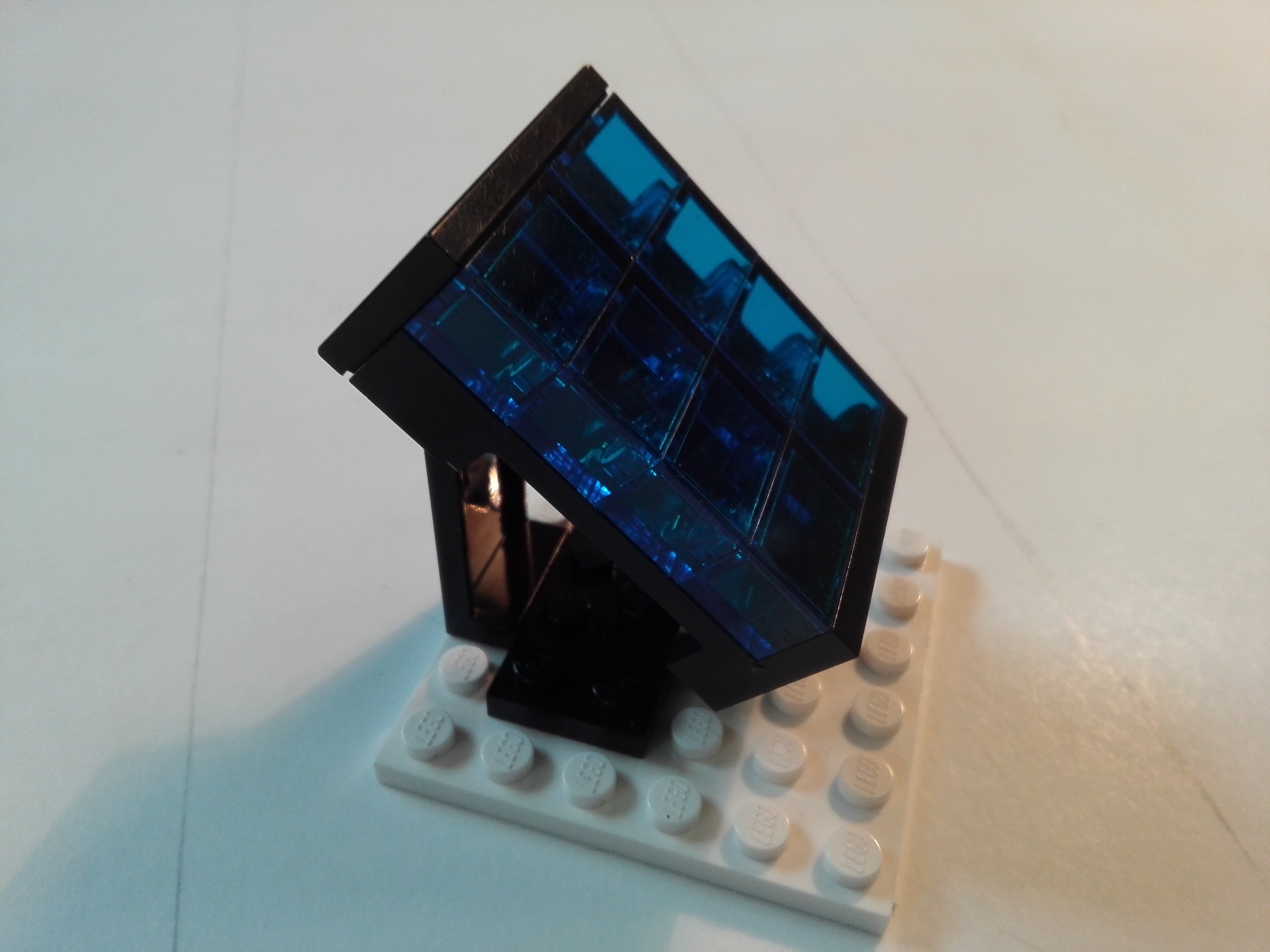 Čierny modrosklenný solárny panel je postavený na otáčavej ploche. Tá obsahuje velké ozubené koleso a aj časť pre zarovnanie na začiatočnú pozíciu. Pred plochou panela je žltá stena na to, aby ultrazvukový senzor zistil v akej vzdialenosti od robota je panel. Na bokoch plochy sú steny, ktoré ohraničujú dráhu robota - keď točí robot panelom, nevšmykne sa. Dráha je nakreslená ceruzkou a robot je postavený vo väčšej vzdialenosti ako 30 cm od panela. Robota staviame na dráhu tak, aby boli jeho 2 pomocné kolesá na nakreslených čiarach.