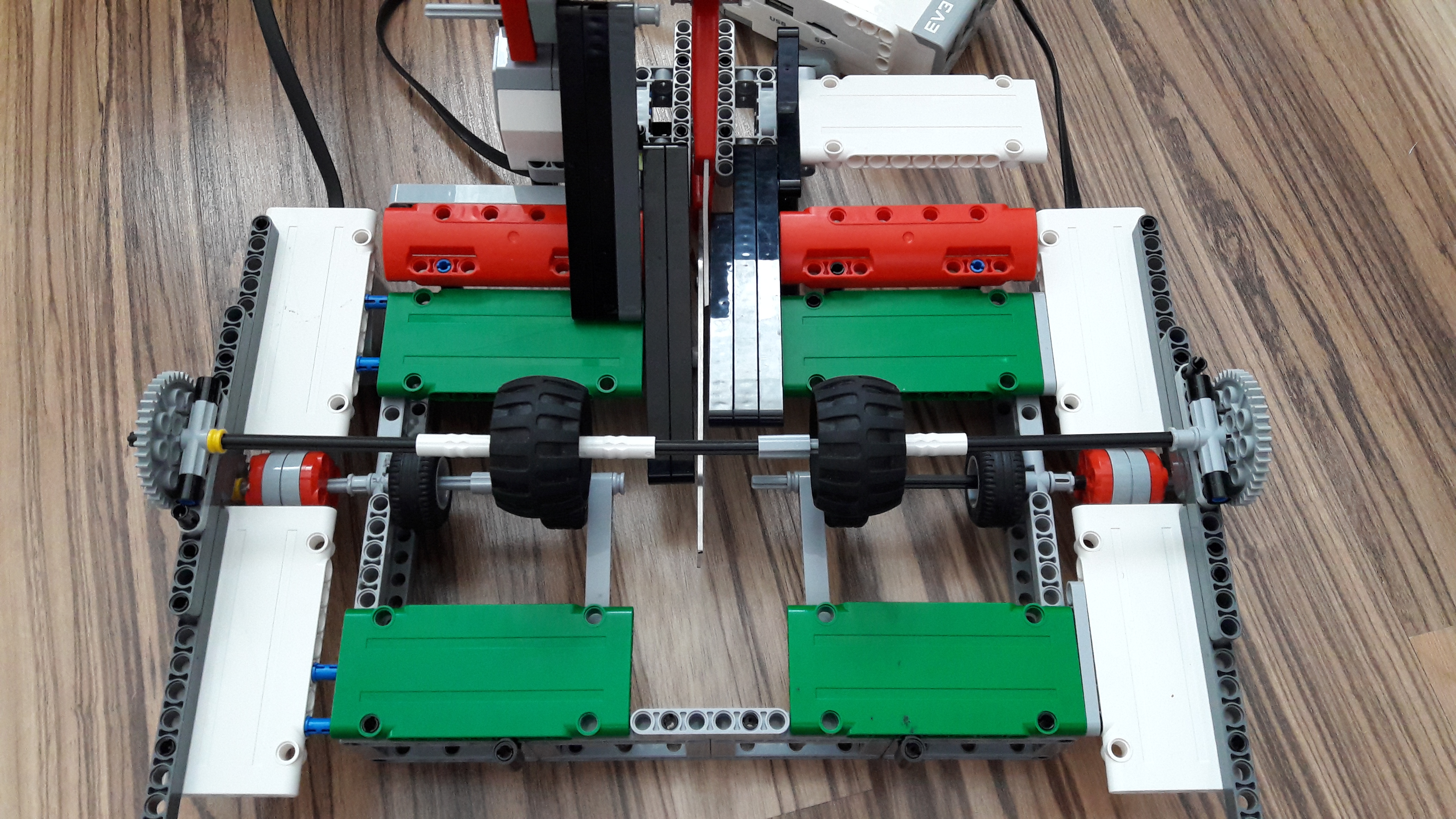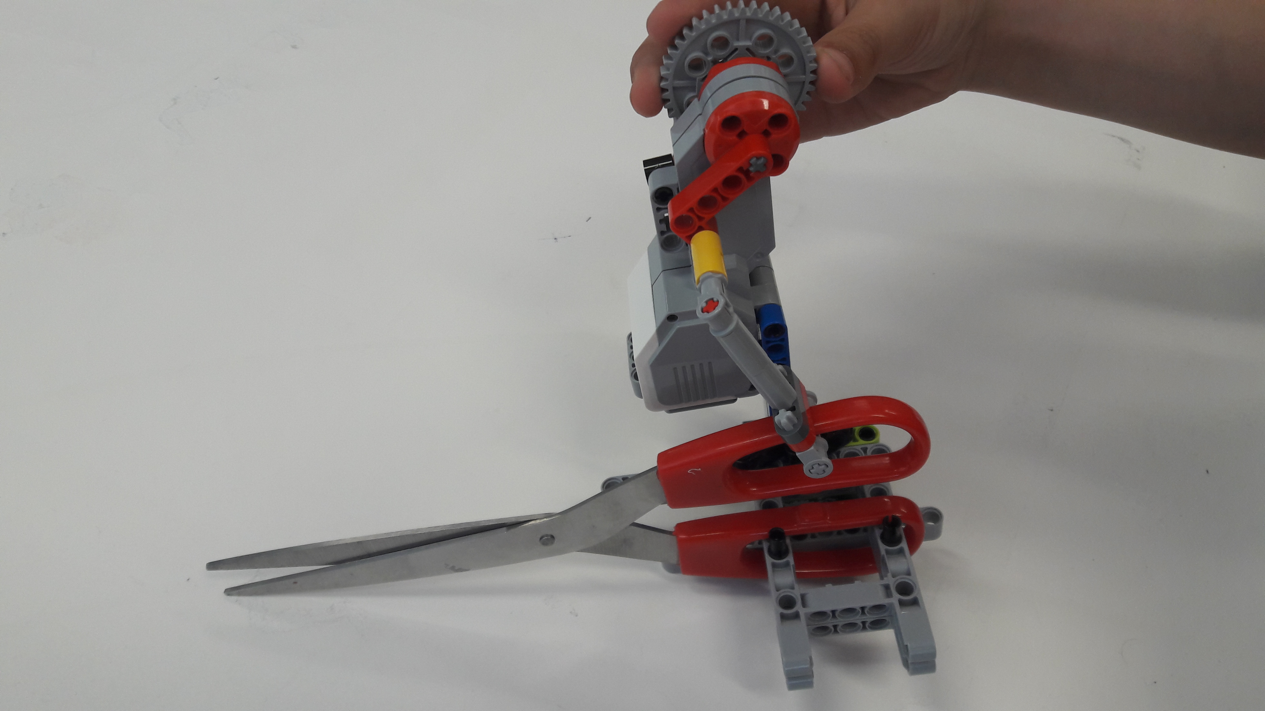 POPIS ROBOTA: pre túto úlohu sme zostrojili pevného robota. Základom je upevnenie nožníc, spodnú časť sme upevnili pomocou šedých obdĺžnikových súčiastok, ktorých šírka nám presne sedela do jedného úchytu nožníc, druhú pohyblivú časť sme prichytili cez ramienko-tiahlo na large motor. Podávacia časť je zostrojená z plochých súčiastok, aby sa zabezpečilo vodorovné položenie papiera, na správne umiestnenie papiera sme doplnili aj bočné lišty na veľkosť A4. Posuv papiera zospodu zabezpečujú 4 kolieska, ktoré sú po dvoch pripojené na dva large motory. Dve vrchné kolieska sú cez ozubený prevod opačne chodiacim prítlakom k dvojici stredných koliesok, ktoré sa nachádzajú bližšie k nožniciam. Najväčší problém sme mali s usmernením obidvoch odstrihnutých A5 častí, preto sme doplnili šikmé plochy, aby bol papier odklápaný.