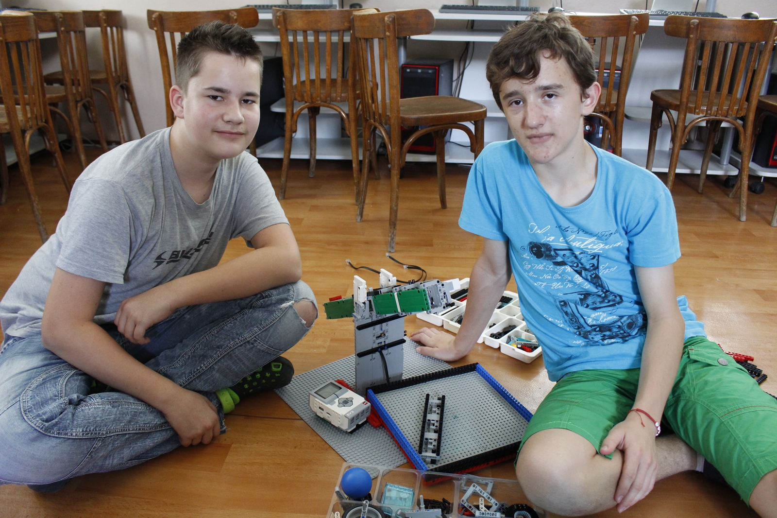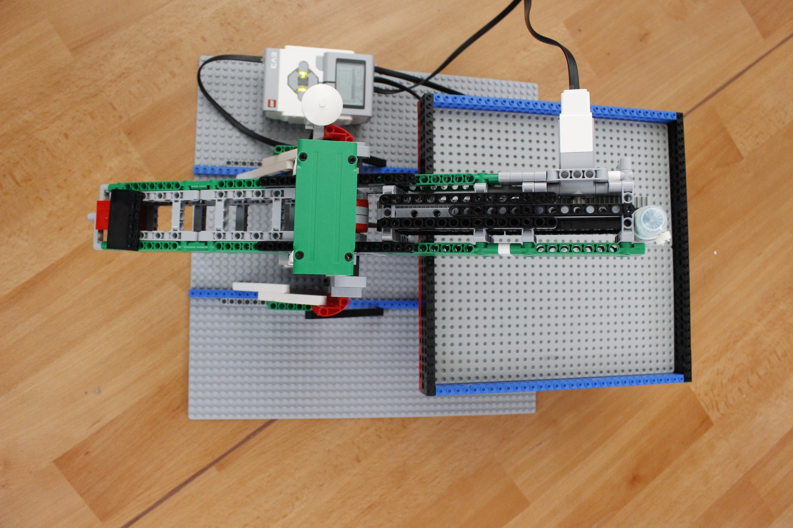 Pri riešení tejto úlohy sme použili dva stredné motory, jeden veľký motor a jeden dotykový snímač. Konštrukcia sa skladá z dvoch častí: