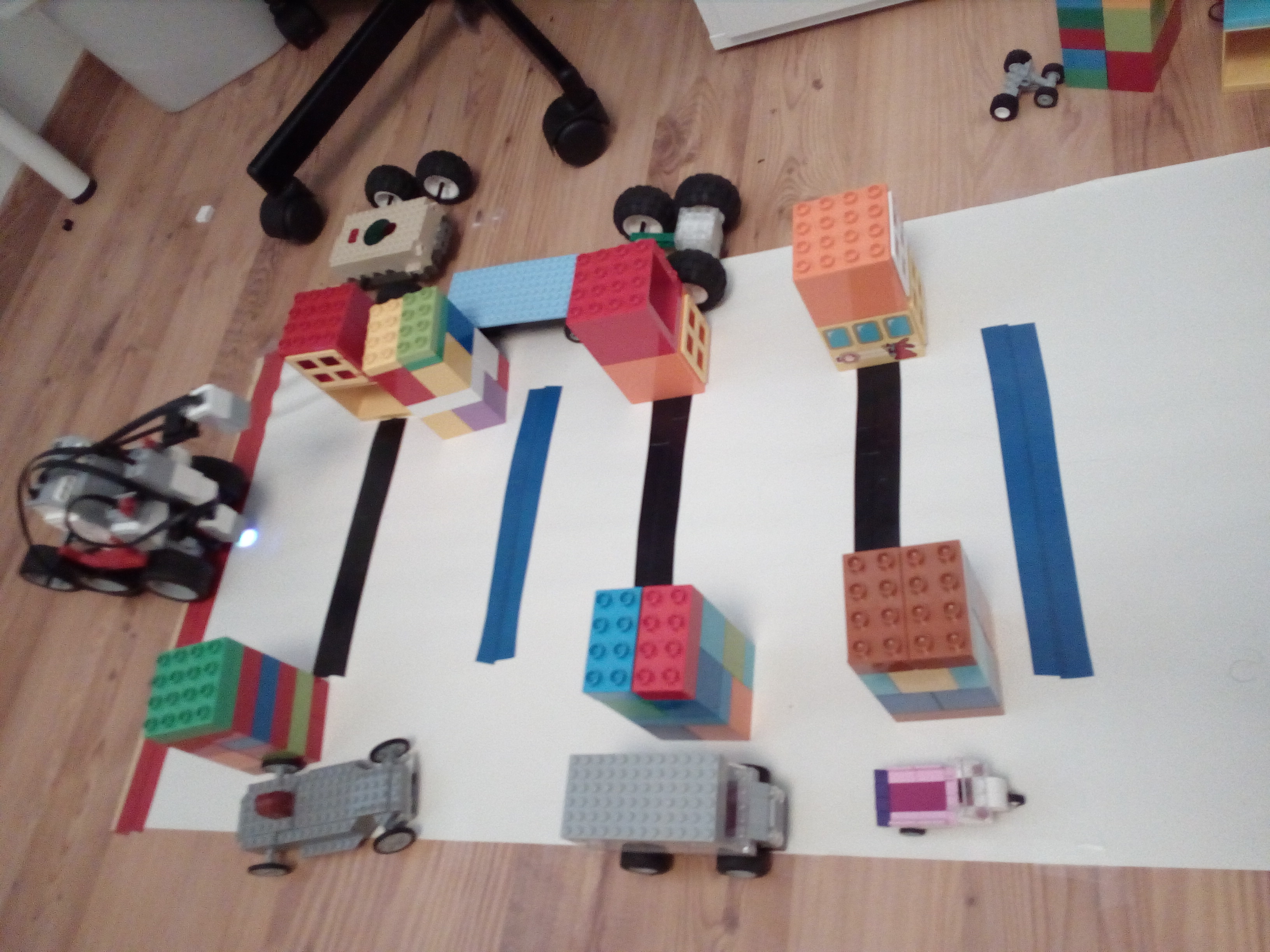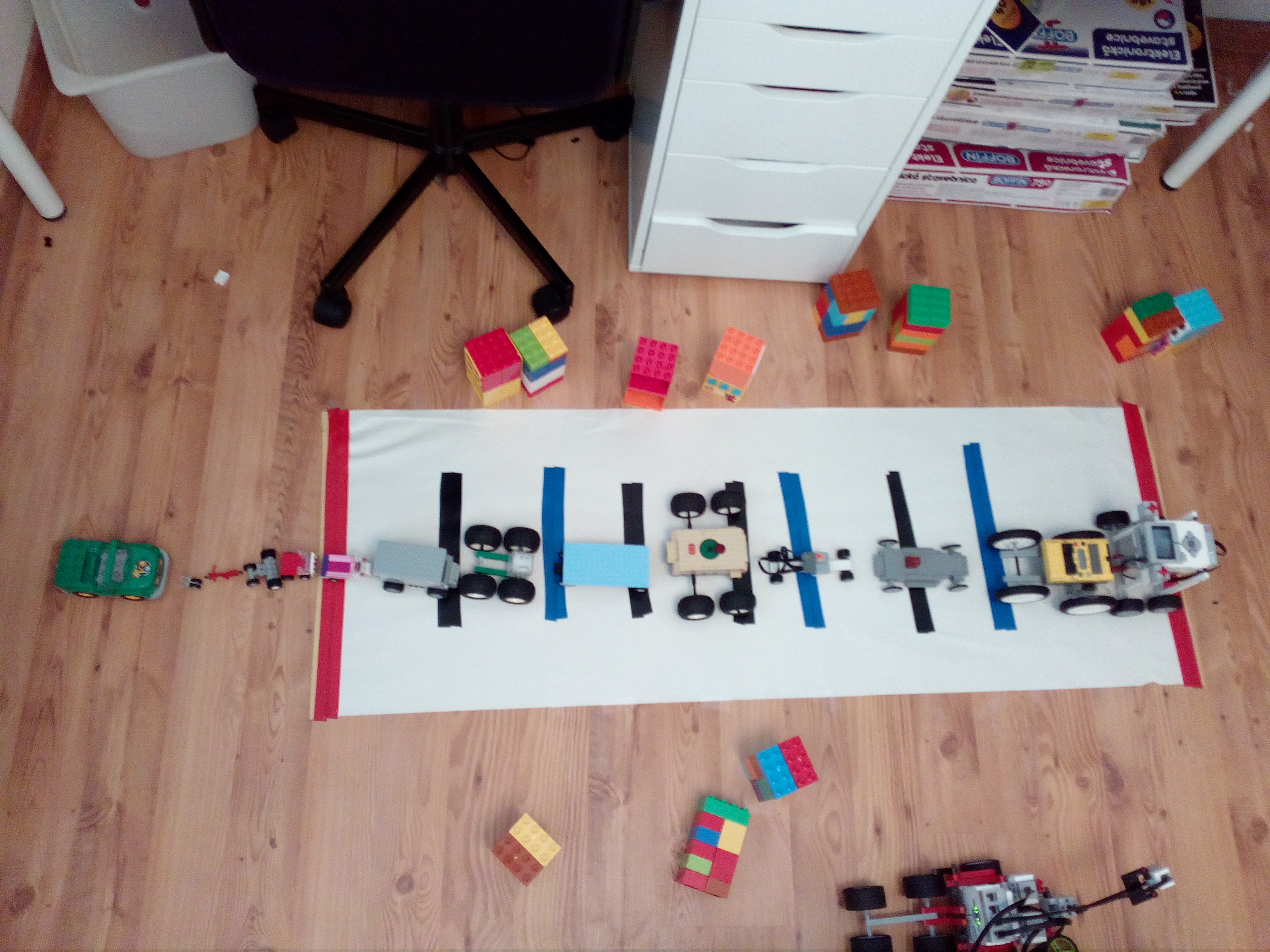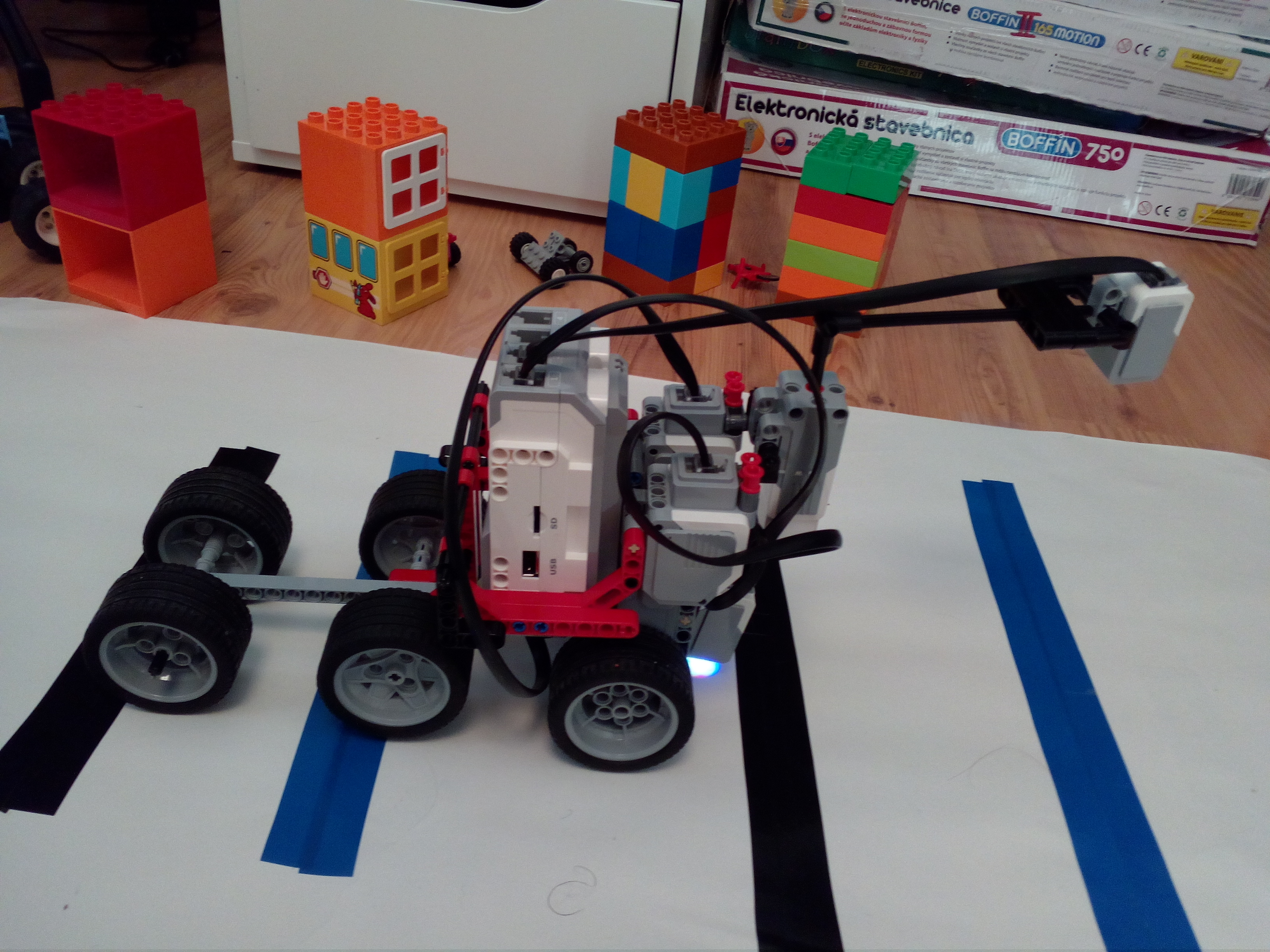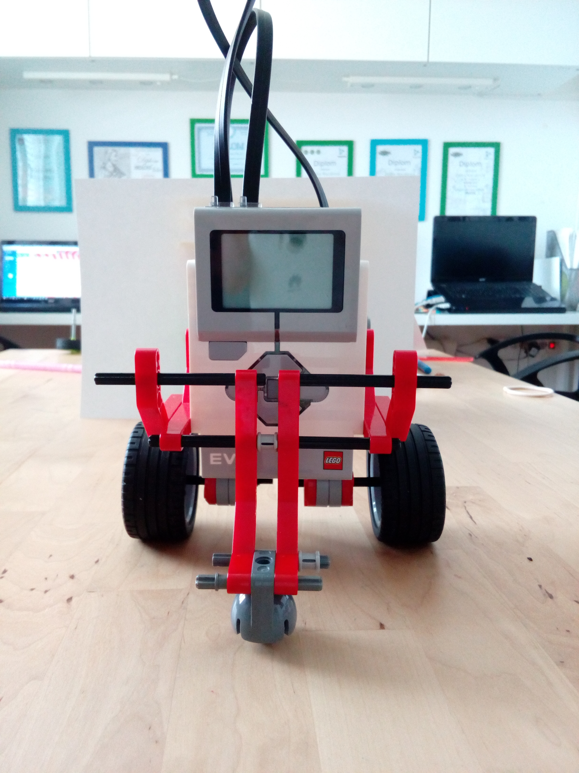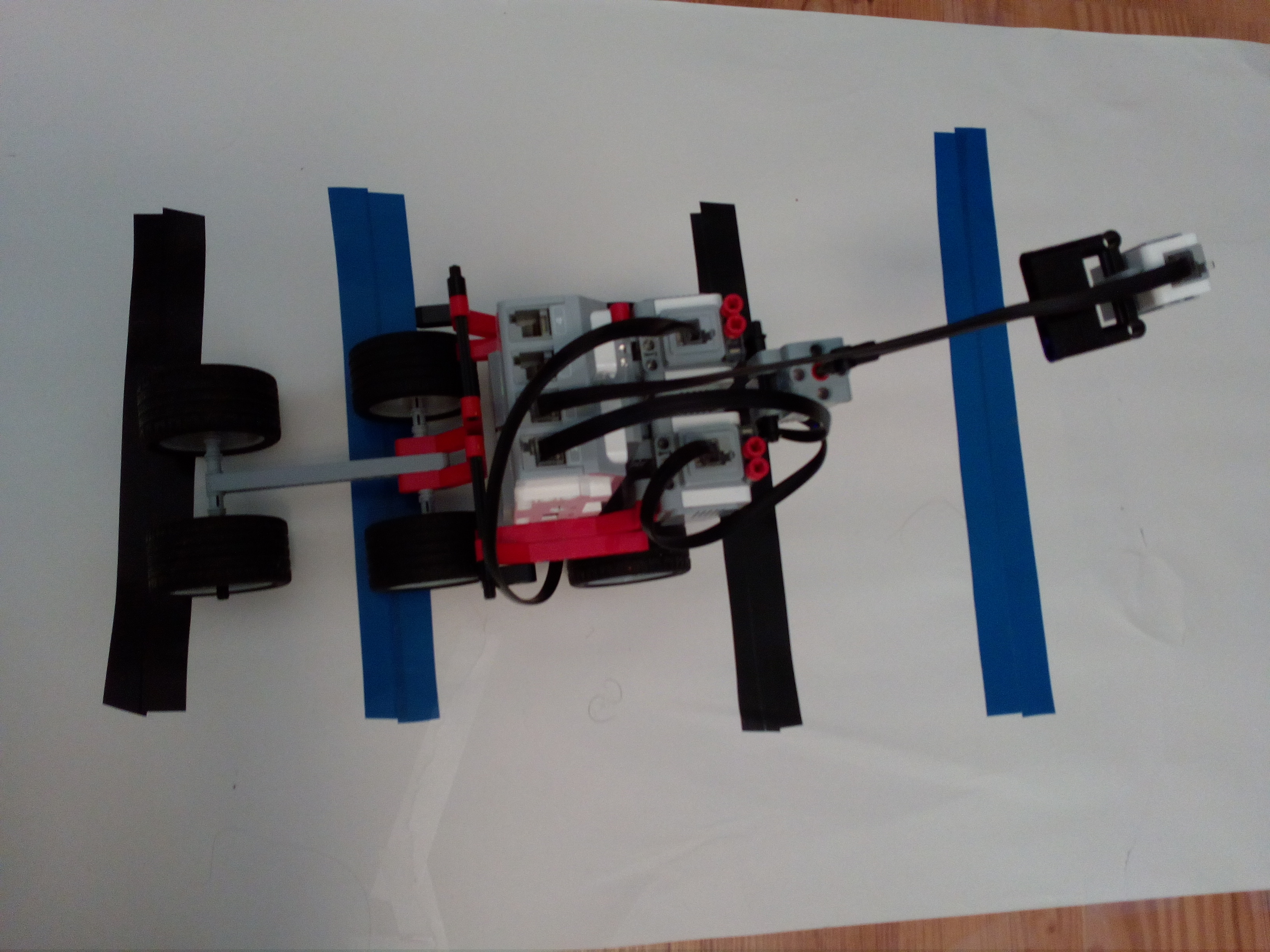 Robot ma dve kolesa pohanane dvomi large motormi a aby nestratil rovnovahu ma za kolesami gulicku aj s drziakom, ktora bola v lego MINDSTORMS EV3 education sete, ktora sa vie lahko otacat spolu s kolesami. Na opacnej strane ma robot prilepenu modru fixku paskou.