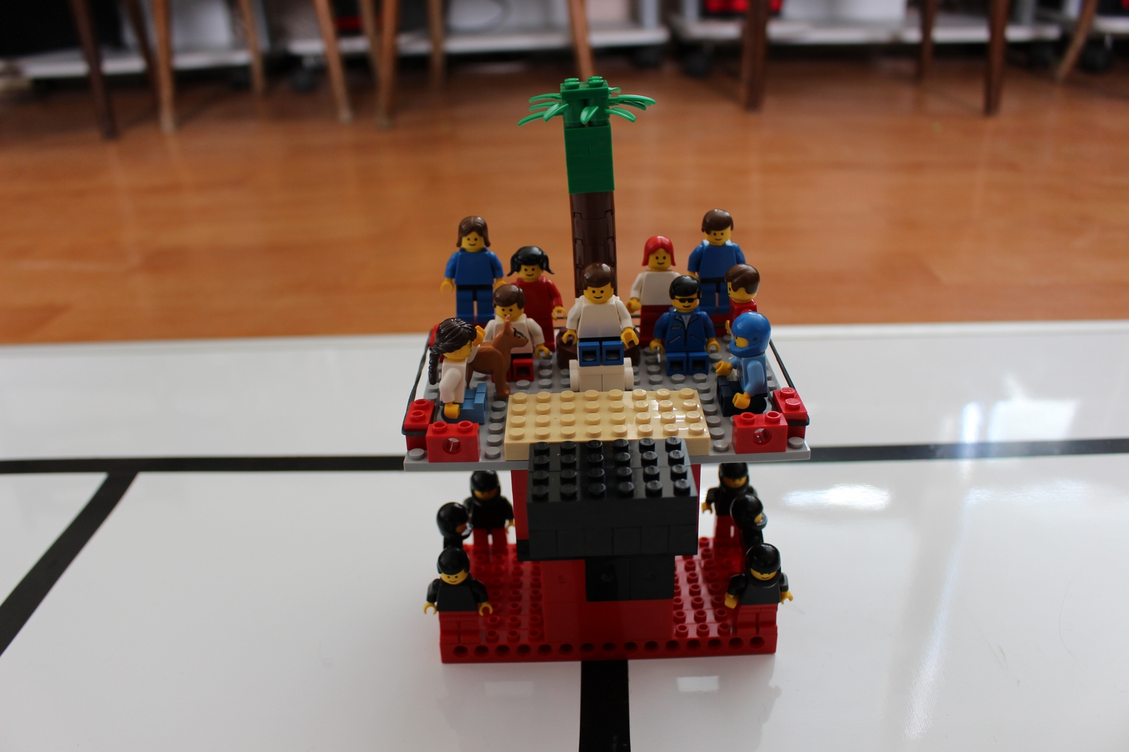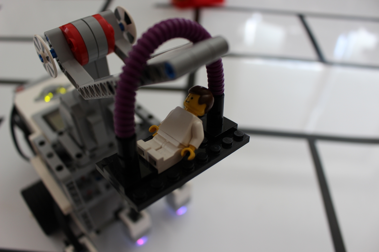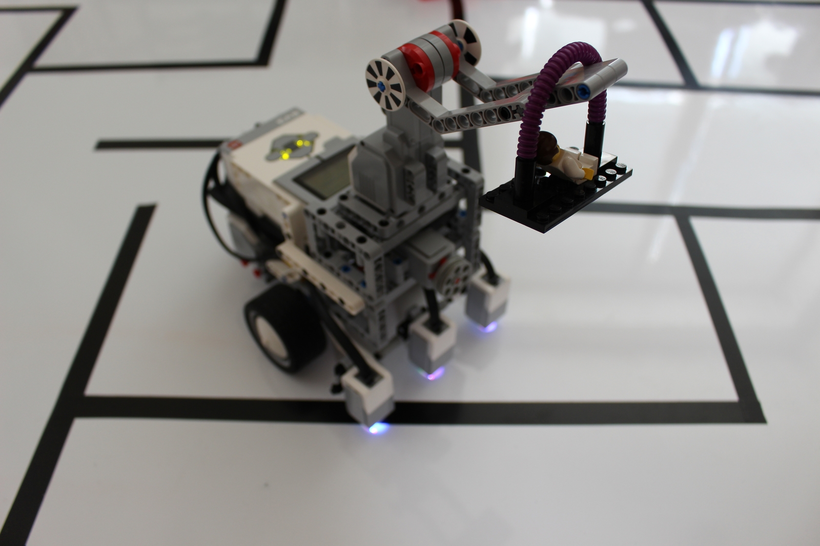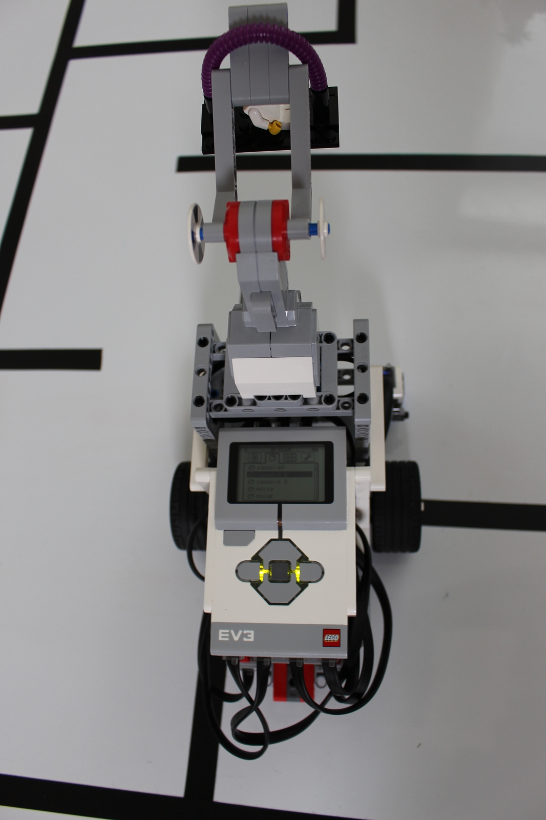 Náš robot má dosť jednoduchú stavbu. Skladá sa z 3 veľkých motorov, 3 optických snímačov a jedného dotykového snímača. Okrem samotného robota sme ešte postavili vežičku, na vrchu ktorej sa stretávajú LEGO - panáčikovia. Bludisko sme spravili nalepením čiernej pásky na bielu tabuľu.