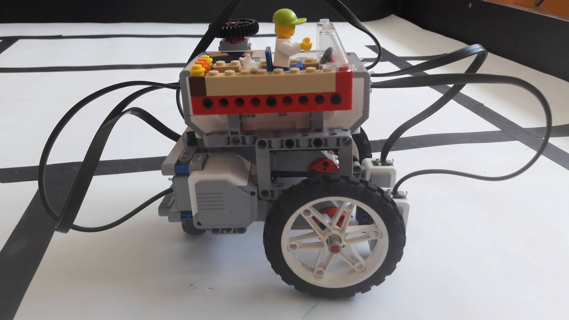 Náš robot Maz3r je poháňaný dvoma large motormy. V prednej časti sú umiestnené 2 colour senzory ktoré slúžia na sledovanie čiar. Na začiatku šípkami nastavíme smery - vľavo - vpravo - vpravo . V programe je to vyriešené príkazmi switch. Požadovaný smer uložíme zapísaním do premennej. (Každý blok premennej sme pomenovali podľa toho, ča sa v nej deje.) Tú si potom program vytiahne na križovatke, kedy obidva senzory zaznamenávajú čiernu farbu. Podľa zadanej hodnoty sa potom robot otočí do požadovaného smeru. Pri programovaní sme tiež použili funkciu my block aby bol program prehľadnejší.