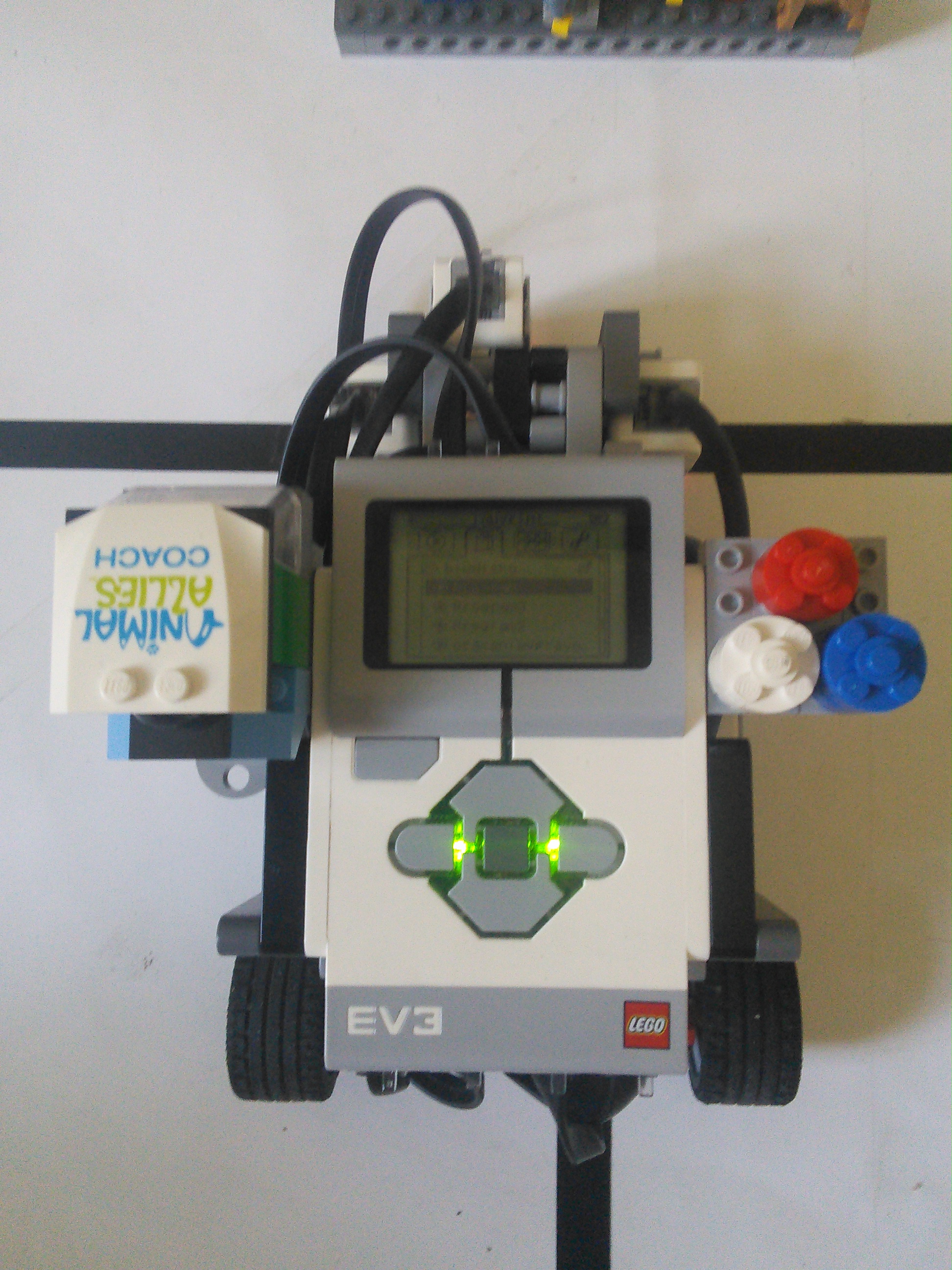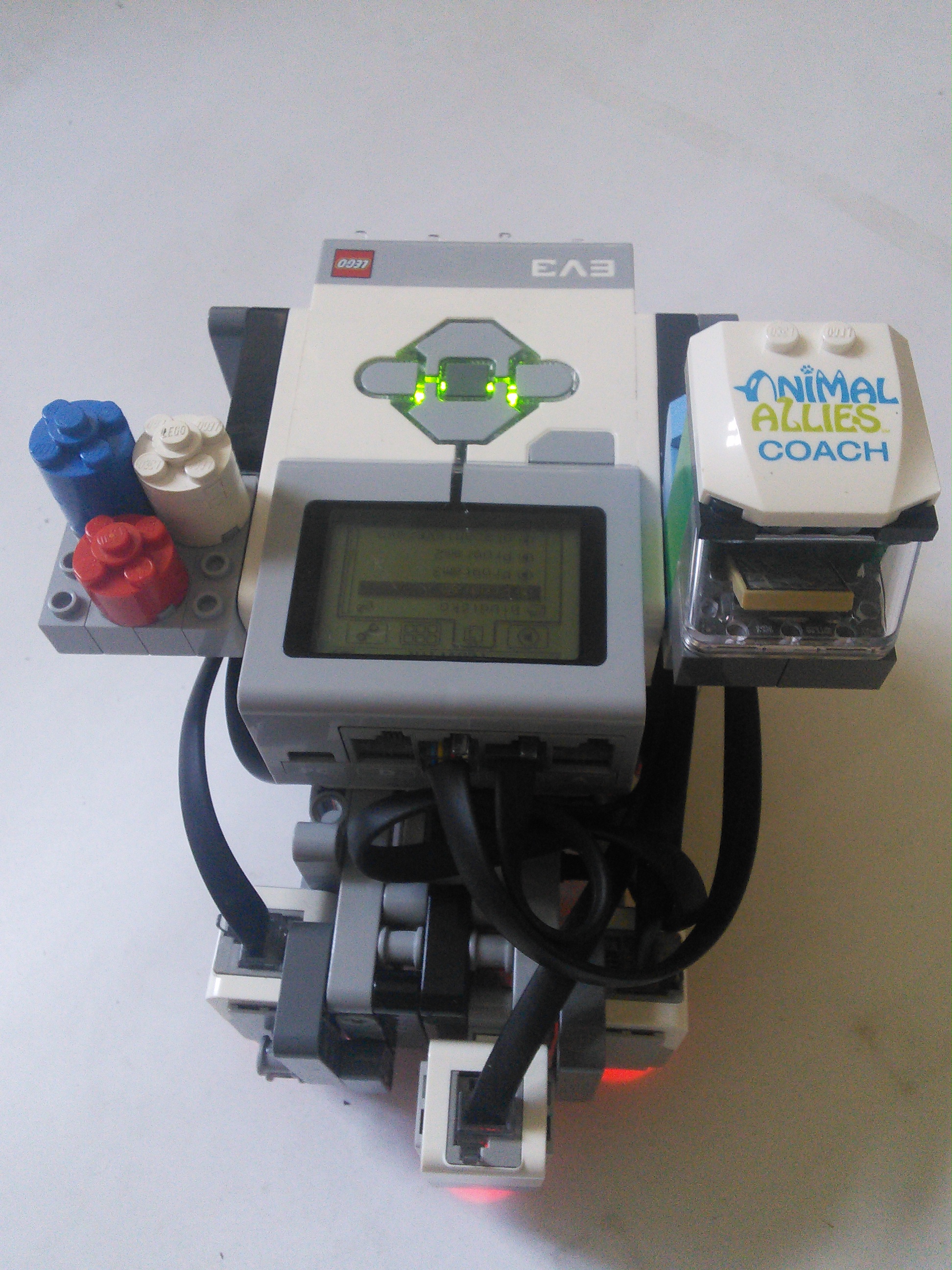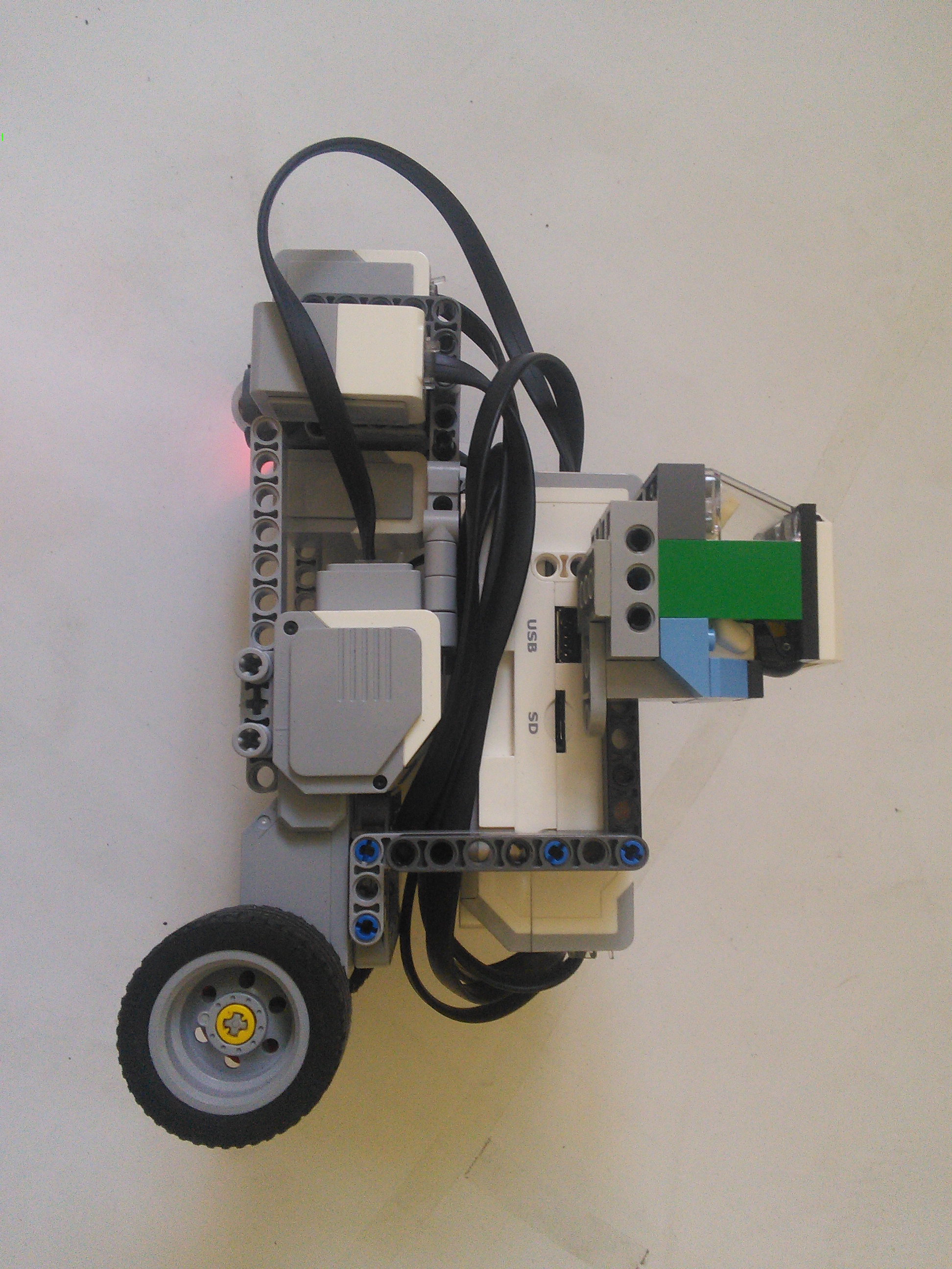 Náš robot používa základnú jednotku EV3 s dvomi motormi a štyrmi farebnými senzormi. Motory používa na pohyb, každý riadi jedno koleso. Jeden senzor slúži na sledovanie čiary a zvyšné tri na zistenie možností ciest na križovatke. Medzi senzormi je umiestnené tretie koleso robota, ktoré umožňuje dobré otáčanie. Na boku robota je kabína pre LEGO panáčika.