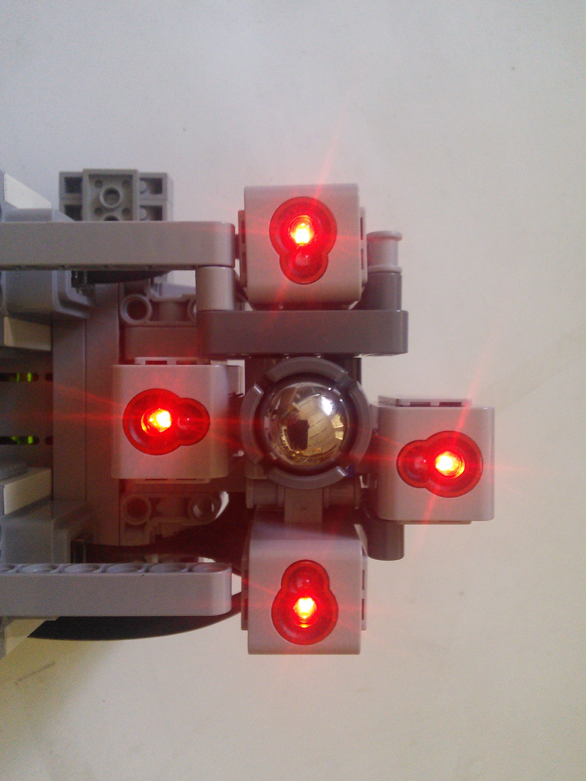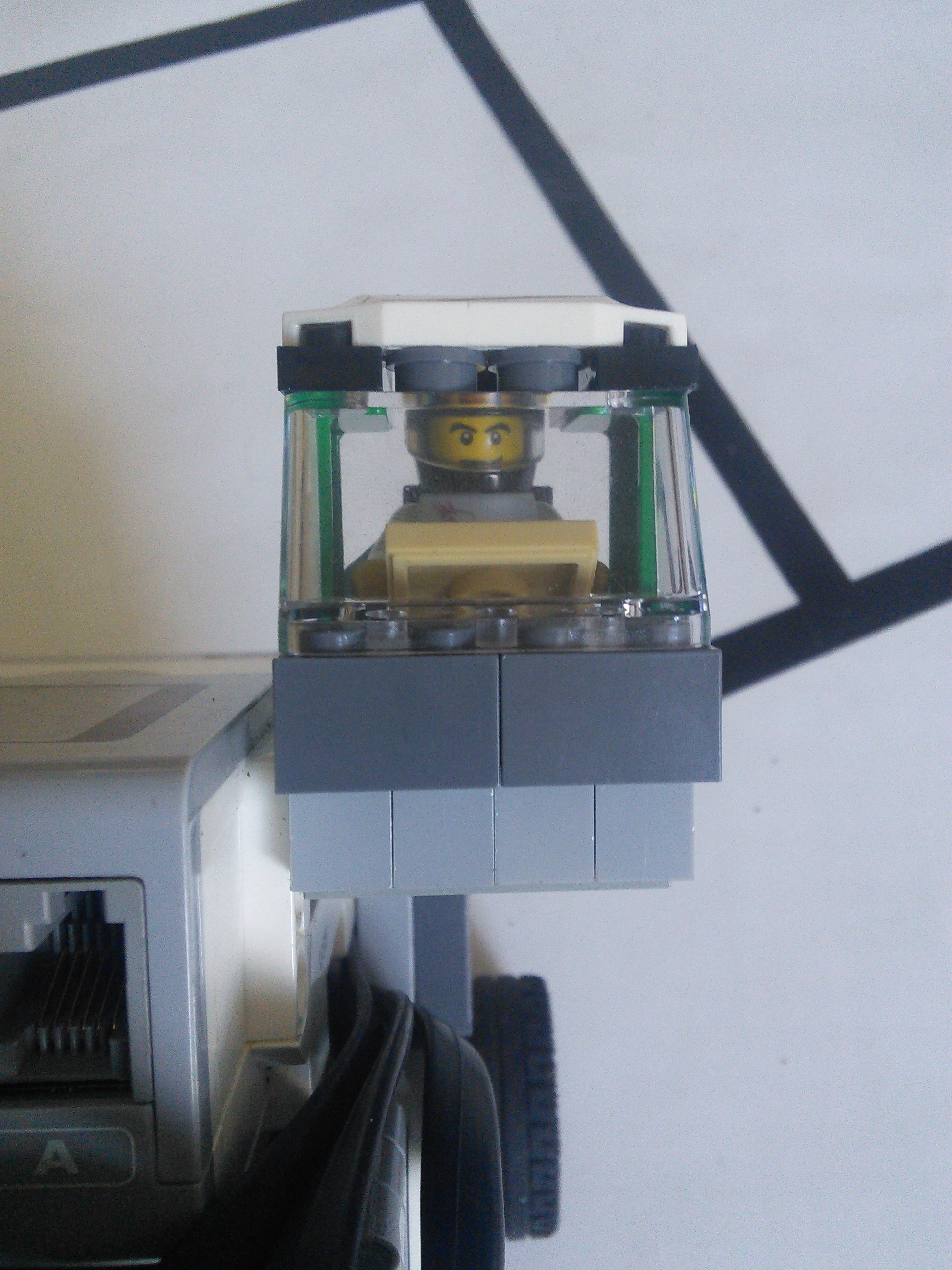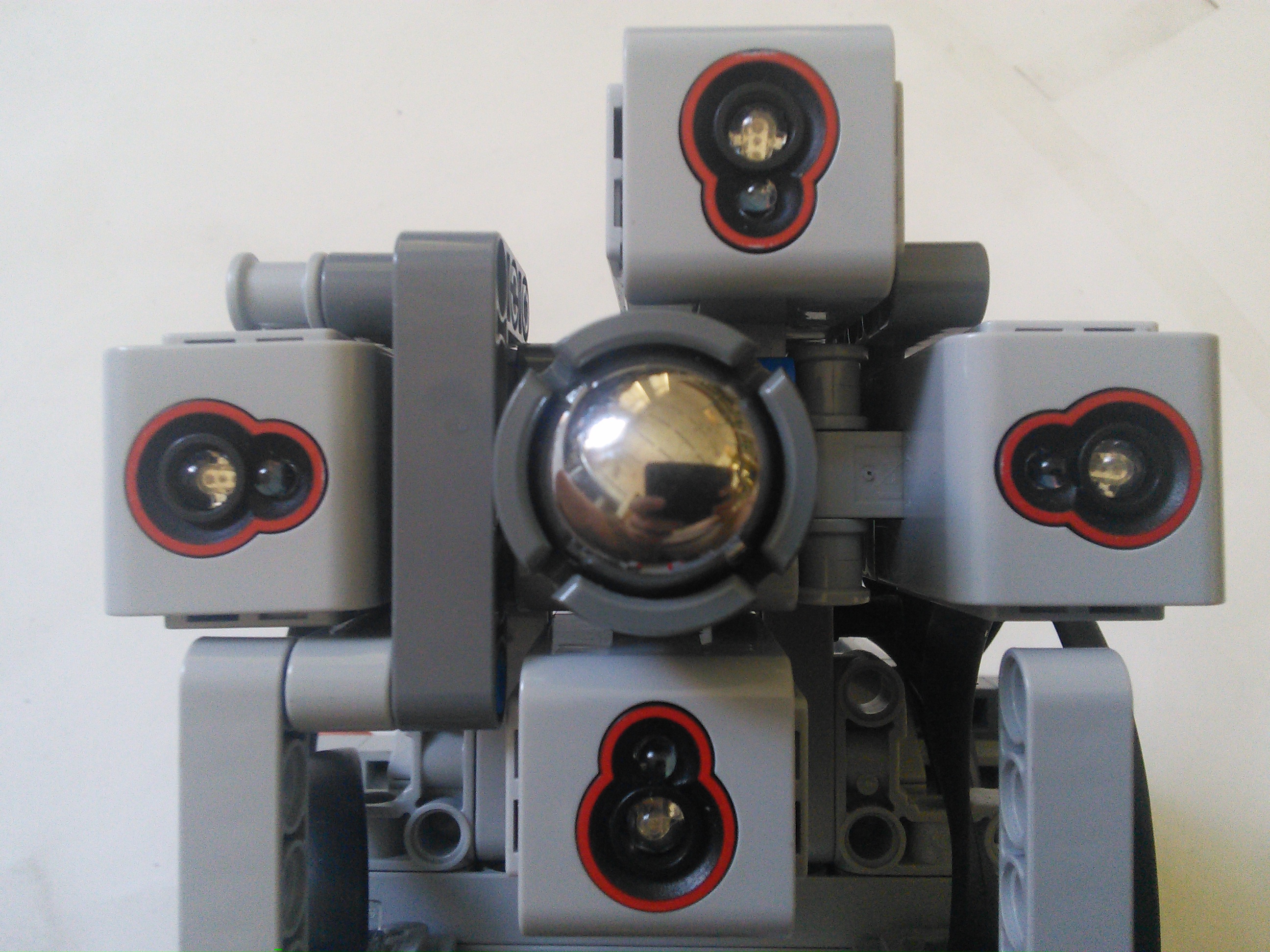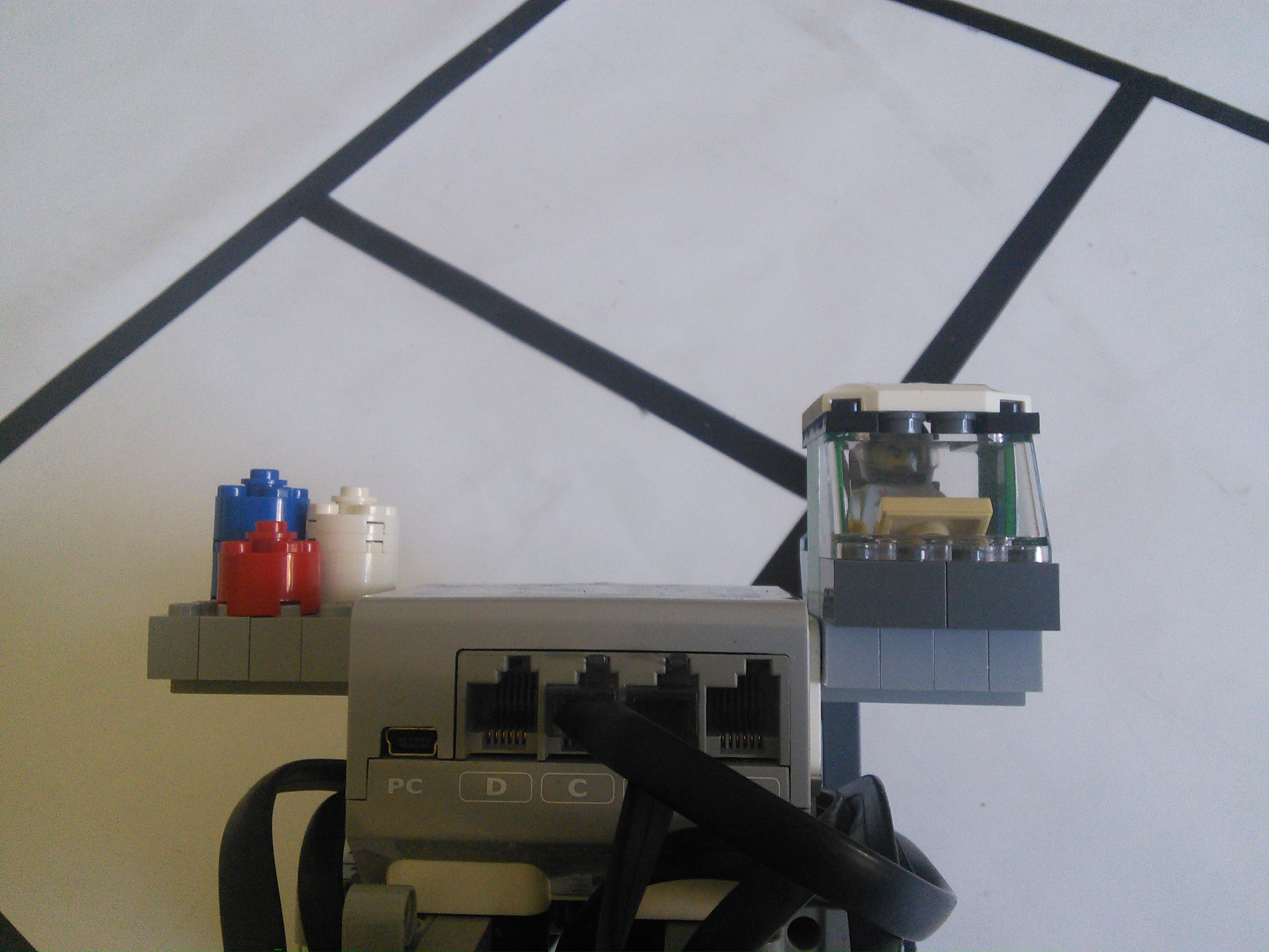 Náš robot používa základnú jednotku EV3 s dvomi motormi a štyrmi farebnými senzormi. Motory používa na pohyb, každý riadi jedno koleso. Jeden senzor slúži na sledovanie čiary a zvyšné tri na zistenie možností ciest na križovatke. Medzi senzormi je umiestnené tretie koleso robota, ktoré umožňuje dobré otáčanie. Na boku robota je kabína pre LEGO panáčika.