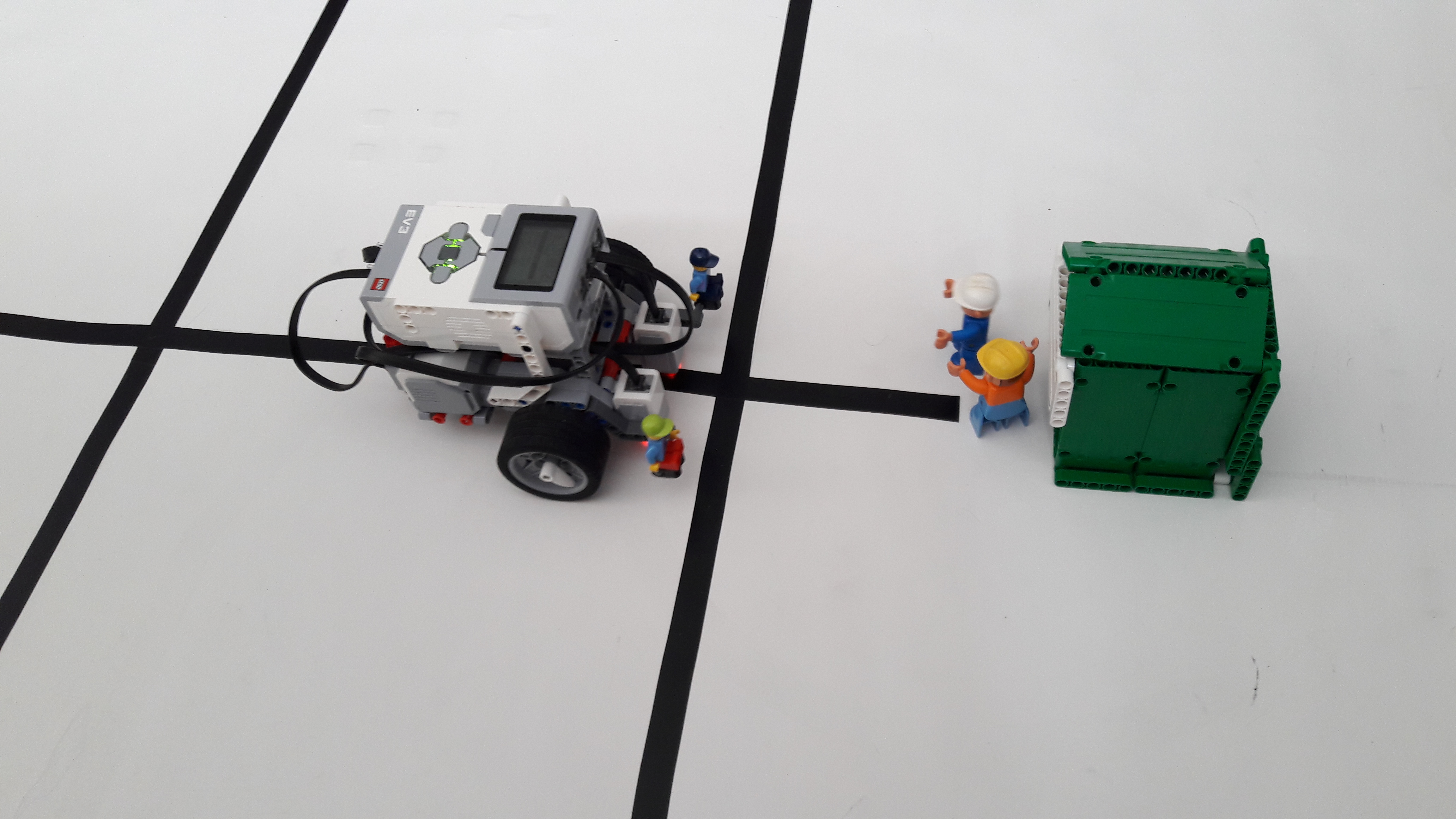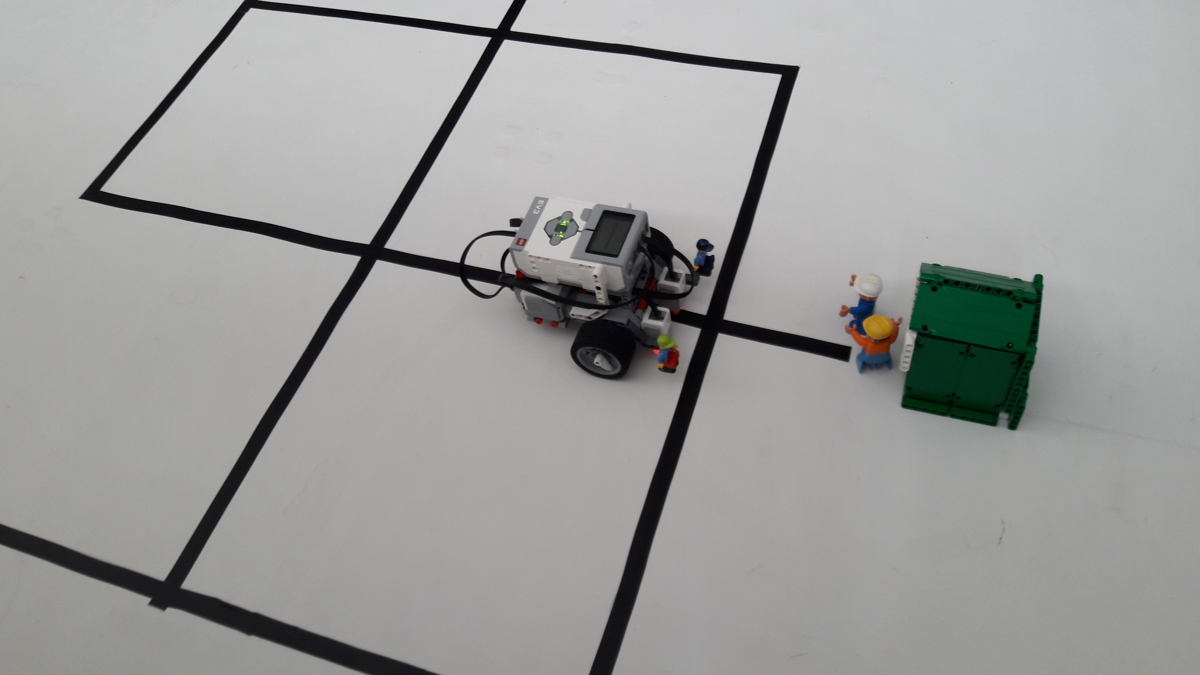 Popis činnosti robota: do kocky cez tlačítka zadáme 4 smery, ktorými sa má robot pohybovať, robot ide po čiare tak, že meriame odraz a robot sa snaží ísť medzi čiernou a bielou. Bludisko sme si pripravili tak, že medzi jednotlivými križovatkami sme si určili takú dĺžku ako sú dve otáčky kolesa.
